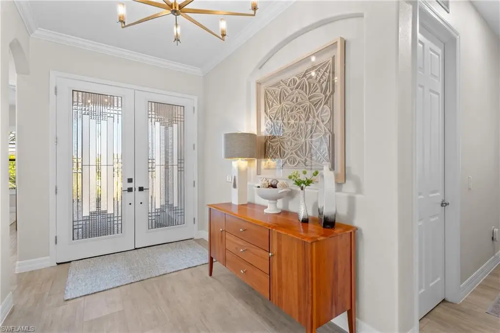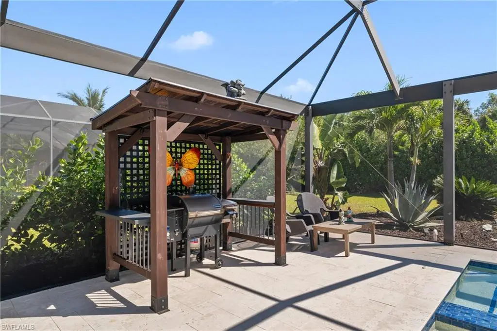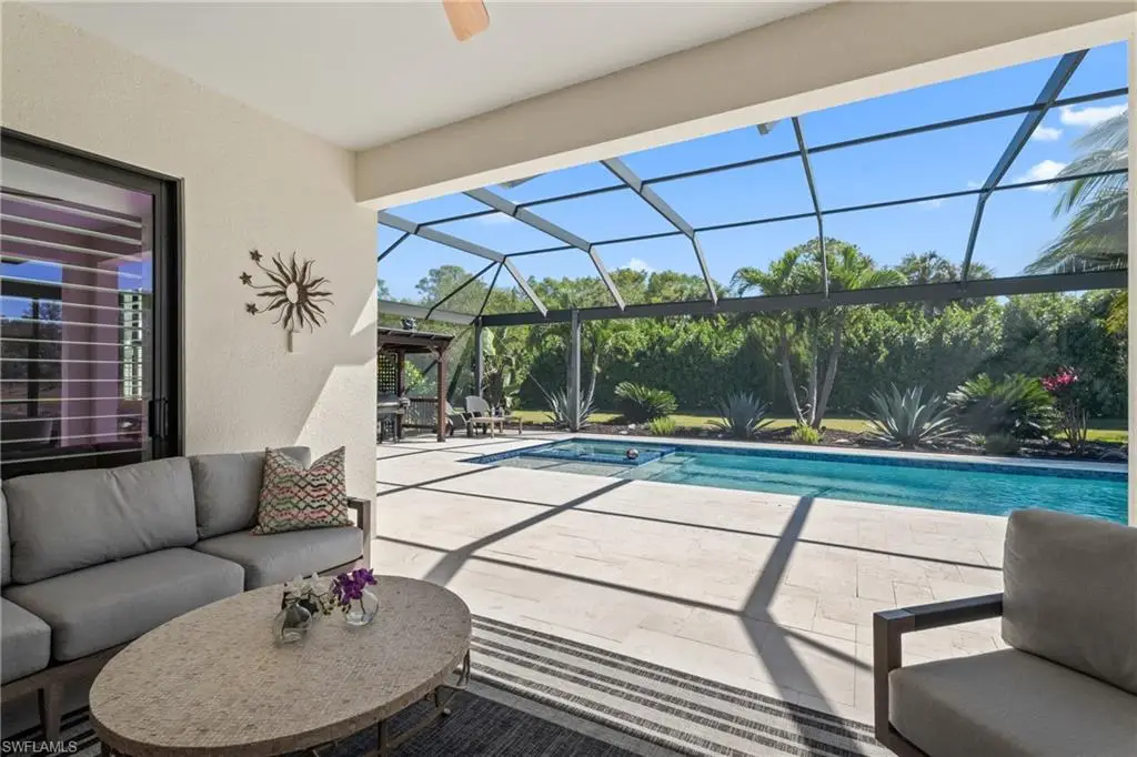 A LOT TO LOVE! Built in 2019, this "Summerville" floorplan home in LaMorada offers both luxury and privacy on a nearly HALF-ACRE lot with privacy galore and lake views. With 3 bedrooms plus den, 3 full baths, and a 3-car garage, it seems like the perfect home for those looking for space and comfort. The oversized paver driveway lined with Royal Palm Trees sets an impressive tone as you approach the property. Inside, the wood-look tile floors can be found throughout and an open Great Room layout creates an inviting, modern feel, while the kitchen is a standout with its oversized island, quartz countertops, and brand-new refrigerator and dishwasher. The master suite seems like a peaceful retreat with its spacious bath featuring his and her vanities, a soaking tub, and walk-in shower, plus direct access to the lanai. The outdoor area, with a custom heated saltwater pool, spa, and sunshelf, is perfect for soaking up the Florida sunshine and enjoying the serene lake views. The upgraded limestone decking and picture window screen cage only enhance the space. The addition of hurricane impact windows and doors provides peace of mind, and the freshly painted interior, new appliances, plantation shutters, and crown molding show that no detail has been overlooked. The pre-plumbed outdoor kitchen is a fantastic feature for anyone who loves to entertain outdoors. As for the LaMorada community, it offers a wealth of amenities, from a resort pool and gym to tennis, pickleball, and bocce ball courts, as well as a restaurant and bar. The location is ideal, with quick access to RSW, Mercato, beaches, and downtown Naples. The low fees of $1,812/quarter, which cover landscaping, irrigation, and club amenities, along with the fact that there's NO CDD, make this property even more appealing.