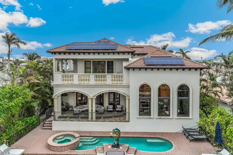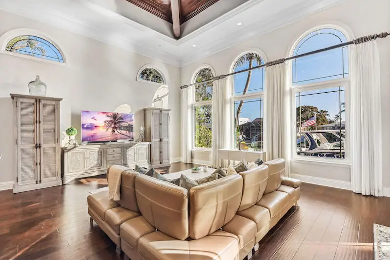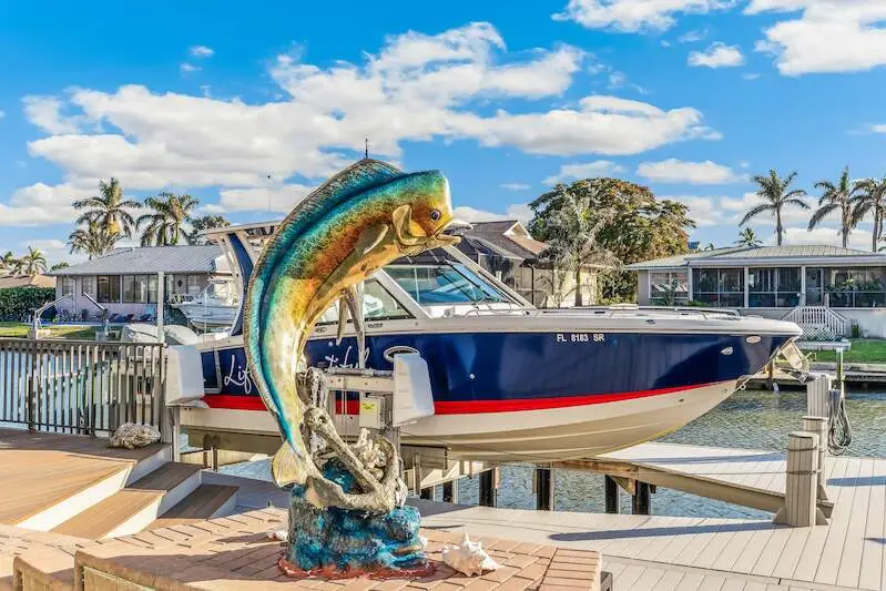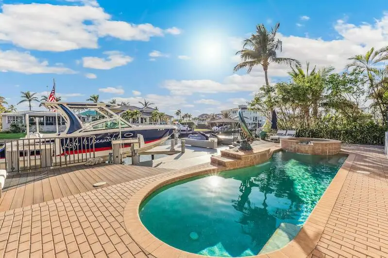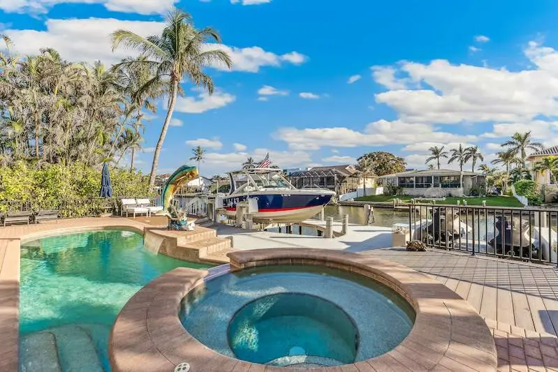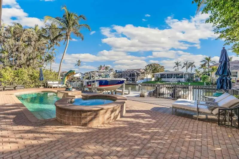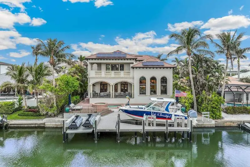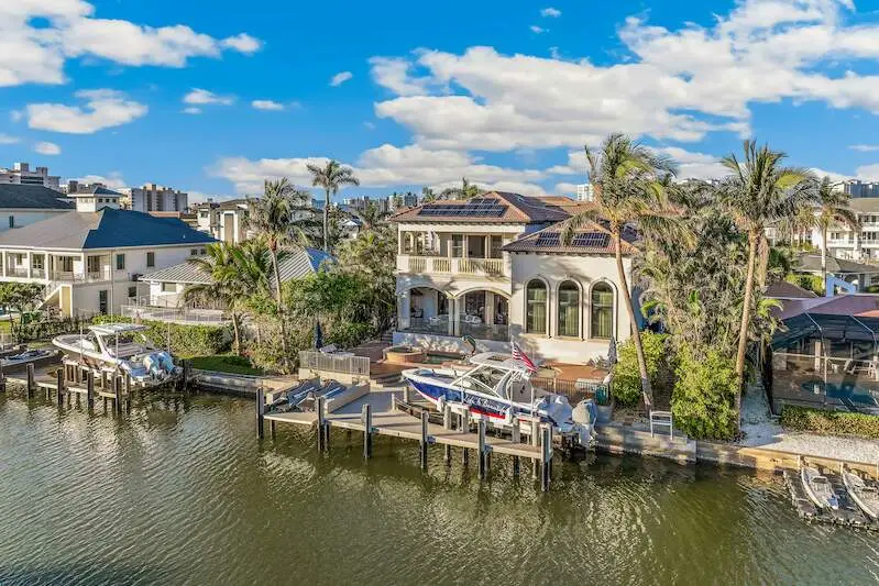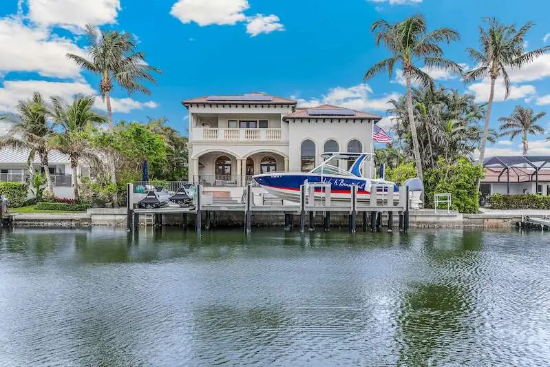 BOATER'S PARADISE! An exceptional opportunity for boating enthusiasts, this waterfront property features a durable fiberglass deck board, a private dock, a seawall, a powerful 28,000-lb boat lift, and a secondary lift perfectly suited for a jet ski. This Southern-exposure residence has been meticulously designed with every detail in mind. Step through the stunning 10-foot arched mahogany front door and into a spacious, welcoming interior with an open floor plan ideal for both relaxing and entertaining. This pristine, custom-designed home is being sold furnished with elegant, high-quality pieces throughout. Showcasing exceptional craftsmanship and attention to detail, the residence offers 4 spacious bedrooms, a private den, and 4.5 bathrooms. The light-filled living and dining areas flow seamlessly into a welcoming family room-perfect for entertaining or relaxing. Notable features include extensive crown molding, a cozy fireplace, soaring ceilings, impact windows and doors, plantation shutters, and an elevator for added convenience. Energy efficiency meets modern living with 27 solar panels, Tesla power banks, spray foam attic insulation, a central vacuum system, and a 3-car attached garage. This beautiful updated residence also includes a good-sized den with custom built-in shelving- ideal for a home office or study. The gourmet kitchen is a chef's dream. It is equipped with a six-burner gas cooktop, warming drawer, Sub-Zero refrigerator, wine cooler, stainless steel appliances, a walk-in pantry, breakfast bar, and stunning granite countertops. The primary suite is a true retreat, accessed through double doors and offering a private seating area, two spacious walk-in California closets, and a private balcony for quiet moments outdoors. The luxurious en-suite bathroom features dual vanities, a Jacuzzi tub, a bidet, and a separate large walk-in shower. Each guest bedroom includes its private bathroom, with one conveniently located on the first floor-perfect for hosting guests. The outdoor space is just as impressive as the interior, featuring a spacious lanai, a fully equipped outdoor kitchen, and a heated pool and spa- perfect for entertaining family and friends or enjoying peaceful, private evenings. With the Gulf of Mexico just minutes away by boat and the Beach within walking distance, this home offers an unbeatable location. Enjoy the best of Naples waterfront living in the highly sought-after Vanderbilt / Conners area. Nearby conveniences include Whole Foods Market, Marcato Shopping Center, Waterside Shops, the Philharmonic Center for the Arts, and Downtown Naples-all just a short drive away. This is more than a home-it's a lifestyle you will be proud to call your home!