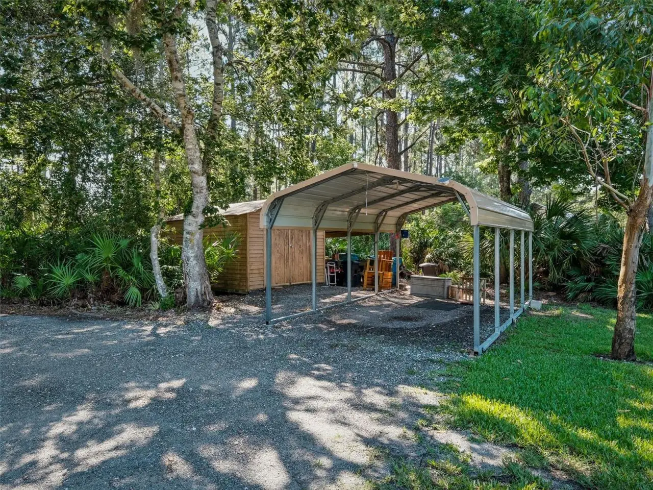Discover country living with convenience on this 2.5-acre gated property just minutes from shopping, dining, golf, 7 miles to the beach. The 4-bedroom, 2.5-bath main home features an open layout, screened lanai, and sparkling pool-perfect for entertaining or relaxing. Main home features tile flooring throughout, wood burning fireplace in living room and electric fireplace in the family room, vaulted ceilings w/ skylights and metal roofing plus a game room with bar but potential to convert back to 2 car garage. Large screened lanai with pool feature half bath, firepit and grill area, plus bar and room for a spa. A detached garage has been converted into a comfortable in-law residence complete with kitchenette, bedroom, bathroom, and storage. Additional highlights include an RV carport, 1-stall barn, and fenced area ready for horses. Enjoy privacy, space, and versatility-all within easy reach of town amenities.