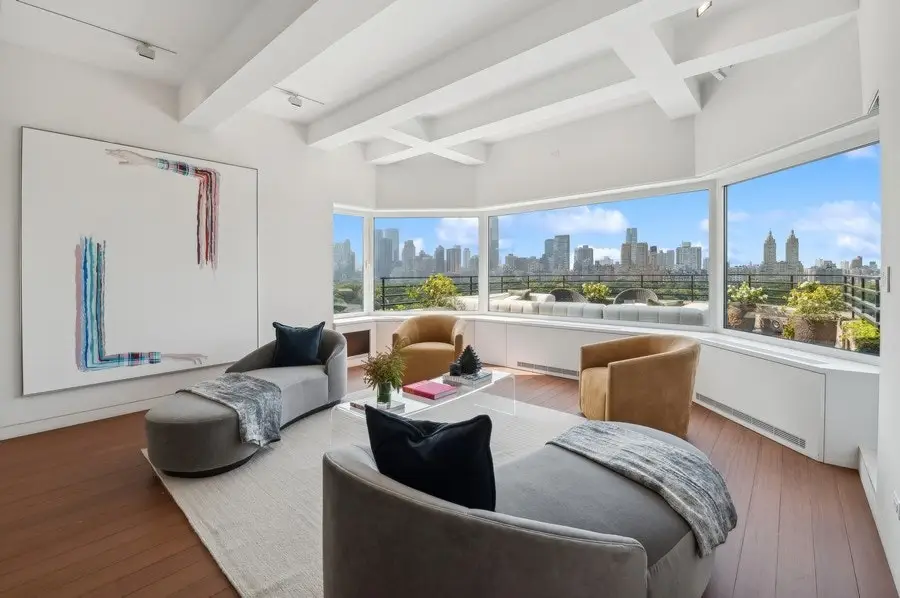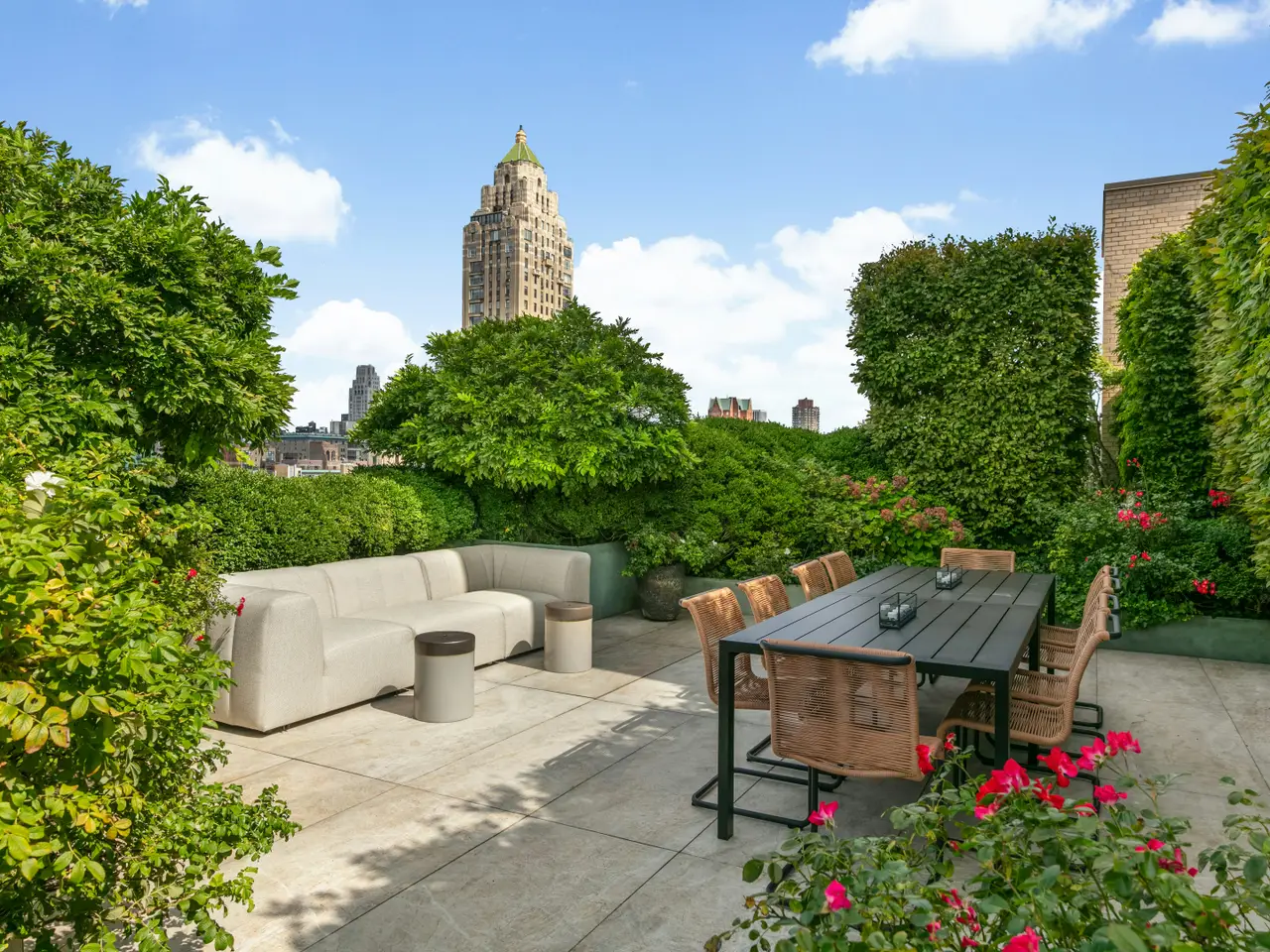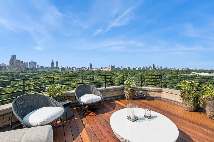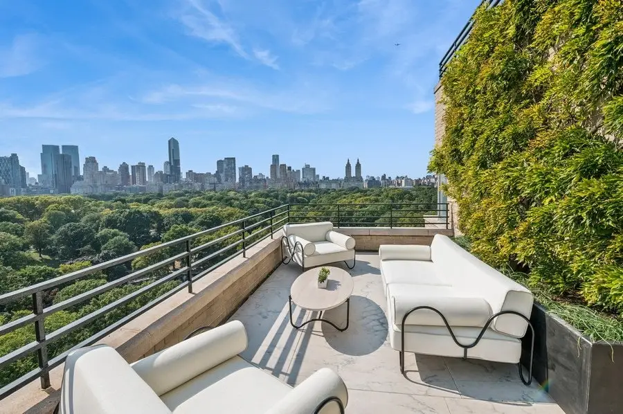 Perched atop 936 Fifth Avenue, this recently updated three-bedroom penthouse is a true gem, offering unparalleled Central Park vistas and an abundance of natural light. The fully renovated, duplex spans 3,800 square feet of exquisite interior space, complemented by over 2,400 square feet of private outdoor terraces. A private elevator opens directly onto the 18th floor, where you're greeted by a stunning marble-clad gallery with double-height ceilings and a sweeping marble staircase. The residence features a series of lush, landscaped wrap-around terraces that enhance every principal room with green, panoramic views. The grand living room is a highlight, boasting a bay window with sweeping westward views over Central Park and expansive northern and southern vistas. The elegant formal dining room impresses with its parquet de Versailles flooring and exquisite boisserie. A floor to ceiling corner window was just added in a recent renovation, offering open Eastern exposures. Adjacent to this is a sun-drenched breakfast room with heated floors, and folding glass doors opening to the Southern terrace. The entire first floor boasts soaring 10'+ ceilings throughout. The chef's kitchen is a culinary dream, outfitted with custom-designed Bulthaup cabinetry, a large Wolf stove, Miele ovens, and a Sub-Zero refrigerator, all framed by open, airy views. A stylish powder room completes the public spaces. The main bedroom suite, located on the lower floor, offers stunning Central Park views and direct terrace access. Its spacious en-suite bathroom features heated marble floors, double sinks, a large soaking tub, and a shower, all finished in luxurious onyx. Additionally, there are two generously sized bedrooms on the first floor, each with en-suite bathrooms, ample closet space, large windows, and terrace access. Upstairs, the library/media room is a standout feature, equipped with a surround sound system and blackout shades. It offers another bay window and three additional large windows with single-pane fenestration. This level also provides access to a west- and north-facing landscaped terrace, complete with a grill, refrigerator, and ice maker, ideal for al-fresco dining. The upper floor includes a staff room, a half bath, and a sizable outdoor laundry room. The apartment is enhanced with five-zone central air conditioning, new windows and doors with insulated glass for soundproofing and weather resistance, a Crestron/Lutron system, as well as waterproofing and irrigation systems for the terraces. An ADT security system is also installed, and the apartment is wired throughout. Built in 1955, 936 Fifth Avenue is situated at the southeast corner of 75th Street and Fifth Avenue. The building provides white-glove service, including a full-time doorman, elevator attendant, resident manager, fitness center, and laundry room. Up to 50% financing is permitted, with a 4% flip tax payable by the buyer.