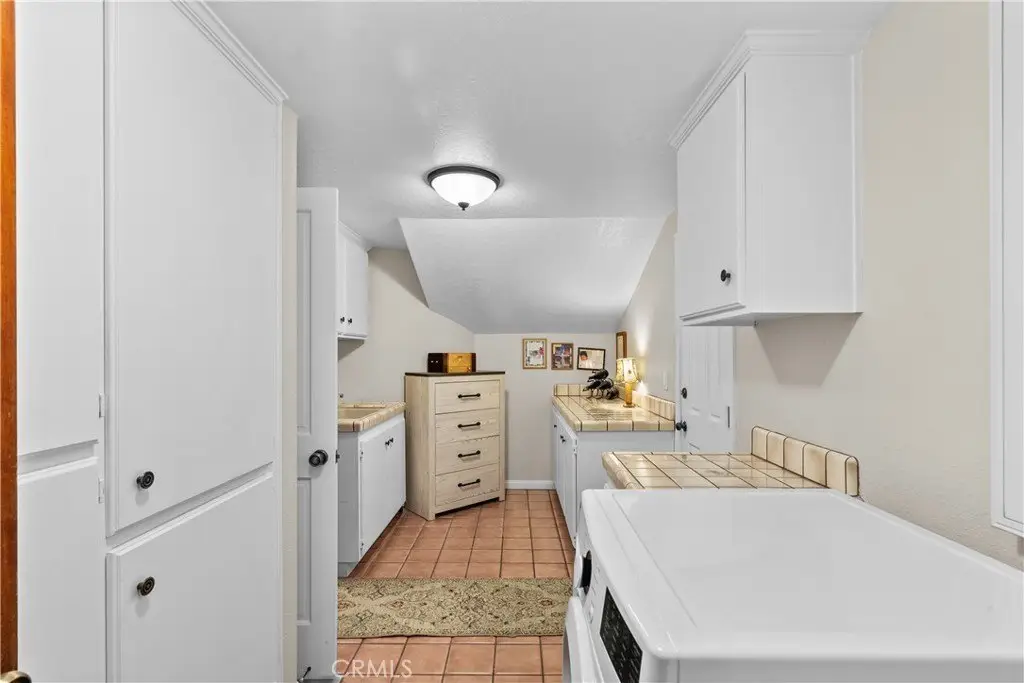 Chef's kitchen with porcelain tiled countertops and indoor grill
