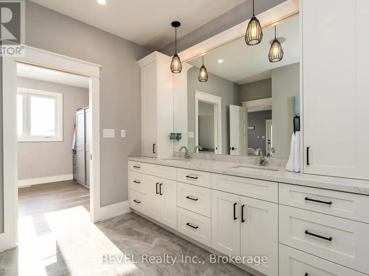 Welcome to this stunning 2,945 sq. ft. bungalow, expertly crafted with a blend of stone and Hardie board exterior. From the moment you step inside, you'll be greeted by the expansive open concept living area, featuring soaring 10-ft ceilings and no carpets. The heart of the home is the gourmet kitchen, boasting Quartz countertops throughout, a large island with bar stool seating, stainless steel appliances, abundant counter and cupboard space, and a spacious pantry. The main floor master bedroom wing is a true retreat, complete with a coffered ceiling, a generous walk-in closet, and a luxurious 5-piece ensuite. Enjoy private access to the rear yard from your master bedroom. The main floor also offers a versatile office (or potential fourth bedroom), two additional bedrooms with walk-in closetsone with a private 4-piece ensuite and the other with ensuite privilege and a 2-piece powder room off the foyer. The mudroom off the garage features a laundry area and barn-style roller door. The fully finished basement includes a large rec room with a kitchenette, an additional bedroom, and a 3-piece bathroom with a spacious glass shower. With 9-ft ceilings and a heated slab, the basement is as comfortable as it is functional. Outdoor living is equally impressive, with a covered rear patio complete with TV hookup, BBQ line, and pull-down privacy screens. Relax in the inground heated saltwater pool, unwind in the hot tub, or enjoy the fully fenced, landscaped yard with a stone wall surround. The property, just under an acre, is surrounded by picturesque vineyards and fruit farms. Additional features include an insulated 2-car garage with hot water hookup, city water, an interior and exterior wired-in speaker system, a security system, and central vac. This exquisite home offers the perfect blend of luxury, comfort, and tranquility. (id:7434)