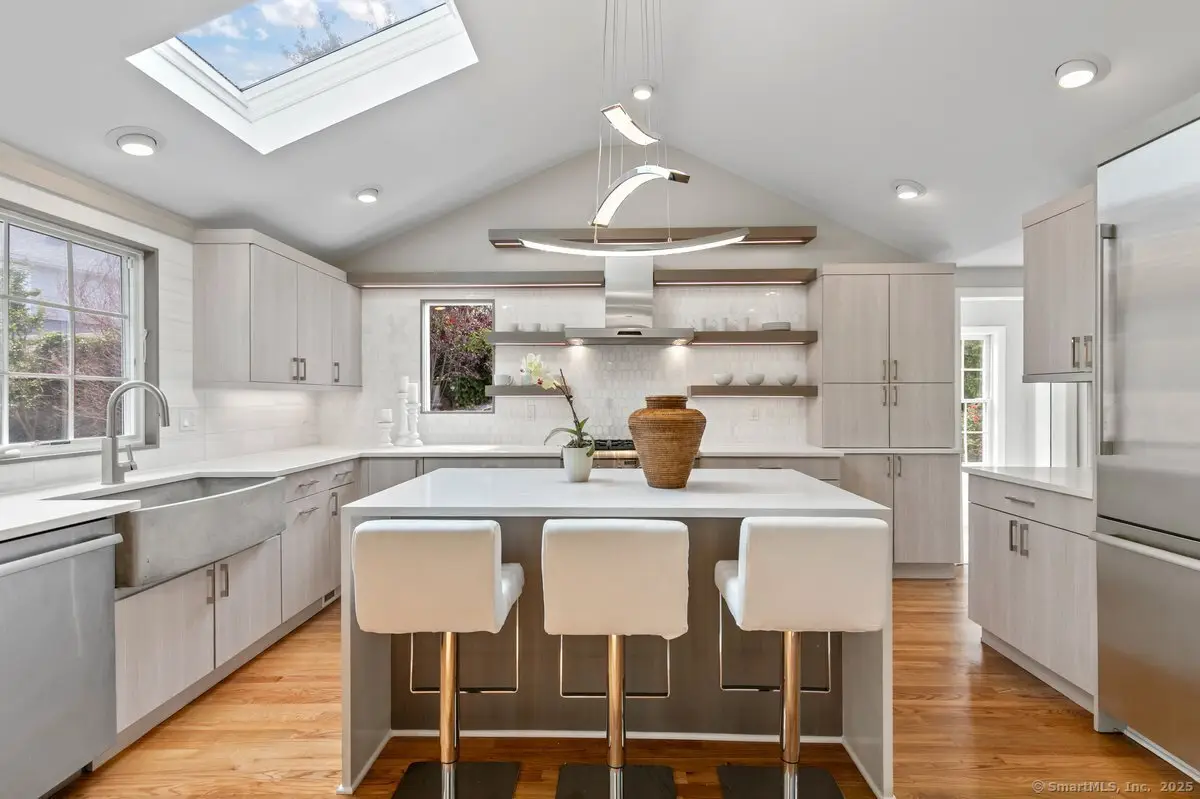 A coastal Connecticut entertainer's dream, this newly updated home is located on a quiet cul-de-sac in the highly desirable Gregory Point neighborhood. With deeded beach access just steps away, you can enjoy stunning sunsets from the sand, your kayak, or stand-up paddleboard. The flexible and open floor plan is designed for both everyday living and seamless entertaining, featuring a two-story fireplace crafted with masterful detail and a custom kitchen designed by award-winning Karen Berkmeyer, as seen in New England Home Magazine. Coastal-curated landscaping and a meticulously maintained exterior enhance the home's charm, while the expansive third-floor bonus space, with water views and a private balcony, offers the perfect spot to relax or host. A first-floor primary suite is also a possibility thanks to the versatile layout. From thoughtful design to exceptional craftsmanship, this Gold Coast gem will wow you at every turn.