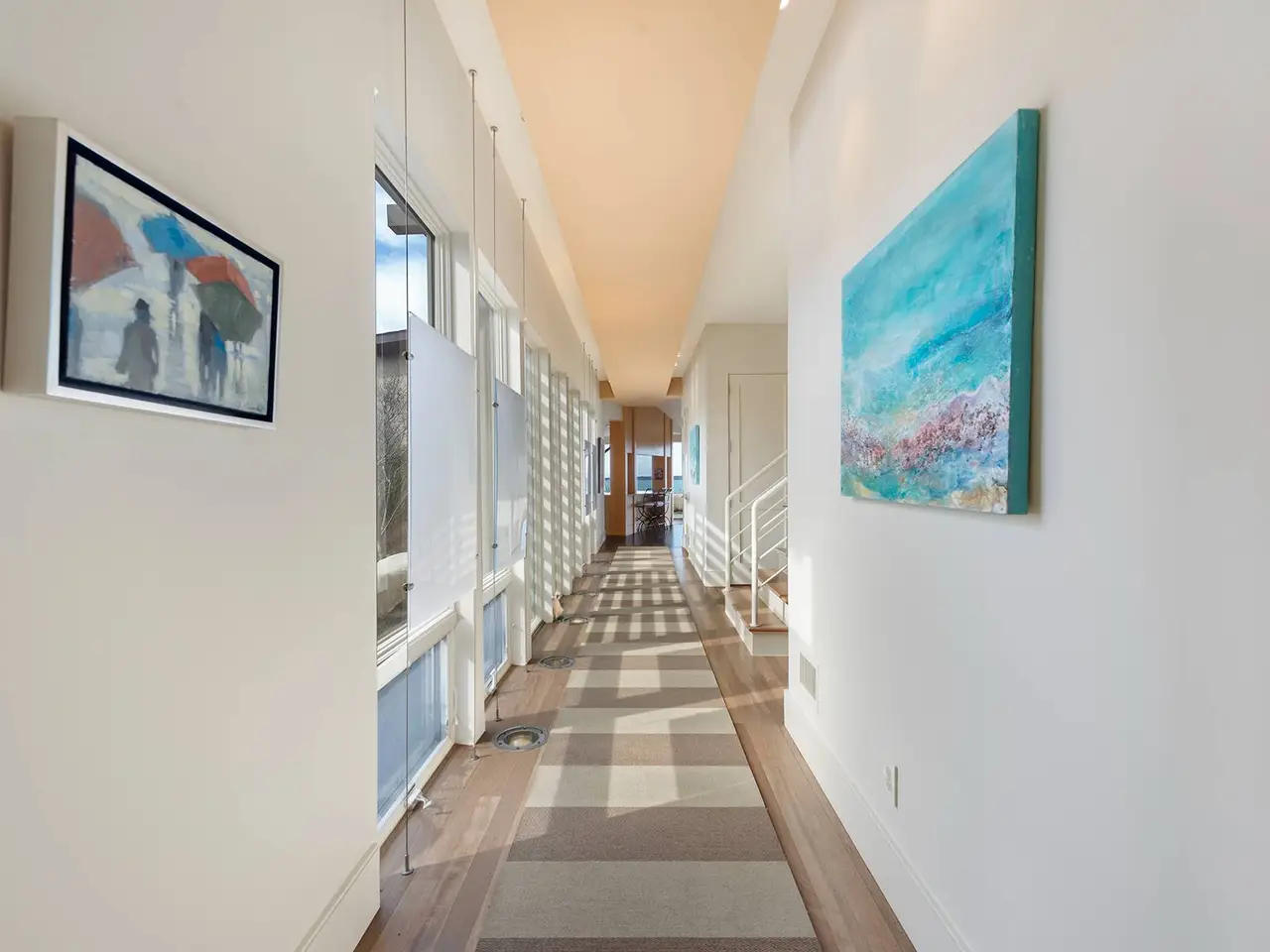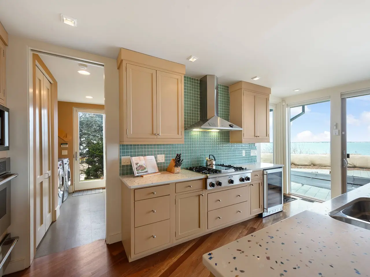 This pristine 3 bedroom, 3 bathroom waterfront property is being offered for rent for the first time. Enjoy stunning sunsets and expansive views from the wall of glass that greets you in the foyer, or the bluestone patio that surrounds the pool and spa. The open concept design features a kitchen, living room, and dining area, creating an ideal space for entertaining. A laundry room with a storage sink and side entrance adds convenience to daily living. The first floor includes two bedrooms and two baths. The primary suite occupies the entire second floor and includes a walk-in closet and a sitting room. Outside, you'll find a waterside heated gunite pool and spa, along with lounge areas and an outdoor shower. A one-car garage is available for tenant use. Located just 6+/- miles from Sag Harbor Village, 8 miles to Southampton Village, and 3.5+/- miles to the tranquil sands of Long Beach.