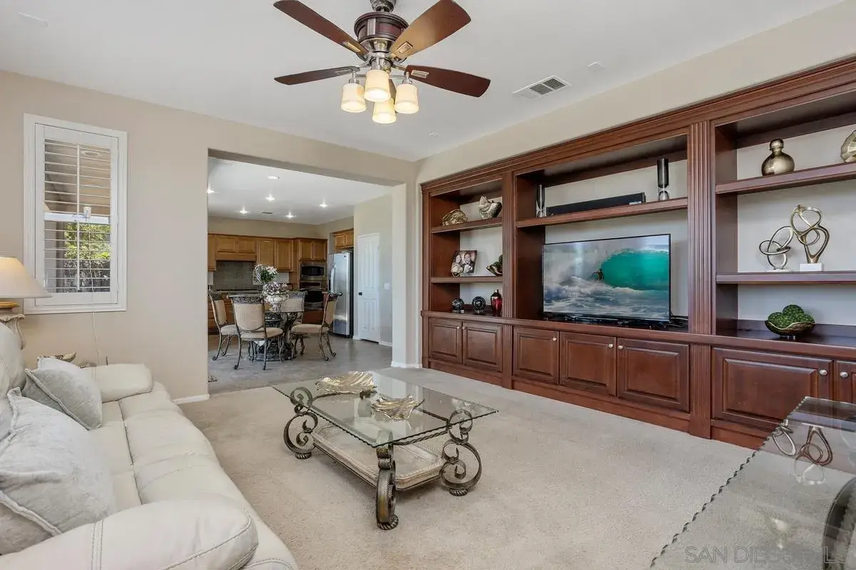 Panoramic Views | No Mello Roos | Arrowood Living: This beautifully maintained 4bd/3ba home with 2,887 sqft of living space is located in the sought-after master-planned community of Arrowood, and offers 180-degree mountain and hillside views. It's an ideal blend of comfort and function. The bright, open floor plan features a spacious kitchen with granite countertops, stainless steel appliances, a large center island, and an extended butler's pantry with ample storage. Plantation shutters, recessed lighting, ceiling fans, and custom built-ins add both style and practicality throughout. Upstairs, the generous bonus room can easily serve as a fourth bedroom, media room, or office. The oversized primary suite offers sweeping views and a large bathroom with dual vanities, a soaking tub, walk-in shower, and separate walk-in closets. Additional features include a tankless water heater, water softener, and central AC. Outside, the professionally designed backyard includes stamped concrete and mature landscaping--perfect for relaxing or entertaining against the scenic backdrop. Enjoy access to the Jr. Olympic swimming pool, Arrowood Golf Course, walking trails, and more. Located in the Bonsall School District and close to parks and shopping. No Mello Roos and low HOA!