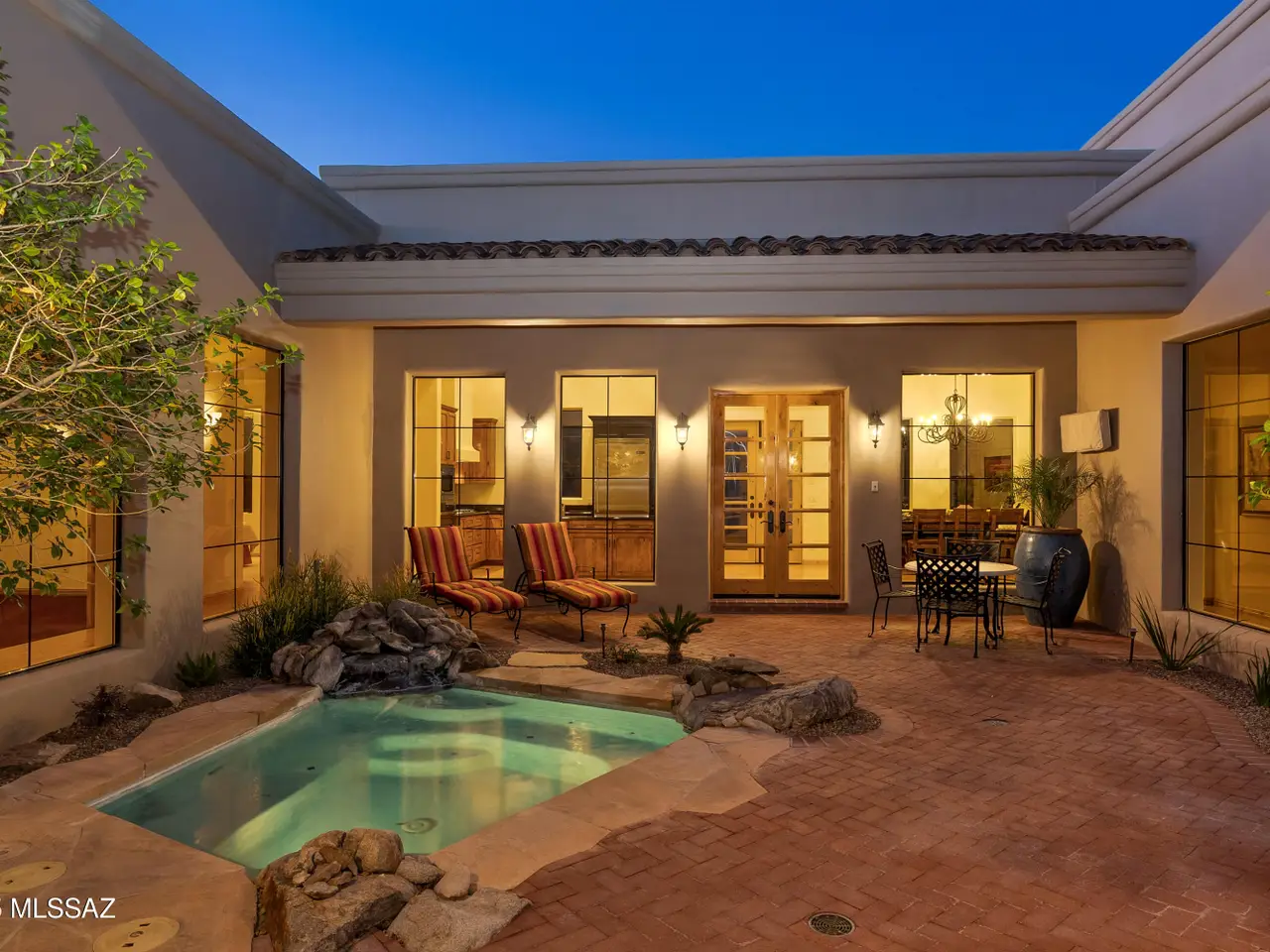 Enduring Mediterranean influence by RB Construction, solid masonry construction for unmatched durability and timeless architecture. 4,484 sq ft of grand scale living space, this home presents a unique tranquil interior courtyard complete with a soothing spa and expansive paneled windows that frame the space beautifully. Adding to its appeal, the property is situated adjacent to 26 acres of pristine conservation easement, ensuring a serene natural backdrop and enhanced privacy. Upon entering, you're greeted by a striking wood-beamed foyer that seamlessly transitions into a sophisticated kitchen featuring black granite countertops, a prep sink, large island with a built-in dining area overlooking the patio.