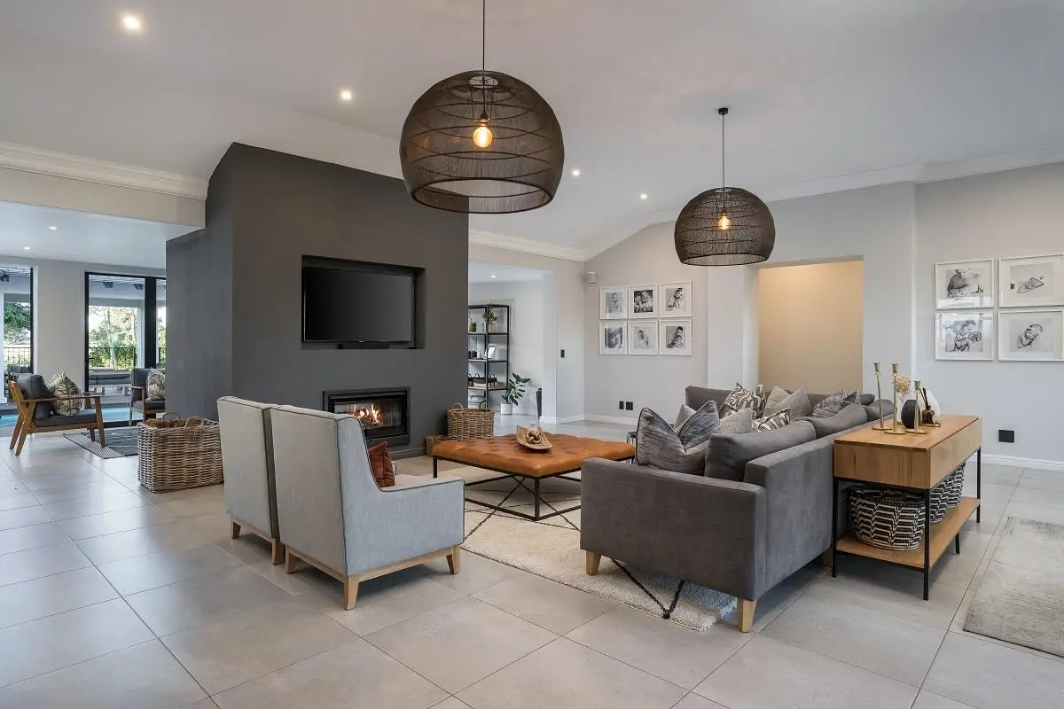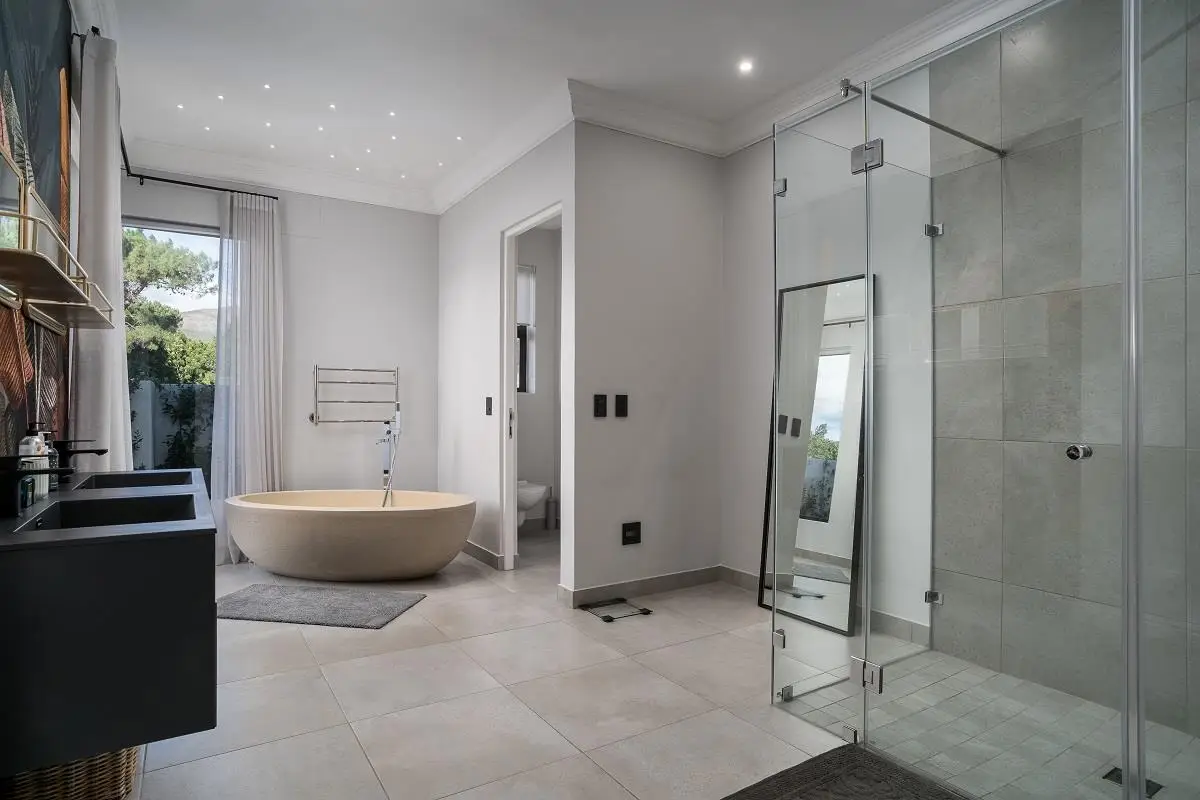 THIS BEAUTIFUL MODERN PROPERTY EPITOMISES WHAT ONE WOULD CALL A FAMILY HOME Stylishly renovated, this single level North facing home is well positioned on a corner stand with privacy and beautiful views towards the open green spaces of fairways and the members driving range. A welcoming entrance of a canopied lush garden leads to the front door. On entering the home the openness, lightness, modern clean lines and finishes give a fresh appeal and a feeling of space. The living space is designed for entertaining with a seamless flow from the well designed kitchen, the dining and lounge areas to glass stacking doors which open to a wooden deck and pool. An indoor braai, perfect for summer and winter use, completes this space and a covered area on the wooden deck adds an additional seating area with all flowing so well together to make the perfect spaces for family living and for entertaining. This beautiful home offers 4 well sized bedrooms all with ensuites, a large audio visual room, a study, a guest cloakroom, spacious open plan living areas and kitchen, utility room, triple garage, staff accommodation, invertor system, solar geyser and a well established garden. A rare opportunity to own a fully renovated and well positioned family home within the exclusive Pearl Valley Golf Estate.
