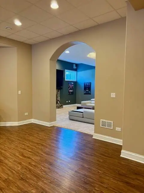 地下室装修完毕,配有 14 英尺高的天花板和媒体区