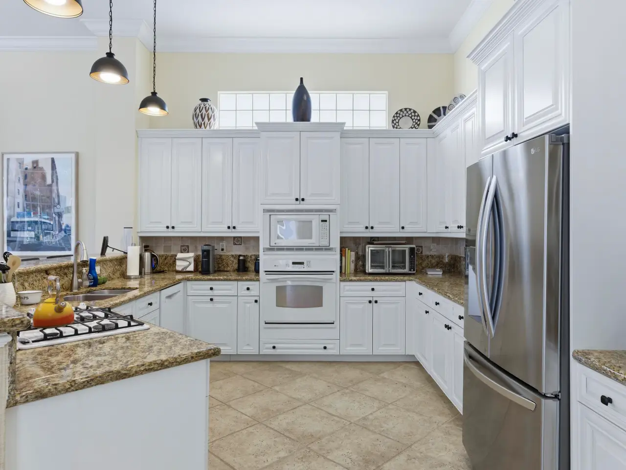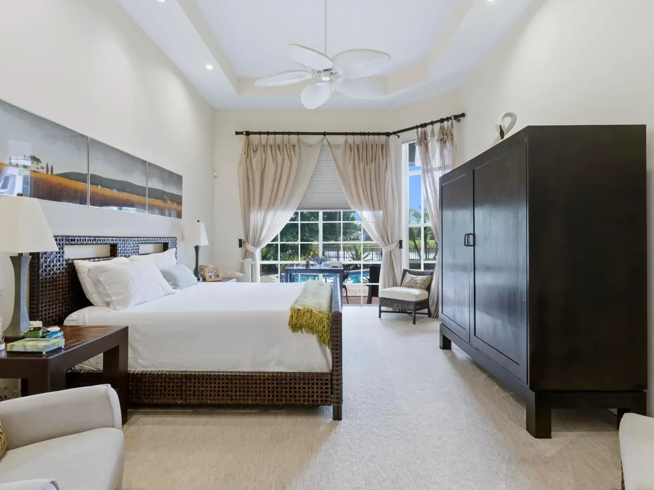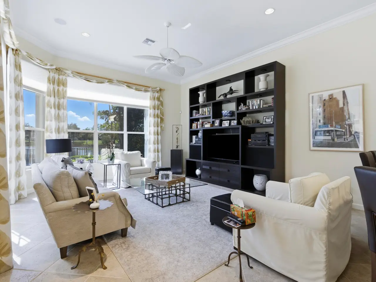 Gracious home set in the very desirable Vizcaya Drive neighborhood in The Country Club at Mirasol. The home enjoys exceptional views, overlooking both the Sunrise golf course and a beautiful lake, offering a spectacular private setting. It's a true 3-bedroom, each with its own private bathroom, plus a guest bathroom and an office. Additional features include hurricane shutters installed in 2017, a Generac generator installed in 2020 with a 10-year warranty, and new hurricane impact-resistant front doors. A screened-in patio overlooks the wonderful views. In addition, a new refrigerator and dishwasher were installed in 2022, and an LG washer and dryer in 2019.This lovely home offers a social membership, which can be upgraded to a sports membership.