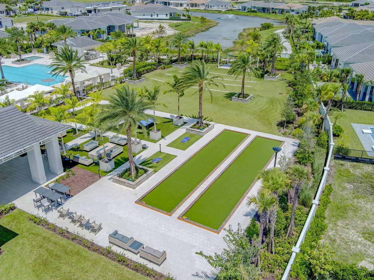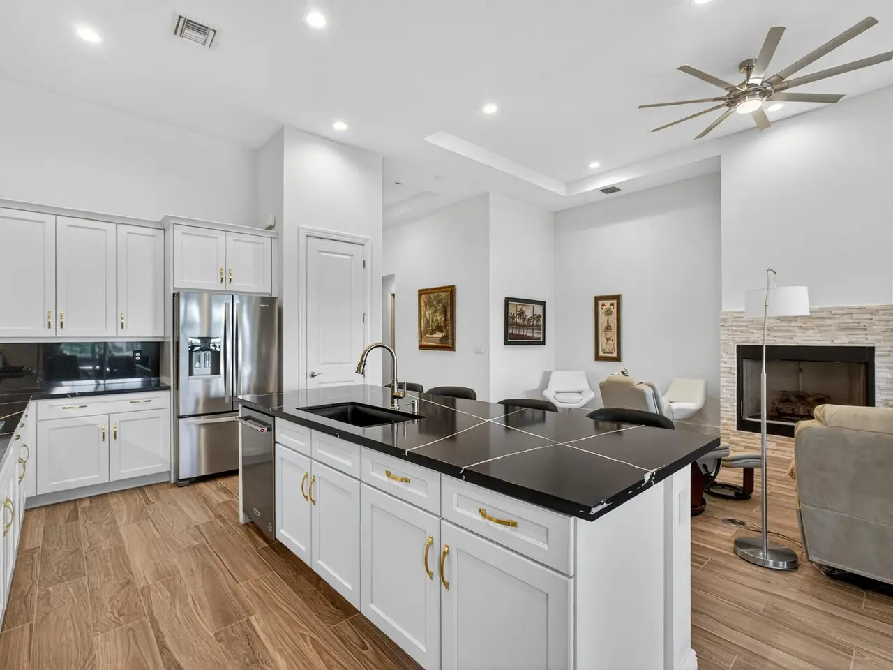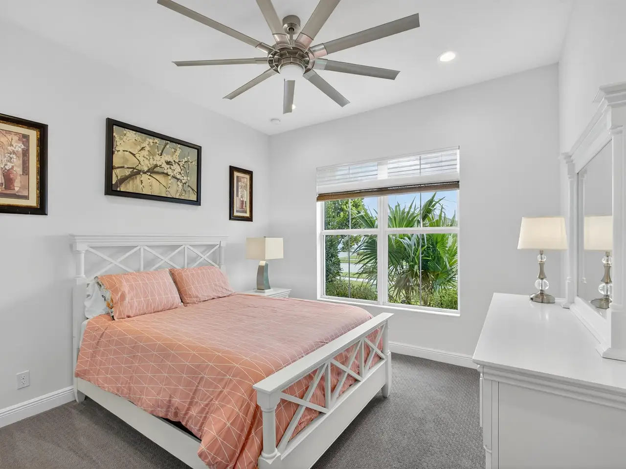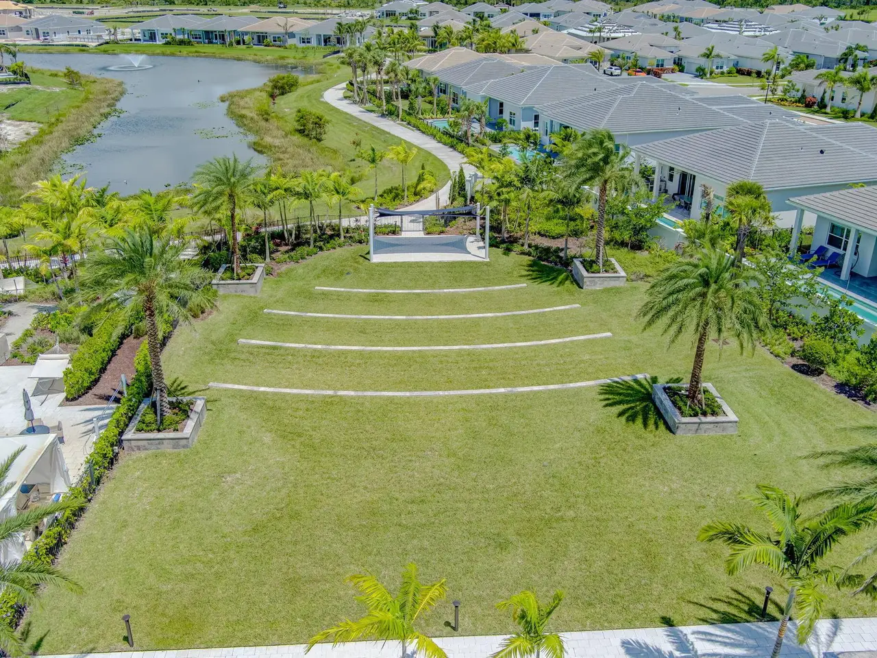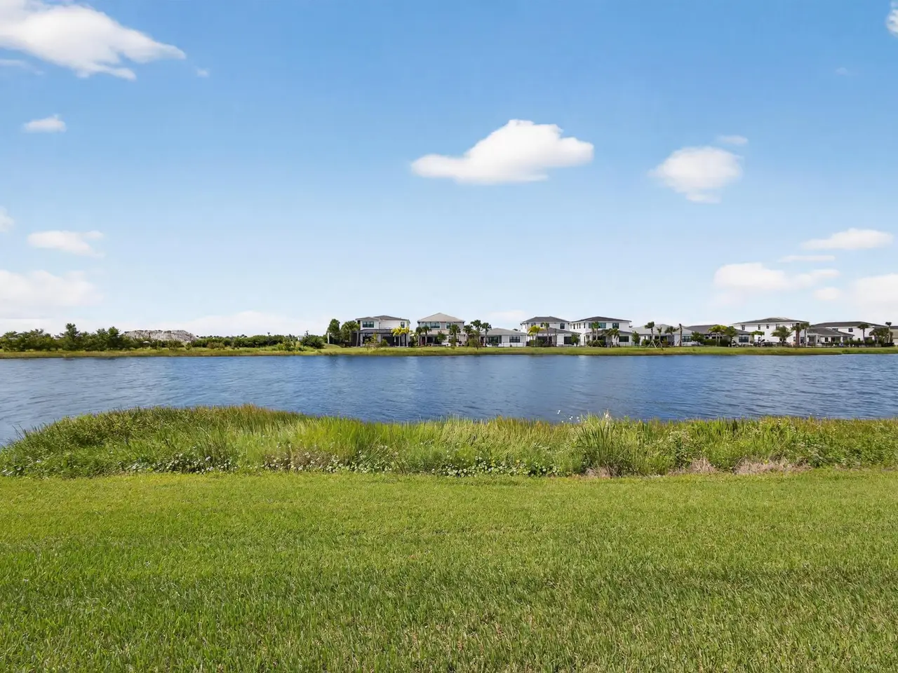 This beautifully appointed 3-bedroom plus office, 3-bath home offers an open and airy floor plan with a bright coastal feel and stunning wide water lake views. Western exposure provides magnificent sunsets that can be enjoyed from the extended lanai patio, creating the perfect setting for entertaining or relaxing by the water. The home features a Tropical-inspired backyard complete with astro turf, a golf putting area, and remote-controlled hurricane patio screens for year-round comfort. Inside, every detail has been thoughtfully upgraded, whole house, Generac Generator, oversized 8-blade ceiling fans with lights in the living areas, bedrooms, and patio, custom blinds on all windows, upgraded light fixtures, and an oversized jetted tub in the primary suite and comfort height toilets.