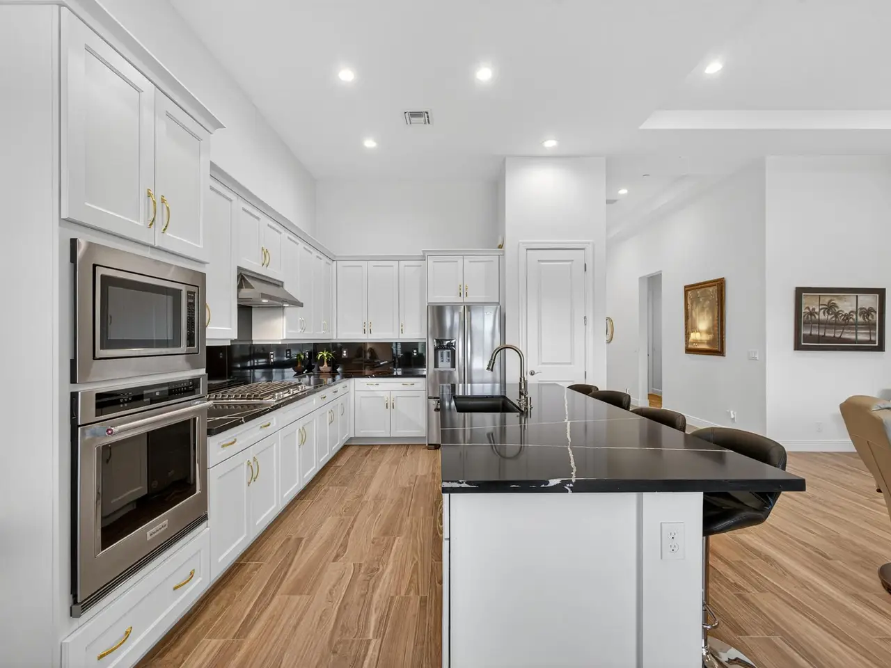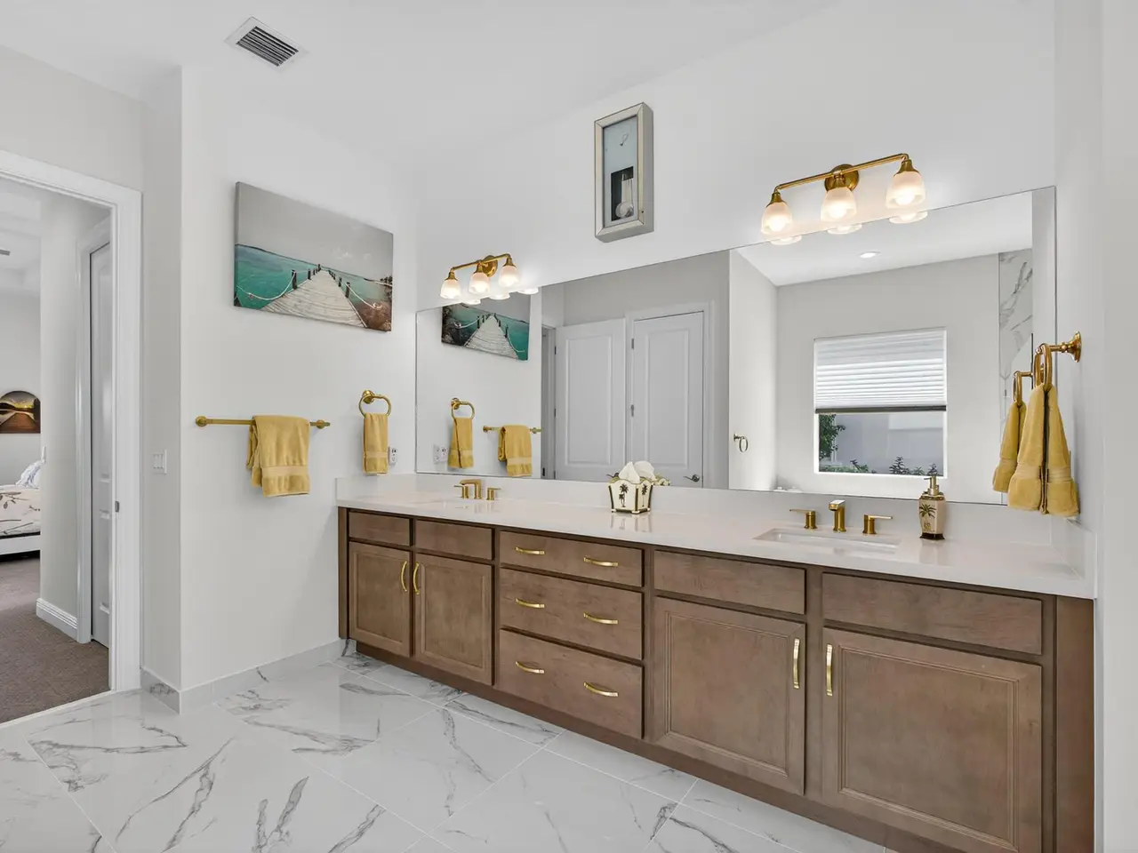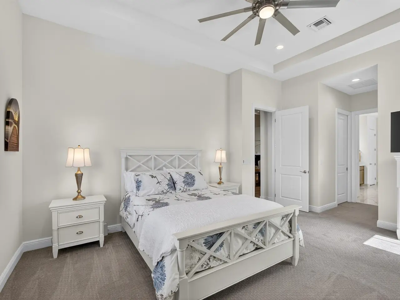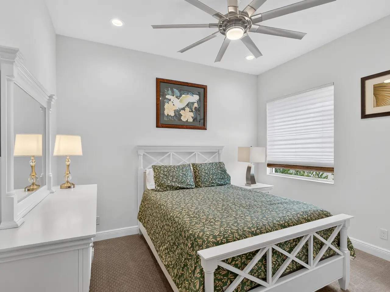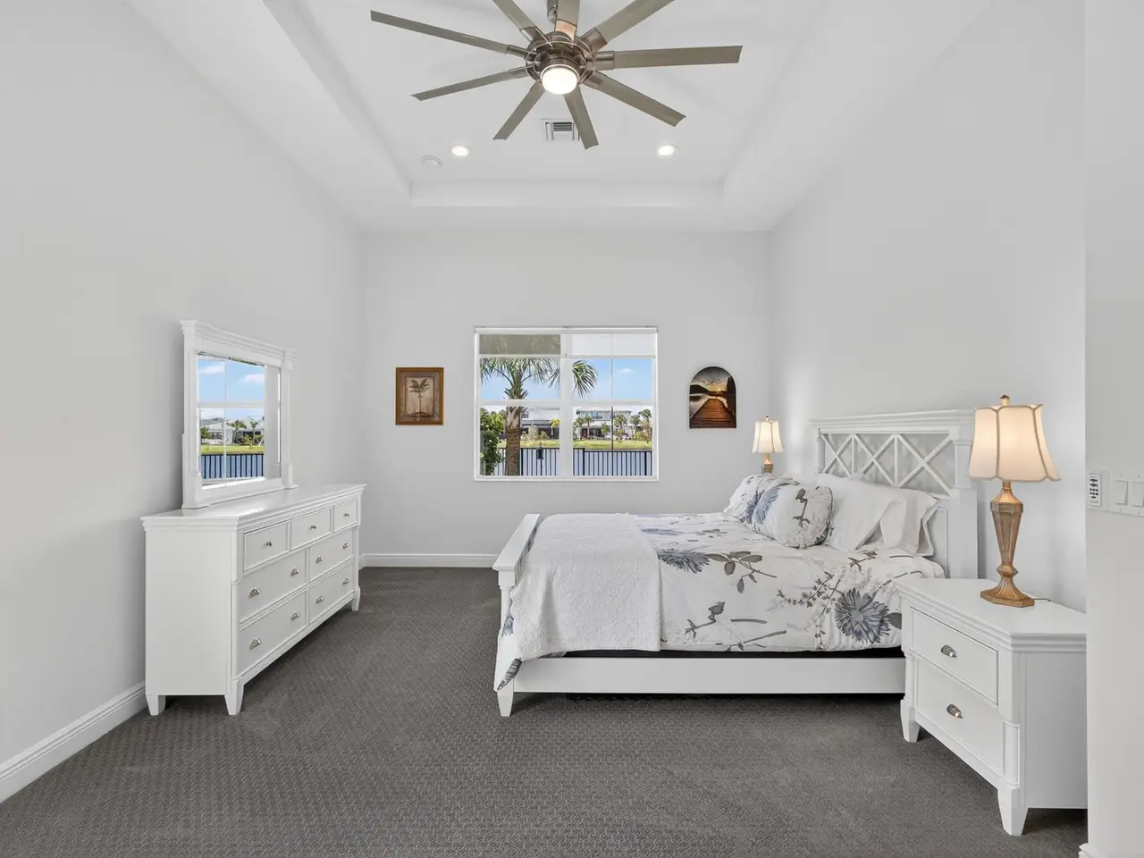 This beautifully appointed 3-bedroom plus office, 3-bath home offers an open and airy floor plan with a bright coastal feel and stunning wide water lake views. Western exposure provides magnificent sunsets that can be enjoyed from the extended lanai patio, creating the perfect setting for entertaining or relaxing by the water. The home features a Tropical-inspired backyard complete with astro turf, a golf putting area, and remote-controlled hurricane patio screens for year-round comfort. Inside, every detail has been thoughtfully upgraded, whole house, Generac Generator, oversized 8-blade ceiling fans with lights in the living areas, bedrooms, and patio, custom blinds on all windows, upgraded light fixtures, and an oversized jetted tub in the primary suite and comfort height toilets.