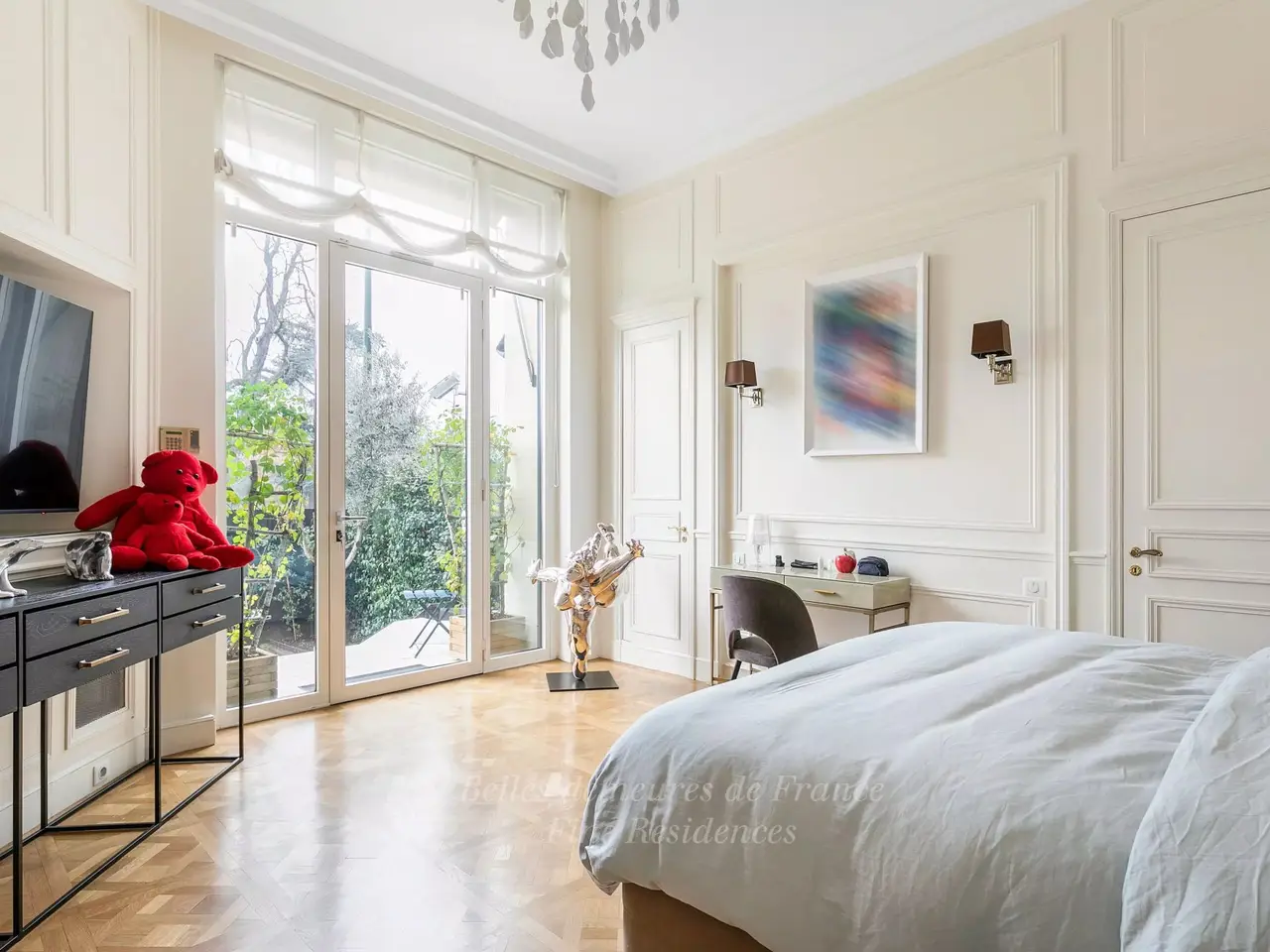 This exceptional 549 square meter split-level apartment benefiting from a 420 square meter garden is in a prestigious 1930’s Walter building. The garden level includes a spacious living/reception room bathed in sunshine and opening onto the garden, a drawing room, a dining room, a kitchen with a cold-room, a bedroom with a bathroom, a study and a fitness room. The upper floor comprises four bedrooms with bathrooms including a master suite. With a sauna and a hammam. Beautiful features include marble floor surfaces, panelling, Herringbone parquet flooring and gilded mouldings. With two maid’s bedrooms, a lock-up garage and a wine cellar. A magnificent apartment near the shops, the schools and the transport networks.