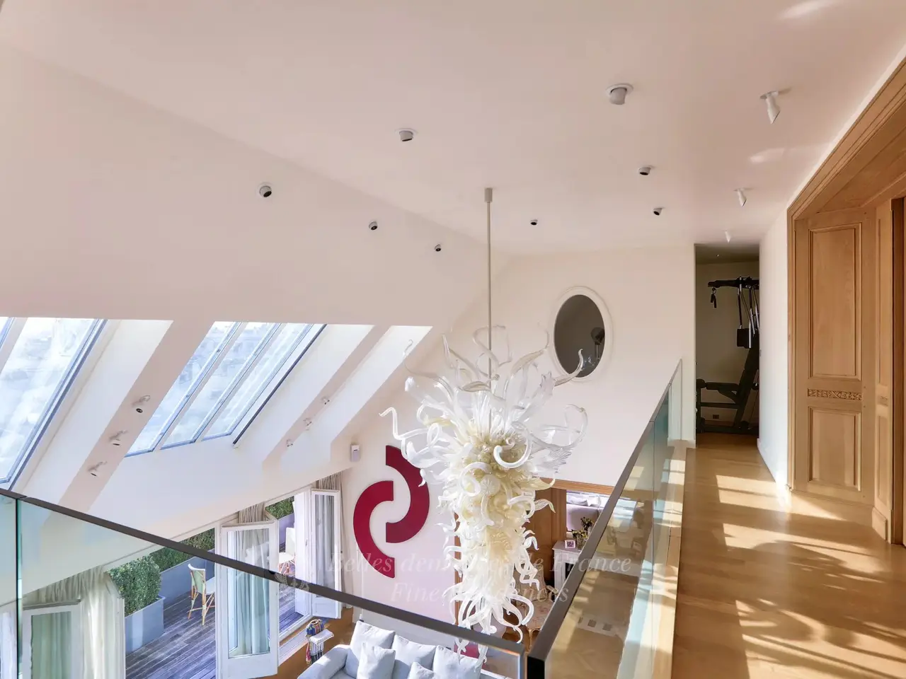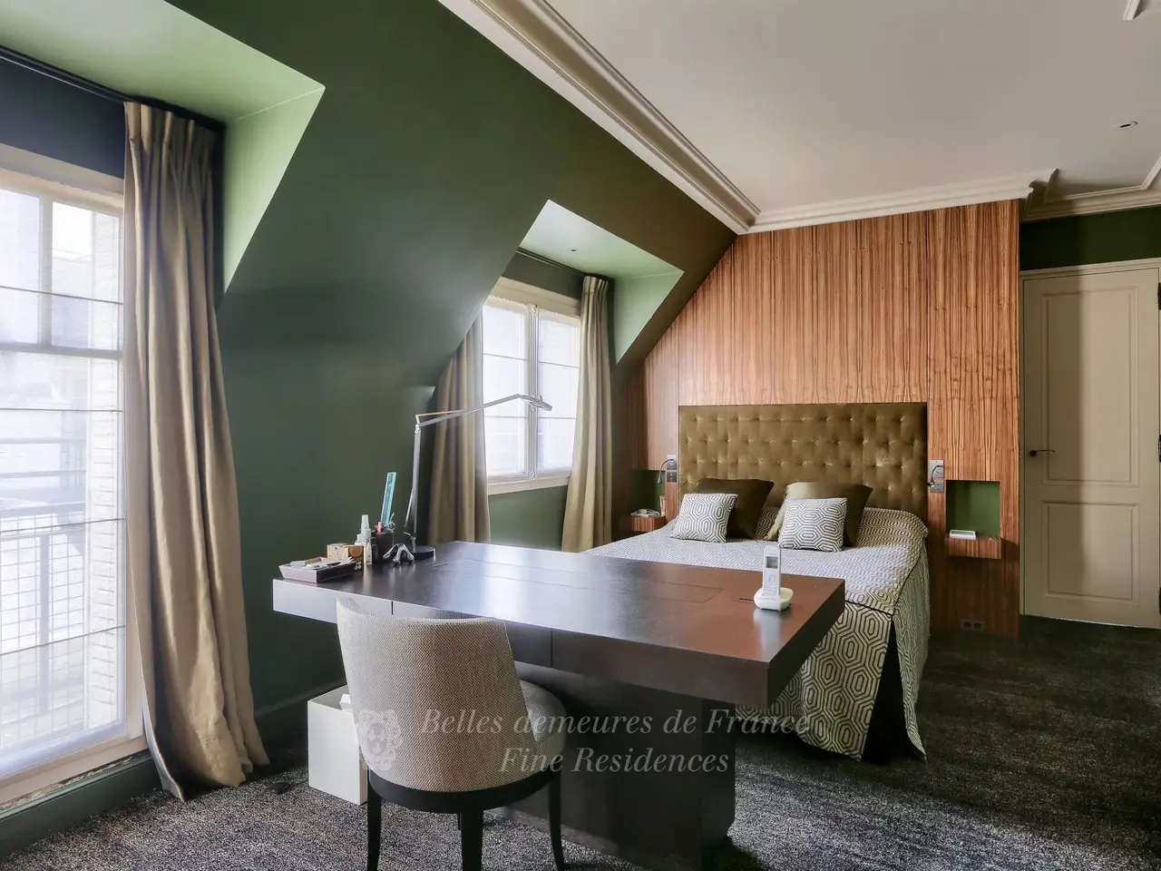 Place François Ier, in the heart of the prestigious Golden Triangle. On the top floors (7th and 8th) of a remarkable 1930’s Art-Deco style building designed by renowned architect Charles Lemaresquier, this rare penthouse of about 225 sqm living space includes an extensively glazed workshop-style living/reception room featuring 5.70 metre high ceilings and opens onto a 27 sqm terrace, a dining room, a kitchen, and three bedrooms with bath or shower rooms. Fully air conditioned. Benefiting from an 84 sqm terrace, the upper floor comprises a sitting room, a study, and a fitness room with a shower room. A fourth 45 sqm terrace commands a panoramic view of the capital. Two parking spaces in the building may be acquired at extra cost.