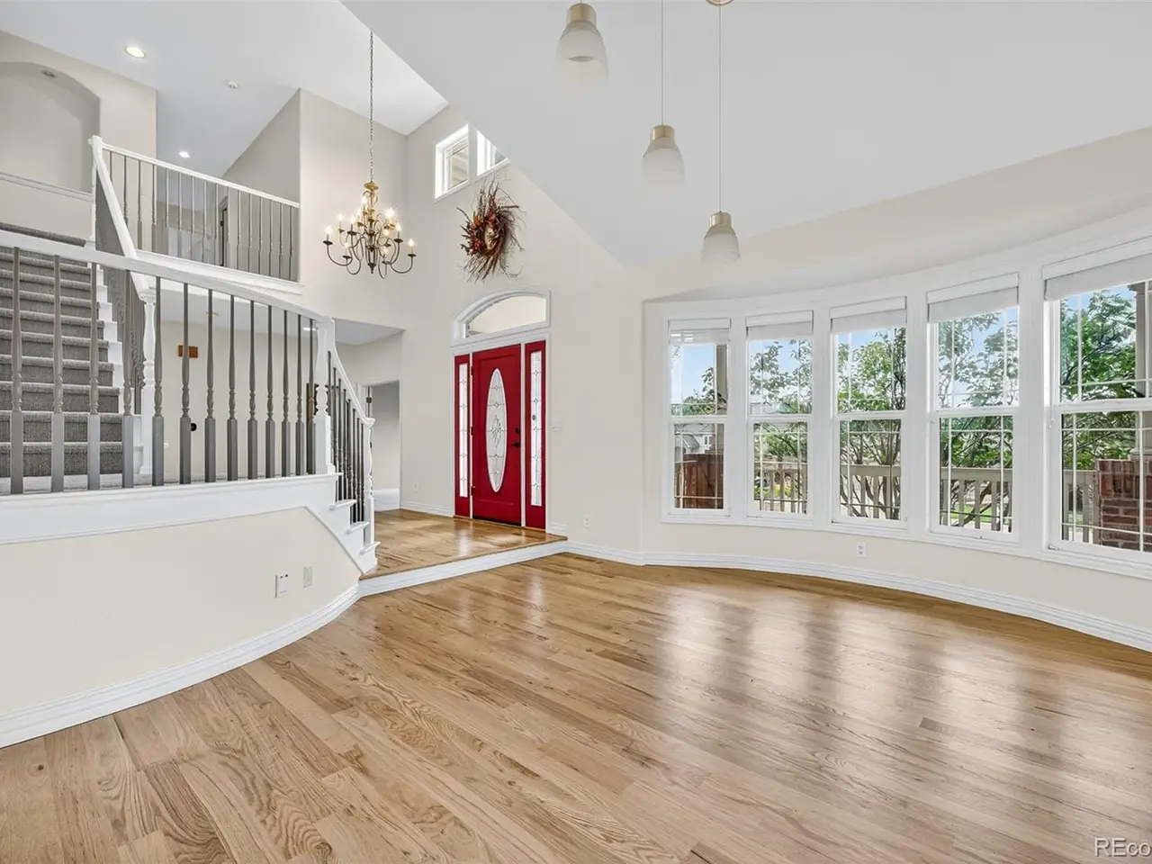 Vaulted entryway with curved stairway