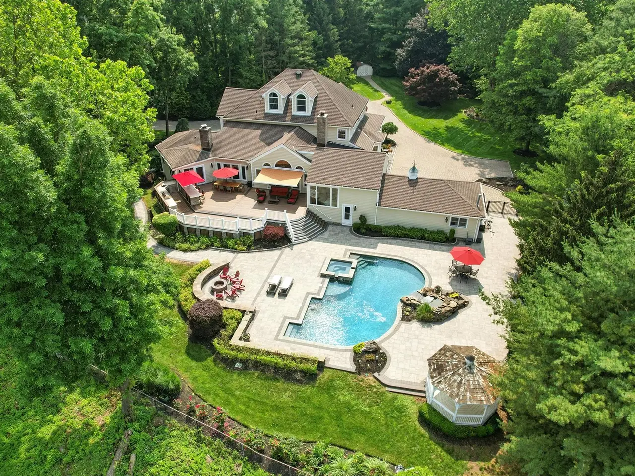 Welcome to Carousel Estate: A Waterfront Sanctuary Less Than 30 Miles from Manhattan. Tucked behind a private gated entrance and surrounded by over 3 acres of lush and thoughtfully designed landscaping, is a rare waterfront estate that offers total seclusion. From soaring eagles to vibrant blue jays, wildlife abounds- making this property feel like a world all your own. This one-of-a-kind estate offers sweeping views of Lake Tappan from nearly every angle. The circular paver driveway makes a grand first impression, featuring a landscaped center island with a koi pond. The layout offers ample parking and effortless access to three-car garage, all surrounded by lush lawns and mature trees providing both privacy and curb appeal. The grounds are a true resort-like paradise: lounge beside the saltwater pool and spa, dine on the expansive Trek deck with built-in outdoor kitchen, unwind in the custom gazebo, or gather around the fire pit under the stars all while enjoying complete privacy and sweeping waterfront views. This grand residence spans approximately 6,000 square feet, showcasing a masterful blend of classic elegance and modern luxury, all set against the backdrop of Lake Tappan. Glass-inlaid entry doors open to a bright and airy two-story foyer where soaring ceilings, an elegant chandelier, and a dual staircase make a lasting first impression. Natural light pours through the arched transom window above, setting a welcoming tone as the home opens into the formal dining room and living spaces beyond. The right of the foyer features a sunken formal living room with oversized windows and detailed wood trim. Formal dining room offers timeless style with inlay hardwood floors and a crystal chandelier. At the heart of the home, the custom Ethan Allen kitchen features warm wood cabinetry, granite countertops, and a large center island with counter seating. High-end Wolf and Sub-Zero appliances are seamlessly integrated, and a side entrance off the driveway provides easy everyday access. The kitchen opens to the casual dining area and continues into a sunlit gathering room with vaulted ceilings, exposed wood beam accents, and a striking floor-to-ceiling stone fireplace. A wall of windows including elegant arched transoms- fills the space with natural light and captures peaceful lake views. French doors lead directly to the deck making indoor-outdoor living feel effortless. The first floor primary suite offers vaulted ceilings, a stone fireplace, and direct access to the back deck and lake views. The spa-inspired en-suite bath features a jetted soaking tub, steam shower, and double vanity. Two separate home offices on the main level offer versatility for work, reading, or creative space. One features custom built-ins, wood flooring, and French doors for privacy, while the other is wrapped in windows with panoramic views of the lake and pool. The second level offers three generously sized bedrooms- two joined by a Jack-and-Jill bath, and one with its own private en-suite. A versatile upstairs den provides the perfect spot for movie nights, quiet study, or simply unwinding. Tucked away on the third floor, this spacious suite with its own full bath and peaceful lake views offers a quiet retreat. Whether used as a guest sanctuary, creative studio, or additional bedroom, it provides privacy, comfort, and flexibility. The spacious basement offers endless potential, a blank canvas of approximately 3000 additional sq ft. Bonus features include a security camera system, alarm system, sprinkler and landscape lighting systems, new landscaping, multi-zone high-efficiency heating with a backup boiler, five-zone high-efficiency cooling with UV lights, a third-floor sprinkler system and so much more. Subdivision potential adds even more long-term value. Ideally located on a quiet cul-de-sac in the award-winning Pearl River school district, Carousel Estate offers the rare opportunity to live an extraordinary lifestyle every day.