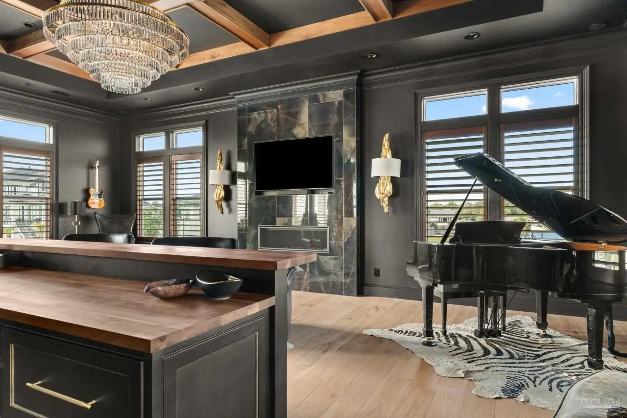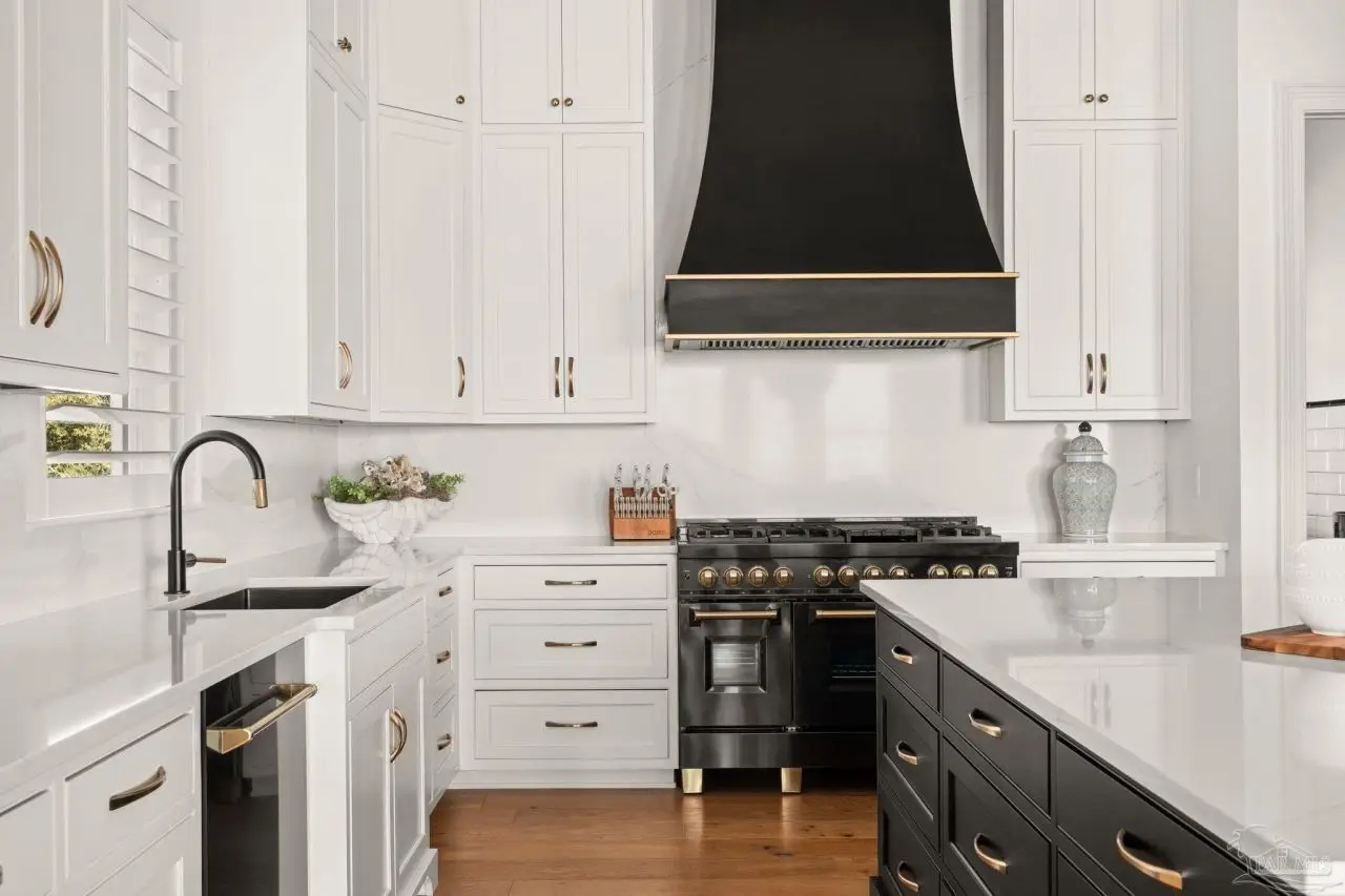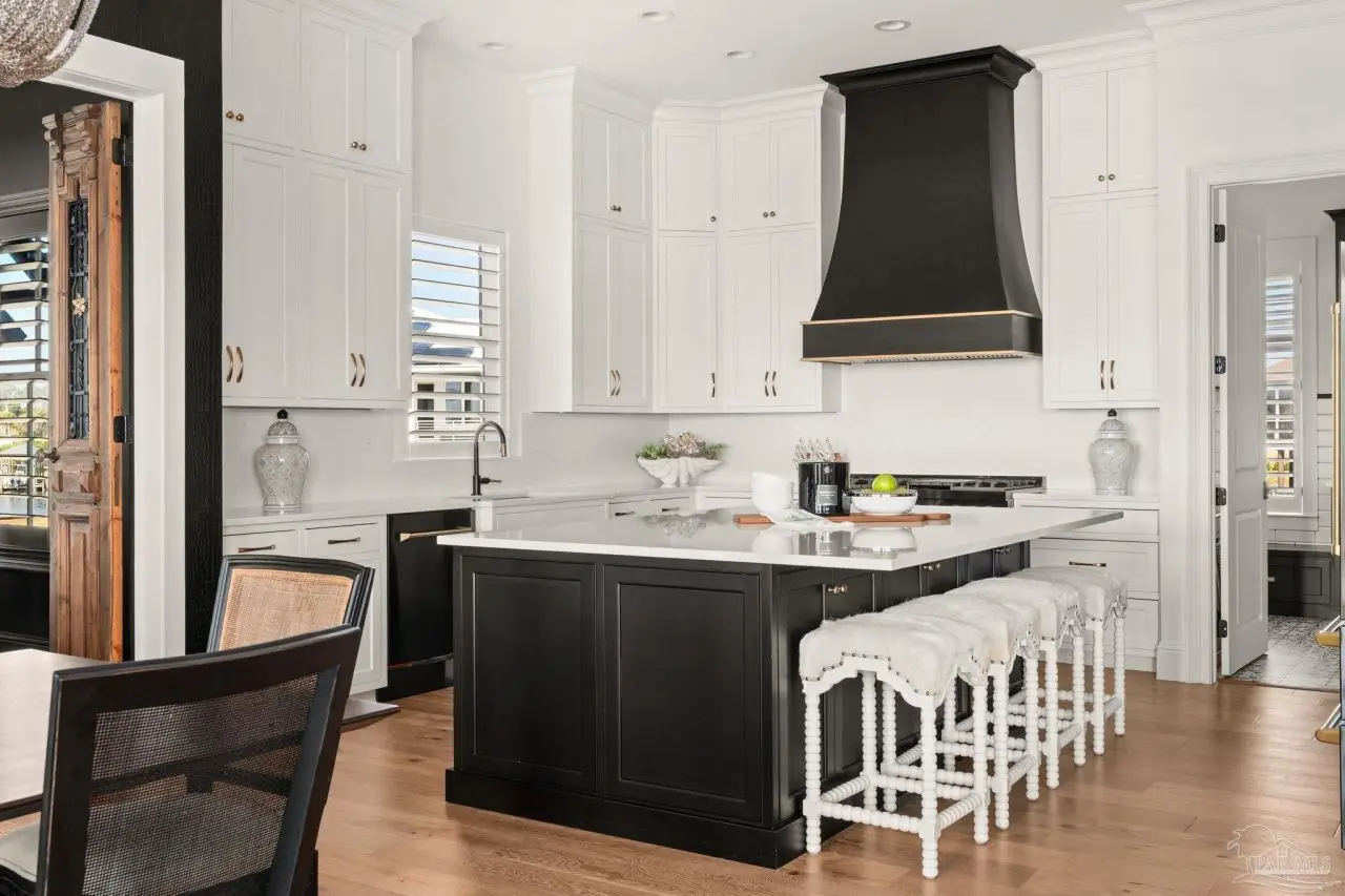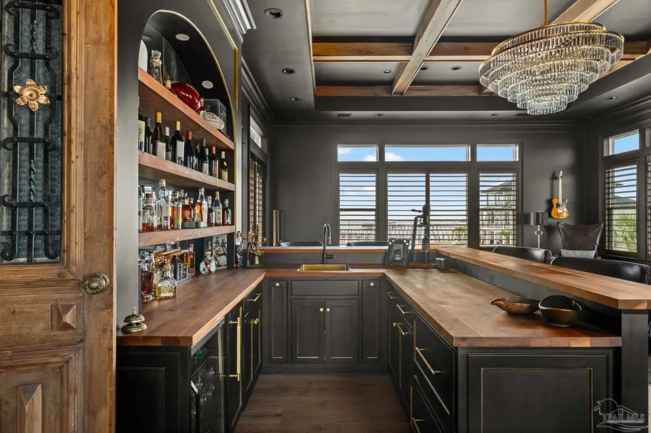 Experience luxury coastal living at its finest in this breathtaking 5-bedroom, 4-bath estate perfectly positioned on a ý-acre cul-de-sac lot with 217 feet of pristine waterfront on the Intracoastal Waterway and a private boat basin. Enjoy panoramic views of the Intracoastal and the Gulf, where gorgeous sunrises and stunning sunsets fill the sky each day-and watch the Blue Angels fly from the comfort of your own backyard. A boater's paradise, this property offers direct access to the Intracoastal Waterway and is in close proximity to the Pass, providing effortless access to the Gulf of America or fishing, cruising, and coastal adventures. Inside, the home showcases white oak hardwood floors throughout, beautiful moldings, luxury marble and tile bathrooms, and a gourmet kitchen adorned with quartz countertops and backsplash, black stainless designer appliances, a Wolf built-in coffee system, and a butler's pantry featuring custom cabinetry and walnut counters. The Bar & Game Room exudes a stylish speakeasy vibe, featuring a gas fireplace, walnut bar, beverage refrigerator, Scotsman ice maker, and beverage dispenser-a perfect gathering place for friends and family. Step outdoors to your private resort-style retreat with a gunite heated pool and spa, surrounded by marble decking, and an outdoor kitchen equipped with a Blaze gas grill, Large Green Egg, beverage fridge, prep sink, and a full outdoor bathroom for added convenience. Additional highlights include a whole-house gas generator, an elevator servicing all three floors, and en-suite bedrooms finished with quartz, marble, and designer tile. Celebrated for its exceptional design and craftsmanship, this home has been featured in multiple luxury coastal magazines-a true testament to its architectural distinction and timeless beauty. This extraordinary waterfront residence seamlessly blends modern sophistication, comfort, and the ultimate coastal lifestyle.