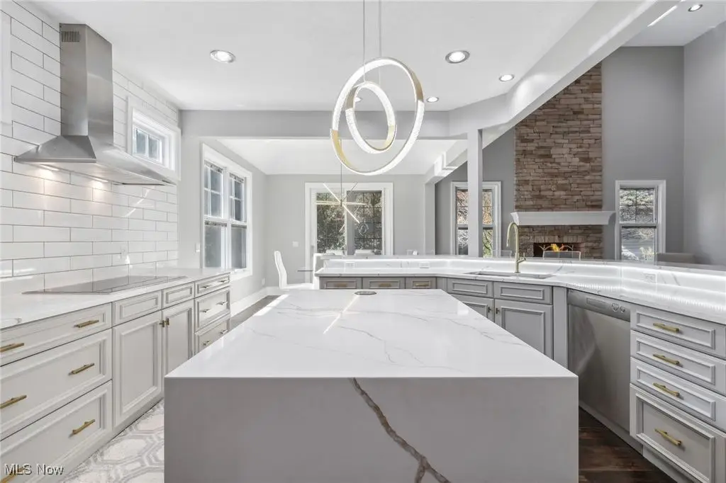Striking modern colonial home in Sterling Lakes of Pepper Pike. Exceptionally maintained grounds makes this low-maintenance GATED community of prestigious homes stand out like no other in the area. Beautifully set among other fine homes, this property offers tasteful upgrades & updates throughout. The first floor layout keeps ease of living in mind, w/a spacious & vaulted 1st floor owners suite boasting remodeled glamor bath with fully tiled walk-in shower, soaking tub & his/her closets, among other fine details. The renovated modern eat-in kitchen boasts a waterfall quartz top center isle, stunning counter top lighting, exceptional walk-in pantry, plus butler's pantry pass-through to the formal dining room. A floor to ceiling gas fireplace warms the space w/stone veneer. The private first floor den/sitting room is smartly set away from the hustle and bustle, offering it's own private patio to steel away w/your thoughts. The stairs & loft area have been fully transformed with a sleek cable railing system, adding to the dramatic modern appeal. Two addl spacious bedrooms w/2 full baths, plus large loft area provide private quarters for family & guests. The recently finished basement adds tremendous flex space (approx 1500 sqft), including recreation, storage, and bedroom suite, offering a large closet & full bath. This property has been transformed from traditional to stunningly modern, including but not limited to: new solid surface flooring throughout (no carpet), lighting, paint, baseboards, fully remodeled kitchen and baths, two full bath added, basement finished, & so much more! 1st floor laundry room. 3 car garage w/8' doors and built in cabs. Low maintenance living includes lawn care, landscaping, snow removal & general grounds care. Enjoy the meandering walking paths overlooking multiple water views around the community. Excellent location. Close to I-271, fine shopping, and some of the best hospitals and schools in Greater Cleveland! Quick possession if needed.