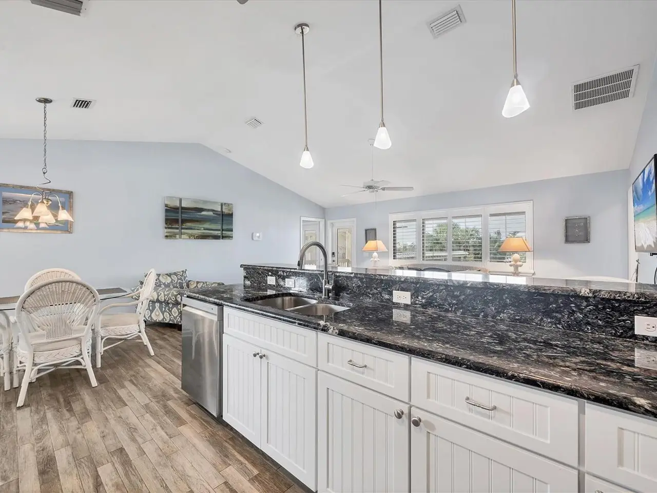 Welcome to Don Pedro/Palm Island! This exclusive Key West style Florida home offers tasteful and updated interior design as well as expansive outdoor entertainment area. The lot is just shy of one half acre. This 2 bedroom, 2 bath home has wood like tile flooring, windows with interior plantation shutters throughout, granite countertops throughout, stainless steel appliances, high coffered ceilings, impact glass and much more. Air conditioned Bonus Room with 1/2 bath. Outdoor living space includes a large pool with swim-up bar offering six in pool bar seating area, a covered 10 x 16 foot outdoor grill area, a 12 x 36 foot lounging area covered by metal roofing, louvered walls, composite decking. Additional exterior amenities include outdoor shower, air conditioned bonus room with pool bath, a 17 x 13 foot garage, and a 25 x 36 foot paved area under home. There is a shared dock located on Kettle Harbor waterway with no bridges to the Intracoastal Waterway and Gulf of Mexico. This property offers the best that Florida has to offer and is a MUST SEE.
