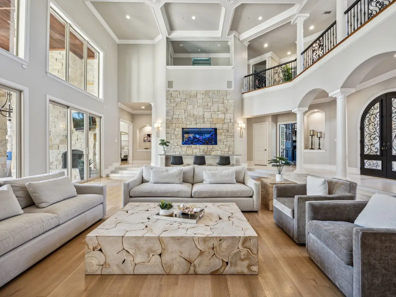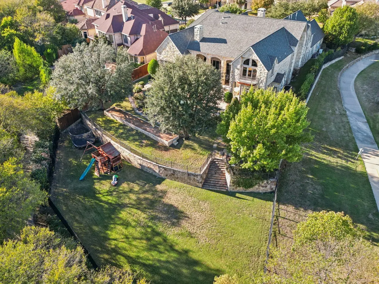 Welcome to this stunning West Plano home, a cul-de-sac lot with an expansive backyard oasis that sits on a greenbelt with unparalleled views. Recently remodeled and full of upgrades and unique touches - truly move-in ready. At entry, guests are greeted with a dramatic great room showcasing soaring ceilings, sweeping windows looking to the backyard, and a striking aquarium. Office-library combo is the perfect space for work or relaxation, with built-ins, windows culminating in an eye-catching arch, and charming winding staircase leading to library. Elegant dining room is perfect for entertaining, with barrel ceilings, butler's pantry, and bay windows. Gourmet kitchen is a chef's dream, with built-in Viking appliances, like commercial-grade gas range and vent, double dishwashers, three ovens, and walk-in pantry. Hosting is a delight, with waterfall-edge quartzite countertops, oversized island, breakfast bar, and sunny breakfast nook with windows overlooking lush outdoor landscaping. Primary suite is an enormous haven with barrel ceilings, sitting area surrounded by bay windows, and gas fireplace. Spa-like primary bath has dual vanities, separate shower with body sprays, and freestanding jetted garden tub with uplighting. Media and game room are the perfect combo to host, with wet bar, space for pool table, and built-ins. Secondary bedrooms are all generously sized, with natural light and ensuite baths. Any of the rooms could be converted to an exercise room or additional office. Backyard oasis features sparkling saltwater pool and spa with waterfall, and oversized patio that boasts a fireplace and outdoor kitchen, complete with built-in grill. Further in the yard is a peaceful nook with a koi pond. Other features include beautiful live oaks, bocce ball court, play yard, and firepit. This home is minutes away from high-end shopping and dining and a short drive to Legacy West, The Star, Stonebriar Country Club, The Clubs of Prestonwood, and 20 minutes to DFW Airport.