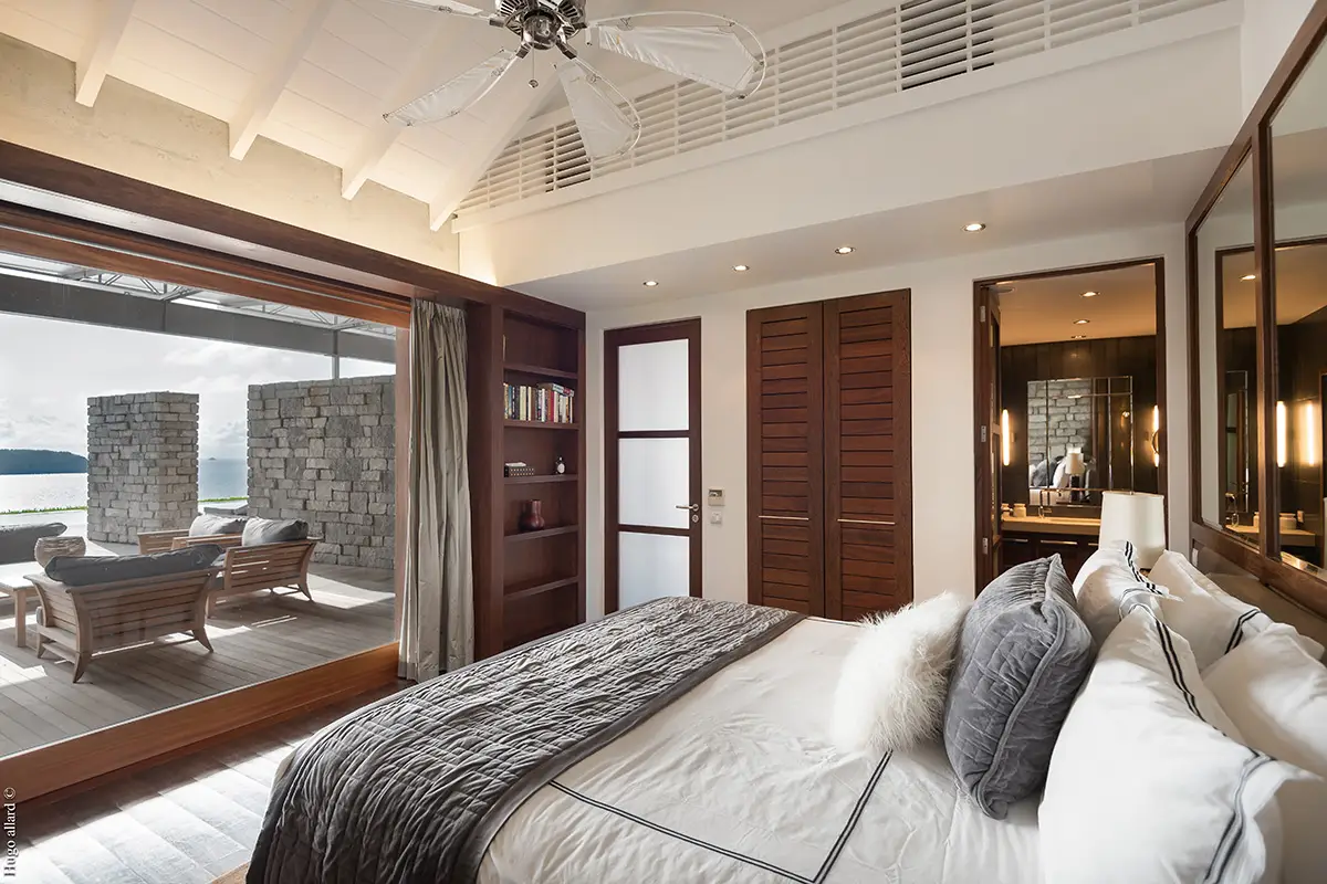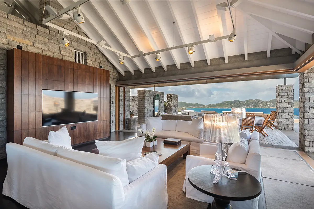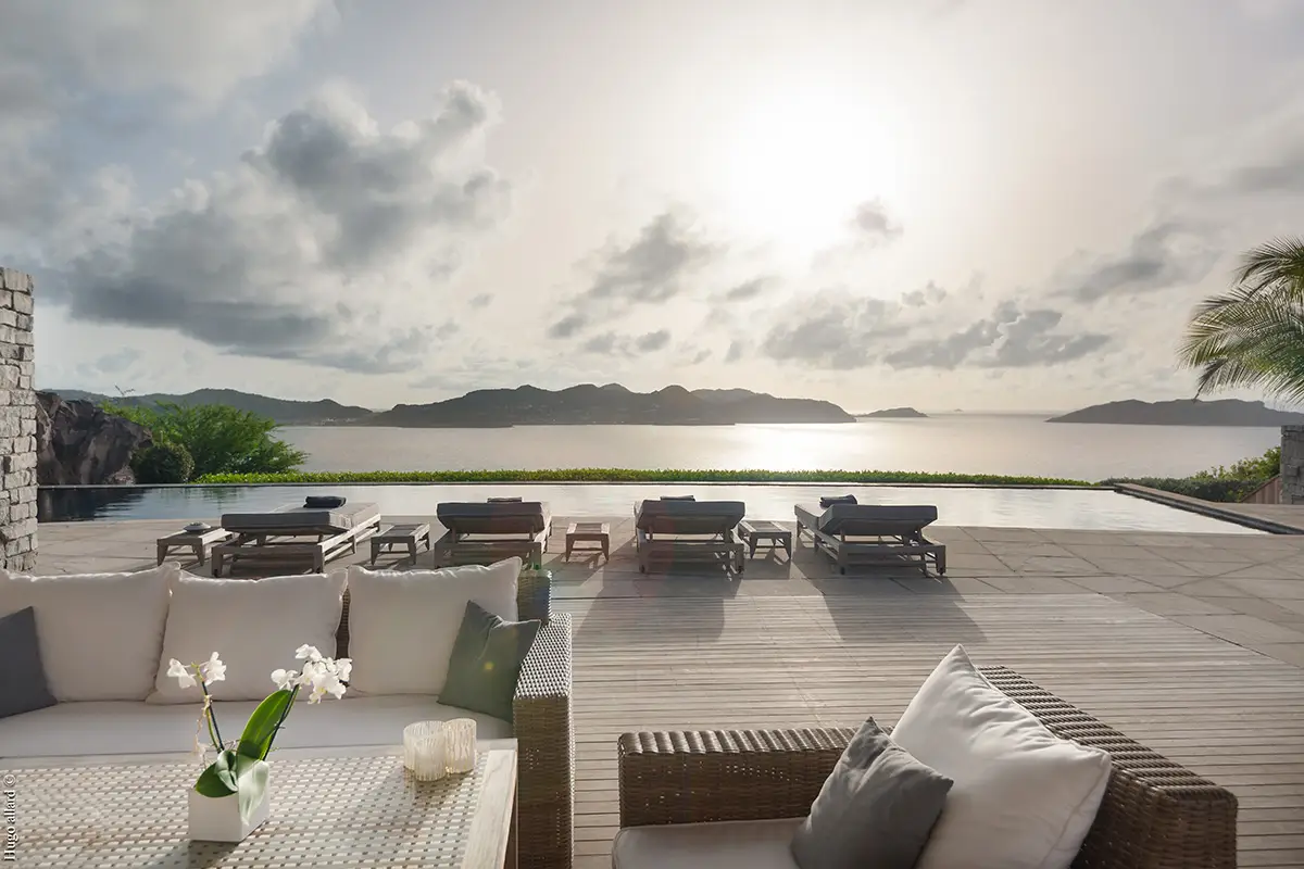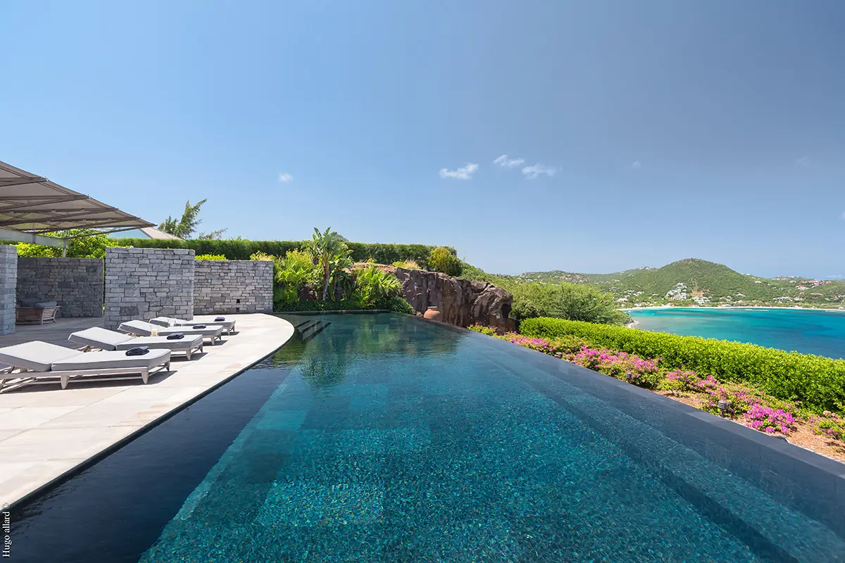 Built on the highest crest of Pointe Milou, this unique villa is like a mini resort and spa. The creation of New York architects Barnes & Coy, this villa is a true jewel of modern architecture and the fruit of incredible craftsmanship. In blending the raw aspect of the stone with the refined woods, the result is perfectly mastered excellence and luxury. The main room, with its 270 degree view, accomplishes the incredible feat of being able to showcase both the sunrise and sunset every day. The entrance leads directly to the heart of the house, between the kitchen and the living room, where the height of the ceiling is truly stunning. At your feet, or so it seems, are the bays of Lorient and St Jean and the Atlantic Ocean and St Martin. There are seven bathrooms and five ensuite bedrooms all similar in size. Three of them have stone walls, private terraces and outdoor showers and the other two radiate with brilliant white tones. The focal point of the property is the wonderful infinity pool. Almost 70 feet long, it is lined with black lava stone, which together with solar panels, maintains the water at a perfect temperature. Adjacent to the pool is an ipe and stone terrace with exceptional panoramic views shaded by a stainless steel and canvas awning along with a stone and wood circular shaped outdoor pool shower and bathroom. There is a private office area on the mezzanine level as well as a well-equipped fitness room on the lower level. The lower level also boasts a dedicated massage room for enjoying massages in the comfort of your own home. Villa DOL is truly 'one of a kind'. The property also benefits from a valid building permit allowing modifications to the current layout, including the removal of two bedrooms on the lower floor to create a caretaker’s accommodation with independent access, the creation of a new master bedroom near the pool, and the installation of an elevator.
