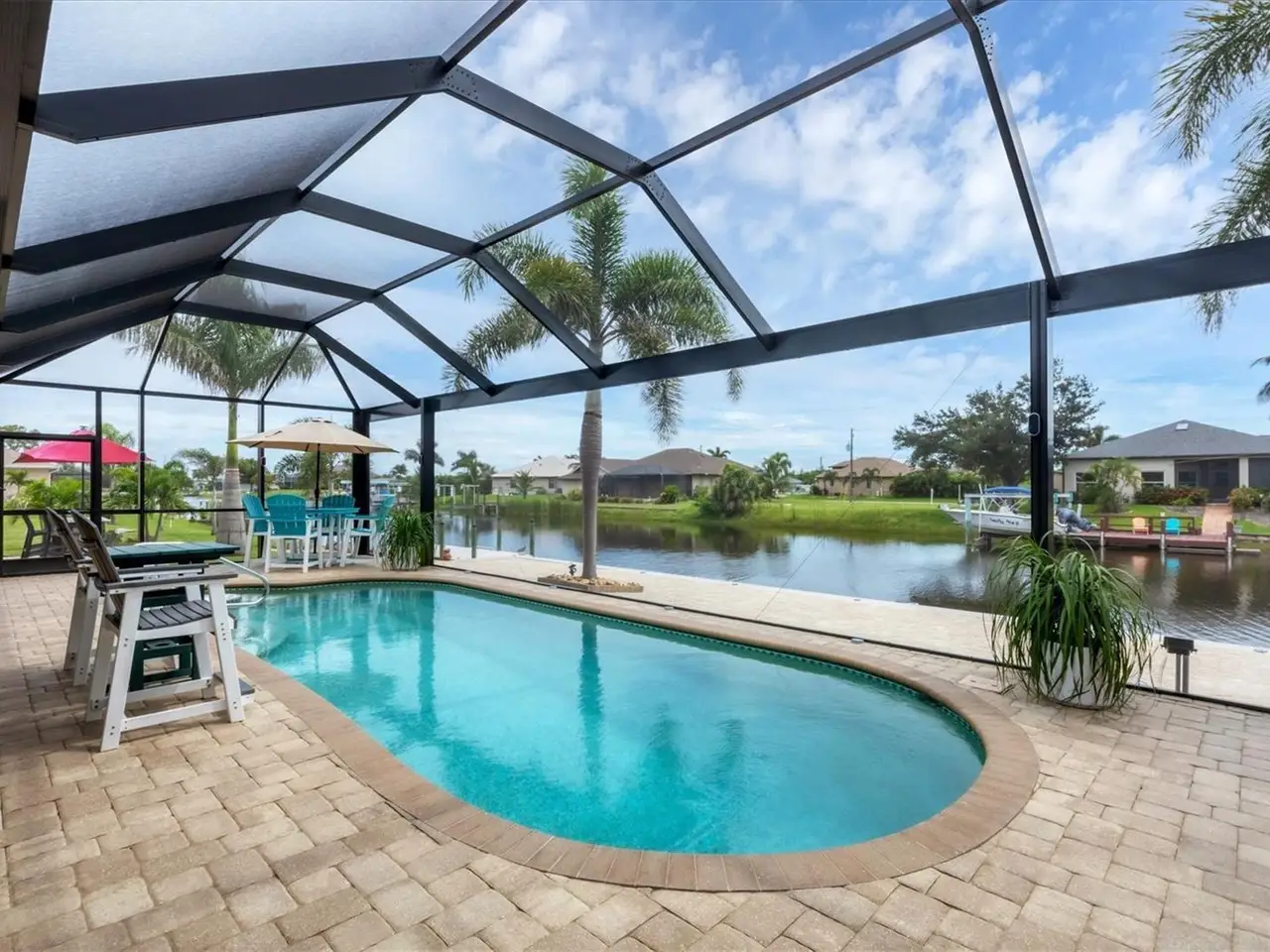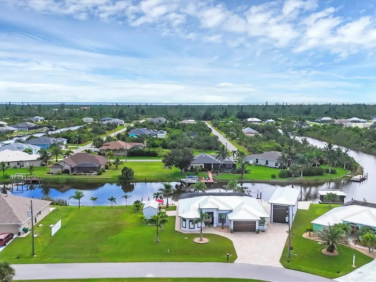 Welcome to coastal perfection in this exceptional custom-built waterfront home, nestled in the coveted South Gulf Cove community. This magnificent residence sits gracefully on a rare double lot, boasting an impressive 213 feet of waterfront, complete with two private docks, a 10,000 lb boat lift, and easy access to open water — your gateway to Boca Grande, Gulf beaches, and world-class fishing. Step into elegance through custom hurricane-rated double doors, where a grand open floor plan unfolds before you. Designed for both everyday living and sophisticated entertaining, this home is filled with natural light, highlighted by zero-degree corner sliders that completely disappear — seamlessly blending indoor and outdoor living. Imagine sunset cocktails on the expansive lanai, dips in the heated saltwater pool, and gatherings under the stars. The pavered driveway wraps gracefully around the home all the way to the docks, creating a stunning entrance and effortless functionality. For the culinary enthusiast, the gourmet kitchen is a dream: a center island, upscale stainless steel appliances, rich granite countertops, and cabinetry that’s as beautiful as it is functional. The great room features soaring 14-foot tray ceilings — adding to the drama and spaciousness of this thoughtfully designed floor plan. The master suite is your private retreat, with hurricane-rated sliders that open to the pool and water views. Indulge in a spa-like en suite bathroom with dual vanities and generous walk-in closets. Two additional guest bedrooms, positioned on the opposite wing of the home, offer peaceful privacy for family or visitors. Need space for the toys? You'll love the 15x48 RV garage, built to accommodate your biggest adventures — boats, campers, or collector vehicles — with plenty of room to spare. Top it all off with peace-of-mind upgrades: hurricane-impact windows and doors, reinforced garage doors, and a brand new roof (2025). Every detail of this home has been meticulously crafted for luxury, safety, and comfort. Paradise is calling. Schedule your private tour of this one-of-a-kind waterfront estate and experience what it feels like to live the Florida dream — in true million-dollar style....