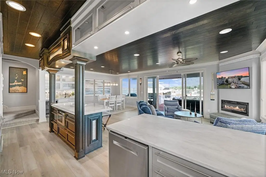 Stunning Waterfront Townhome on Catawba Island - 50' Dock Slip + Luxury Upgrades!Waterfront living at its best in this beautifully updated 3-level end-unit townhome in West Harbor, on Catawba Island. Includes a premium 50' dock slip (potential for additional dockage). Enjoy open-concept living with incredible water views, new luxury vinyl plank flooring (2023), and a spacious great room with fireplace that flows into a gourmet kitchen and dining area with wet bar - new beverage fridge. Two patio doors open to an oversized patio with awning steps from the water and your dock slip. Gourmet kitchen features bar seating, high-end appliances, and beautiful cabinetry/counters. Crown molding throughout main level and neutral color palette throughout. Second floor offers two bedrooms and a full hall bath. Spacious primary suite with balcony, two walk-in closets w/organizers, ensuite bath, and gorgeous views. Third floor includes a large bonus room with kitchenette, multiple sleeping areas, and full bath perfect for guests. Attached 2-car garage, half bath off foyer, ample storage. New since 2023: flooring, paint, light fixtures, AC, Wi Fi thermostats (all levels), R/O system, dishwasher, refrigerator. Close to CIC Club, Gem Beach, and island destinations. Optional furnishings with some exclusions. Don't miss this opportunity to live in Vacationland's premier waterfront community!