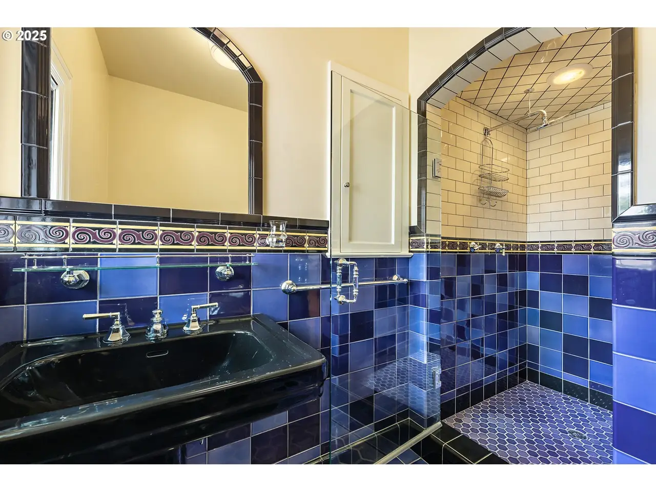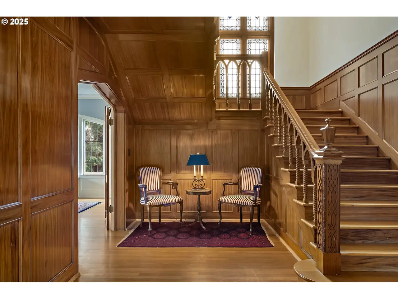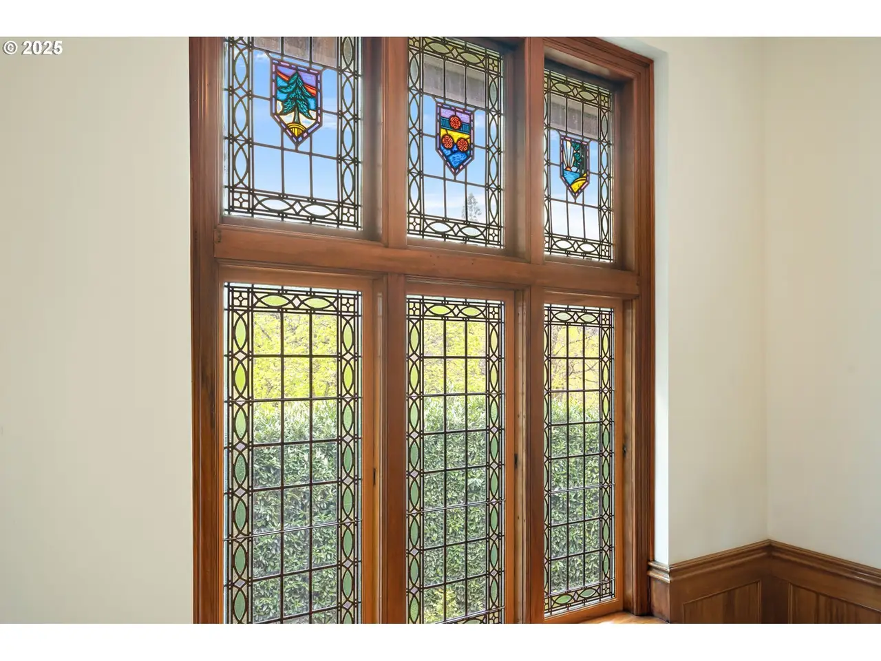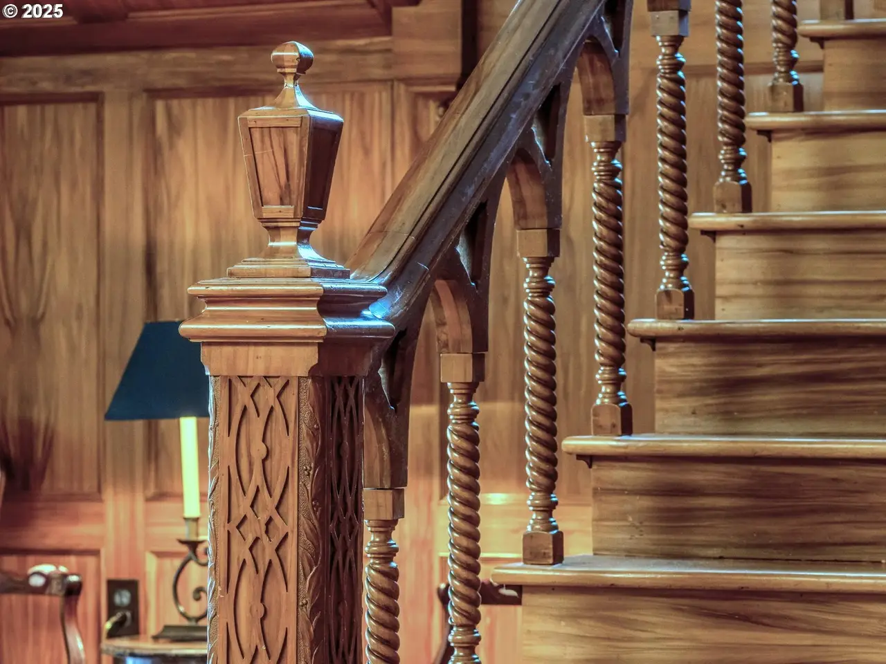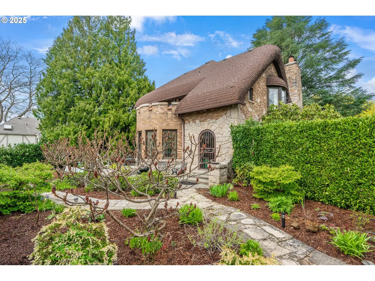 Yes, this is *that house*! Legendary Eastmoreland English Cottage with stunning stone, brick, & stucco exterior graced with an elaborate rolled roof. Pristine, honey-warm gumwood glows throughout the house, particularly astonishing in the fully paneled foyer and carved staircase/landing gallery with its three gorgeous leaded and stained glass windows. Designed for entertaining, the circular floor plan leads to a 20 x 25 living room with sculptural stone fireplace and French doors to a covered patio, expanding your gathering space. Explore the exquisite library with its vaulted ceilings, extensive built-ins, & cozy fireplace; greet the day in the brilliant morning room which is the lower level of the remarkable architectural turret. Period-sensitive, incredibly practical chef's kitchen w/handmade tile, pillowed marble flooring, granite countertops and island, huge gas range with pot-filler; carry your creations through to the long, gracious dining room where there is always room for one more at table. Everyone has their own retreat with four ensuite bedrooms on the second level, each with a delightful Art Deco-inspired Pratt & Larson full tile bath; the primary bedroom has a huge rooftop deck on top of the turret, with a beautiful view. The finished top level provides home office, media, game, & casual relaxation space, with its own heating/cooling system for ideal comfort. On the sleek, spacious lower level you'll find a wine cellar, storage, laundry, a bath with dog wash/gardener shower, & a full 1 BR/1BA apartment with its own entrance. The 14,900 SF lot provides gardening spaces as well as an extensive patio to enjoy the magisterial presence of the castle-like west side of the home. Shopping and dining are nearby in Woodstock and Sellwood/Moreland; you're also blocks from Eastmoreland Golf Course, Reed College, and MAX Orange Line.Located on a coveted street in SE Portland's premier destination neighborhood, this is more than a house: it's an experience. [Home Energy Score = 1]