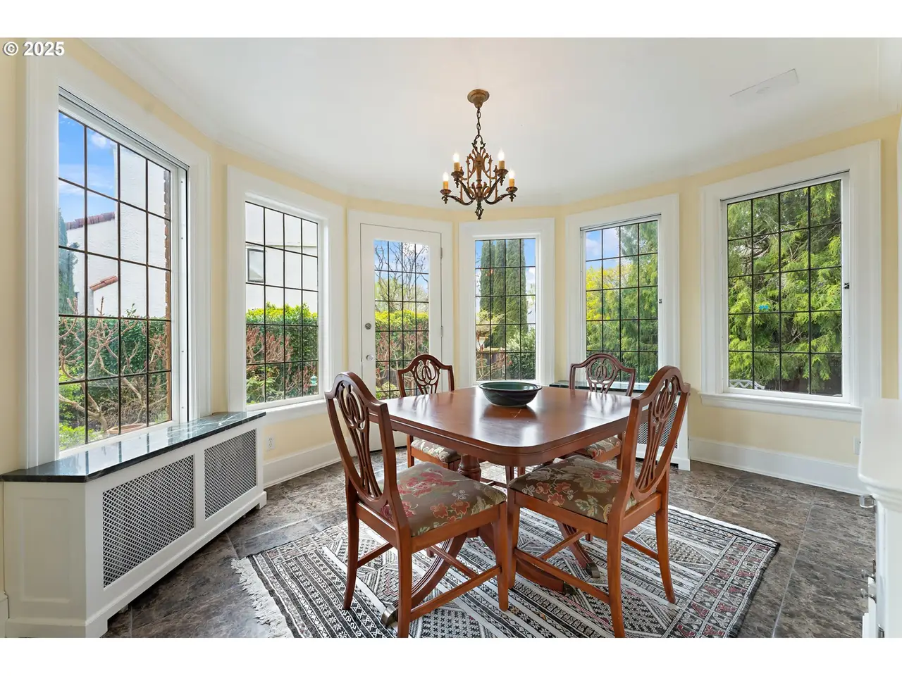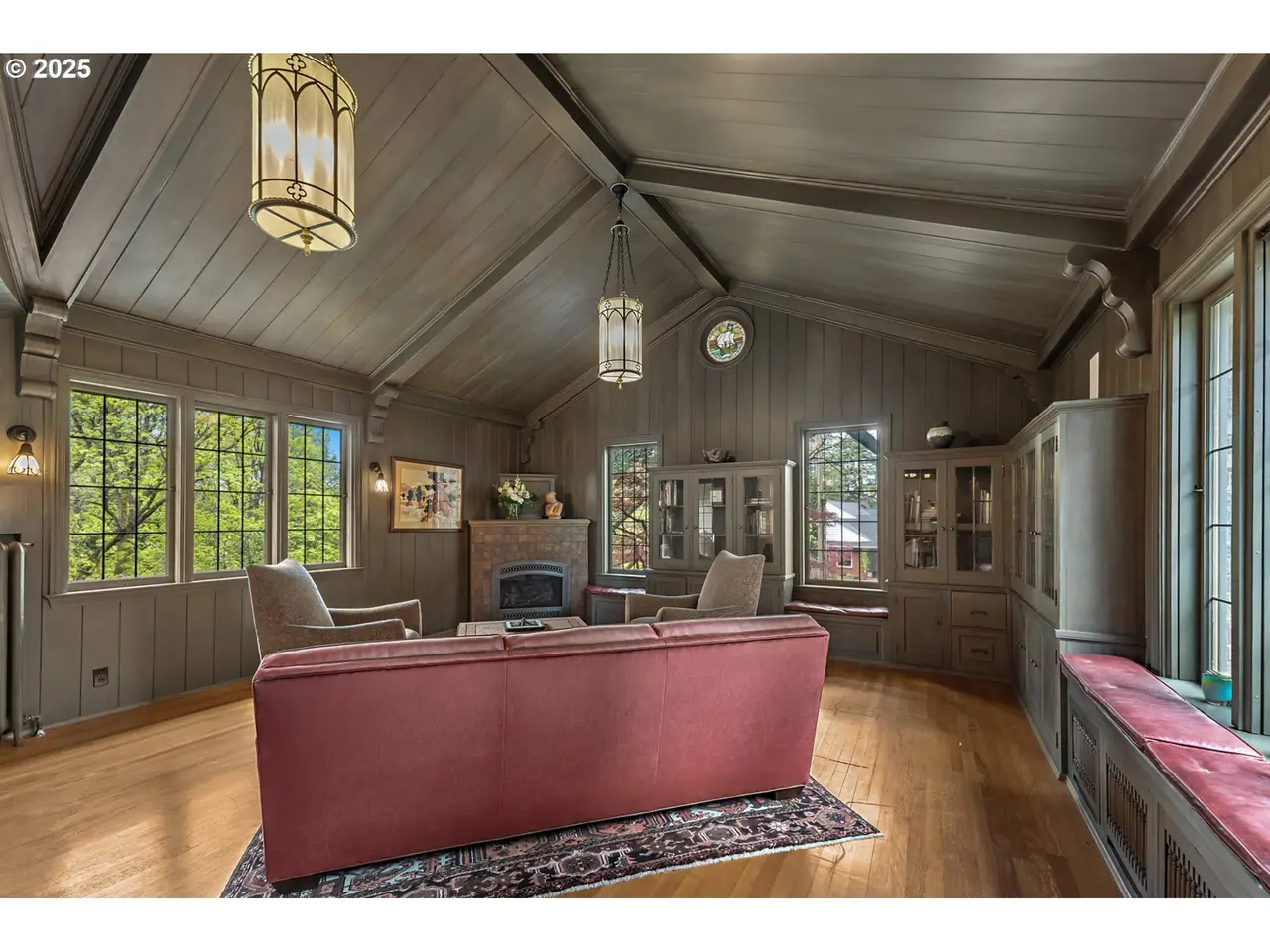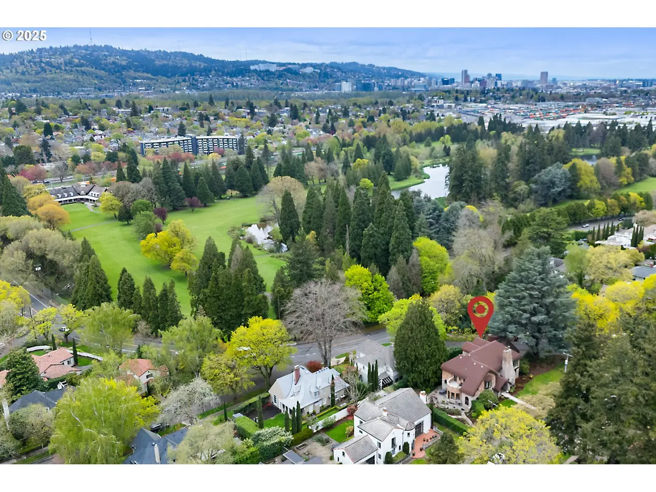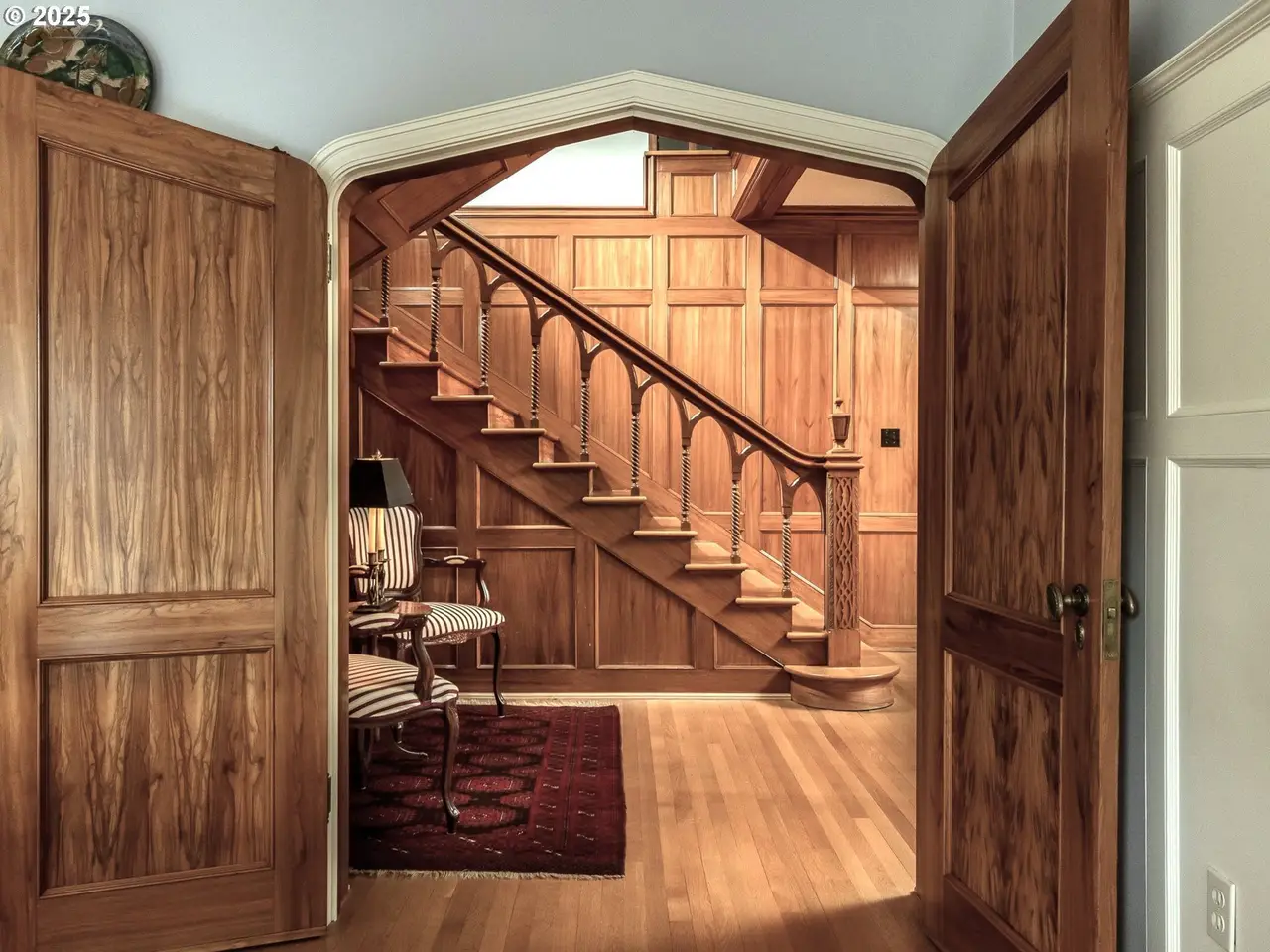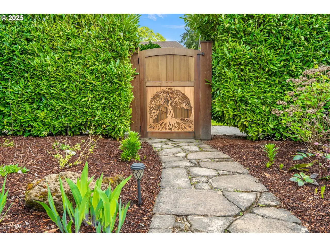 Yes, this is *that house*! Legendary Eastmoreland English Cottage with stunning stone, brick, & stucco exterior graced with an elaborate rolled roof. Pristine, honey-warm gumwood glows throughout the house, particularly astonishing in the fully paneled foyer and carved staircase/landing gallery with its three gorgeous leaded and stained glass windows. Designed for entertaining, the circular floor plan leads to a 20 x 25 living room with sculptural stone fireplace and French doors to a covered patio, expanding your gathering space. Explore the exquisite library with its vaulted ceilings, extensive built-ins, & cozy fireplace; greet the day in the brilliant morning room which is the lower level of the remarkable architectural turret. Period-sensitive, incredibly practical chef's kitchen w/handmade tile, pillowed marble flooring, granite countertops and island, huge gas range with pot-filler; carry your creations through to the long, gracious dining room where there is always room for one more at table. Everyone has their own retreat with four ensuite bedrooms on the second level, each with a delightful Art Deco-inspired Pratt & Larson full tile bath; the primary bedroom has a huge rooftop deck on top of the turret, with a beautiful view. The finished top level provides home office, media, game, & casual relaxation space, with its own heating/cooling system for ideal comfort. On the sleek, spacious lower level you'll find a wine cellar, storage, laundry, a bath with dog wash/gardener shower, & a full 1 BR/1BA apartment with its own entrance. The 14,900 SF lot provides gardening spaces as well as an extensive patio to enjoy the magisterial presence of the castle-like west side of the home. Shopping and dining are nearby in Woodstock and Sellwood/Moreland; you're also blocks from Eastmoreland Golf Course, Reed College, and MAX Orange Line.Located on a coveted street in SE Portland's premier destination neighborhood, this is more than a house: it's an experience. [Home Energy Score = 1]