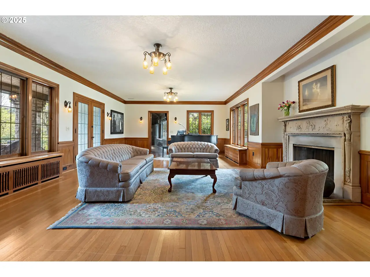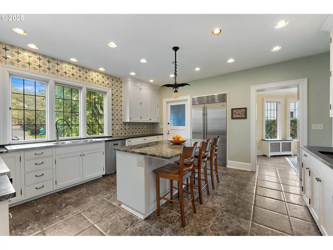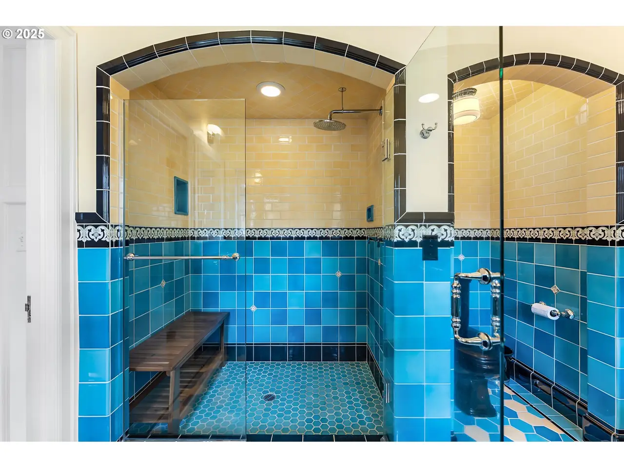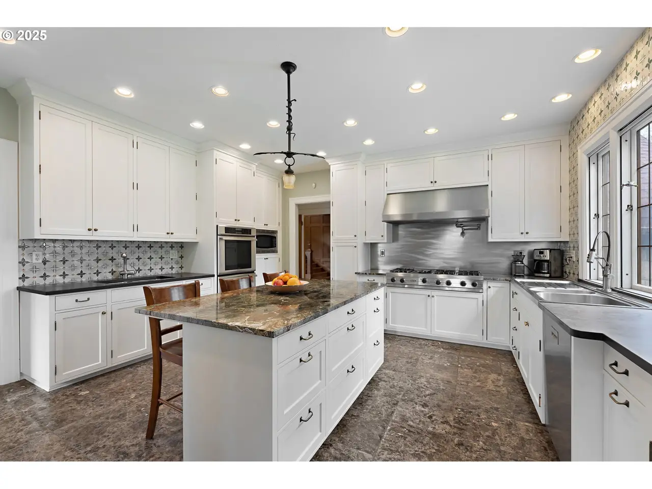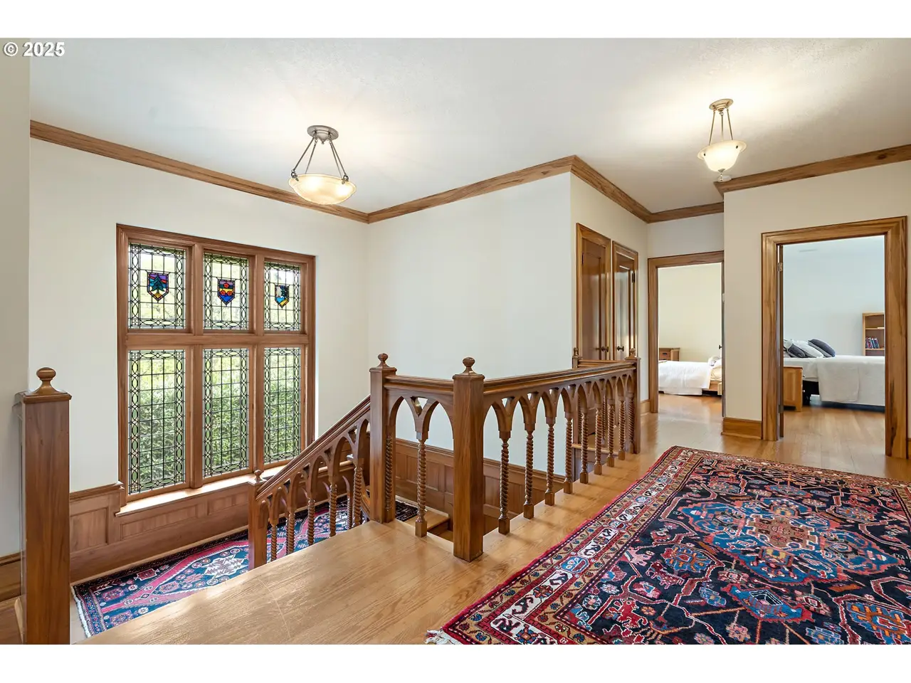 Yes, this is *that house*! Legendary Eastmoreland English Cottage with stunning stone, brick, & stucco exterior graced with an elaborate rolled roof. Pristine, honey-warm gumwood glows throughout the house, particularly astonishing in the fully paneled foyer and carved staircase/landing gallery with its three gorgeous leaded and stained glass windows. Designed for entertaining, the circular floor plan leads to a 20 x 25 living room with sculptural stone fireplace and French doors to a covered patio, expanding your gathering space. Explore the exquisite library with its vaulted ceilings, extensive built-ins, & cozy fireplace; greet the day in the brilliant morning room which is the lower level of the remarkable architectural turret. Period-sensitive, incredibly practical chef's kitchen w/handmade tile, pillowed marble flooring, granite countertops and island, huge gas range with pot-filler; carry your creations through to the long, gracious dining room where there is always room for one more at table. Everyone has their own retreat with four ensuite bedrooms on the second level, each with a delightful Art Deco-inspired Pratt & Larson full tile bath; the primary bedroom has a huge rooftop deck on top of the turret, with a beautiful view. The finished top level provides home office, media, game, & casual relaxation space, with its own heating/cooling system for ideal comfort. On the sleek, spacious lower level you'll find a wine cellar, storage, laundry, a bath with dog wash/gardener shower, & a full 1 BR/1BA apartment with its own entrance. The 14,900 SF lot provides gardening spaces as well as an extensive patio to enjoy the magisterial presence of the castle-like west side of the home. Shopping and dining are nearby in Woodstock and Sellwood/Moreland; you're also blocks from Eastmoreland Golf Course, Reed College, and MAX Orange Line.Located on a coveted street in SE Portland's premier destination neighborhood, this is more than a house: it's an experience. [Home Energy Score = 1]