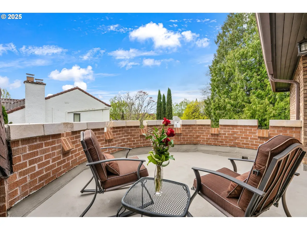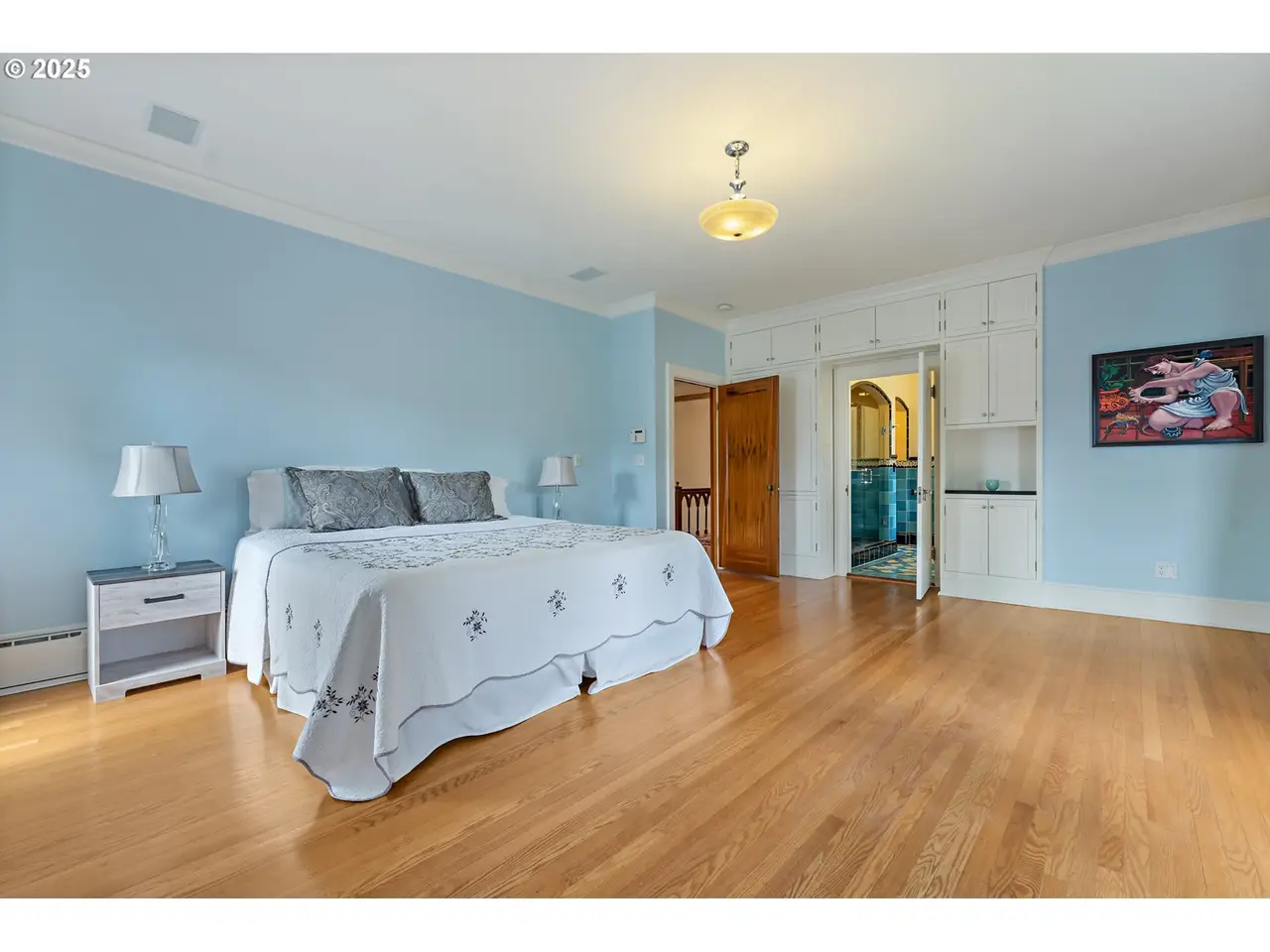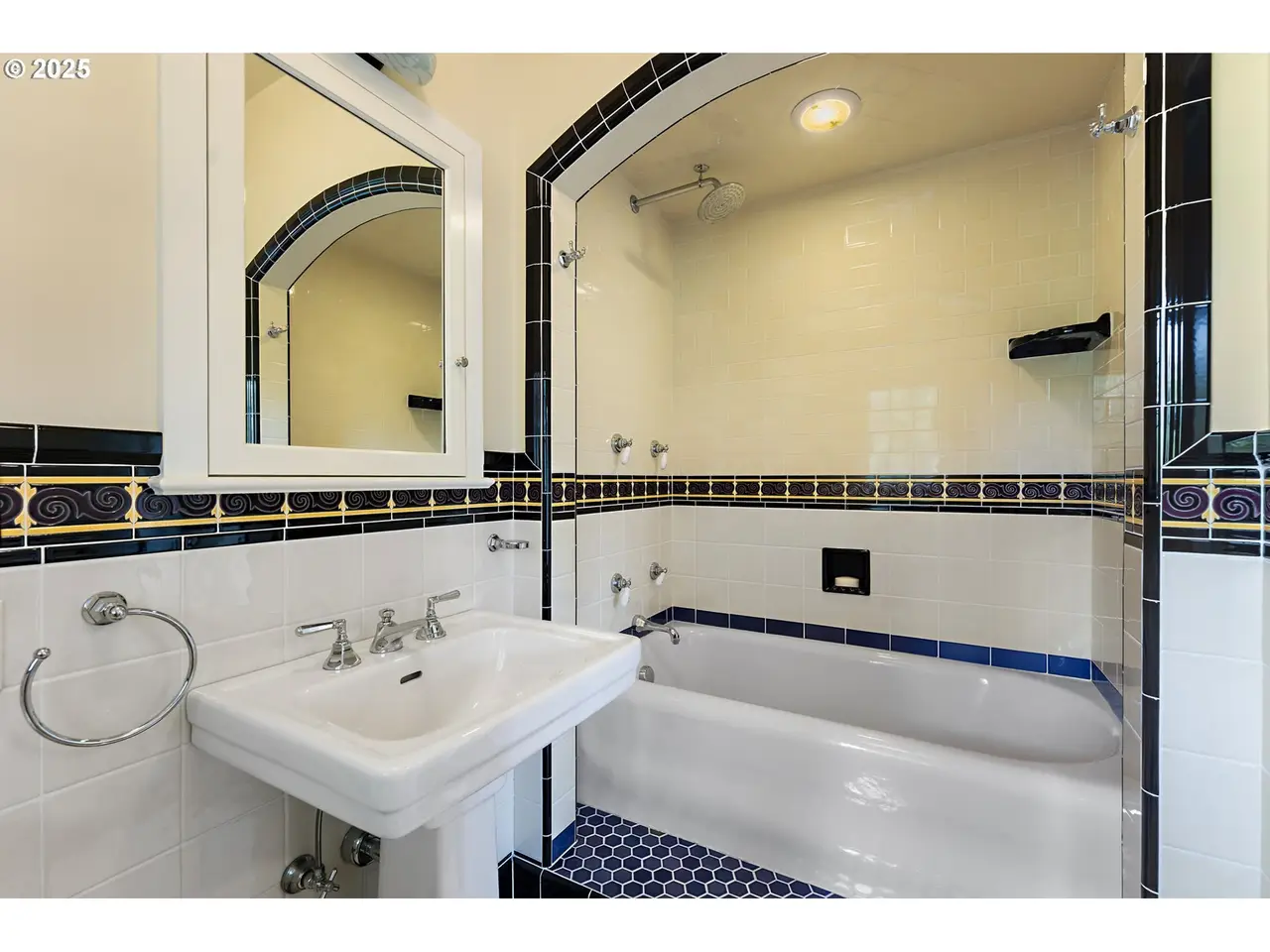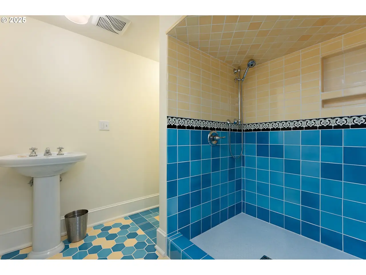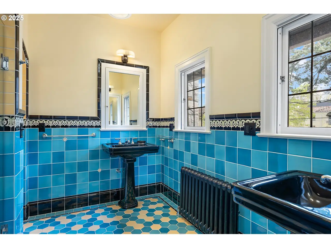 Yes, this is *that house*! Legendary Eastmoreland English Cottage with stunning stone, brick, & stucco exterior graced with an elaborate rolled roof. Pristine, honey-warm gumwood glows throughout the house, particularly astonishing in the fully paneled foyer and carved staircase/landing gallery with its three gorgeous leaded and stained glass windows. Designed for entertaining, the circular floor plan leads to a 20 x 25 living room with sculptural stone fireplace and French doors to a covered patio, expanding your gathering space. Explore the exquisite library with its vaulted ceilings, extensive built-ins, & cozy fireplace; greet the day in the brilliant morning room which is the lower level of the remarkable architectural turret. Period-sensitive, incredibly practical chef's kitchen w/handmade tile, pillowed marble flooring, granite countertops and island, huge gas range with pot-filler; carry your creations through to the long, gracious dining room where there is always room for one more at table. Everyone has their own retreat with four ensuite bedrooms on the second level, each with a delightful Art Deco-inspired Pratt & Larson full tile bath; the primary bedroom has a huge rooftop deck on top of the turret, with a beautiful view. The finished top level provides home office, media, game, & casual relaxation space, with its own heating/cooling system for ideal comfort. On the sleek, spacious lower level you'll find a wine cellar, storage, laundry, a bath with dog wash/gardener shower, & a full 1 BR/1BA apartment with its own entrance. The 14,900 SF lot provides gardening spaces as well as an extensive patio to enjoy the magisterial presence of the castle-like west side of the home. Shopping and dining are nearby in Woodstock and Sellwood/Moreland; you're also blocks from Eastmoreland Golf Course, Reed College, and MAX Orange Line.Located on a coveted street in SE Portland's premier destination neighborhood, this is more than a house: it's an experience. [Home Energy Score = 1]