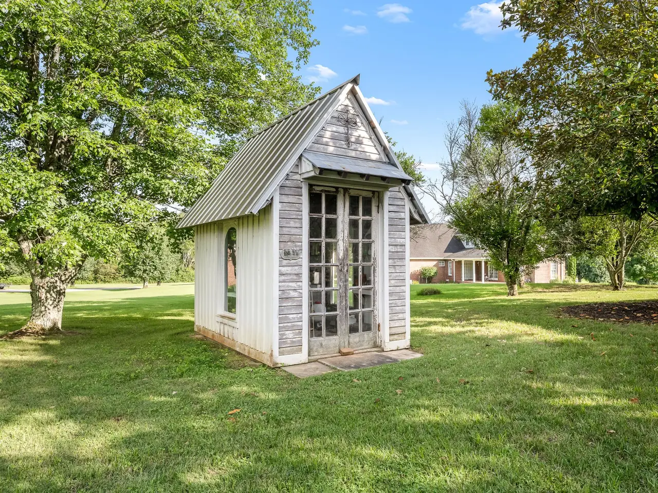 shower. Calming yoga studio above primary bath. The main house features 2 bedrooms & 2 baths plus the guest house features 1 bedroom &1 bath. Venture out to the breathtaking courtyard boasting picturesque landscaping, water fountain leading to the guest house.The guest house features American Chestnut floors, tall ceilings, and finely detailed bath, New ductless HVAC services guest house. On demand water heater(s) for main house & guest house. New landscaping, moonlighting, and irrigation system. 2 car carport. Potting shed and storage barn. All 4 gas fireplaces are operational with remote controls. Encapsulated crawl space with two commercial dehumidifiers. Main house is approx 3876 sq. ft. plus guest house is approx 672 sq. ft. Numerous amenities. Move-in ready.