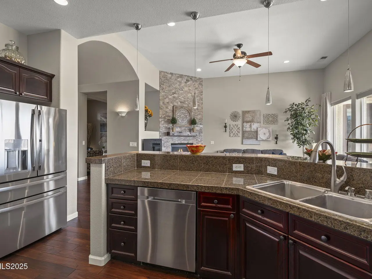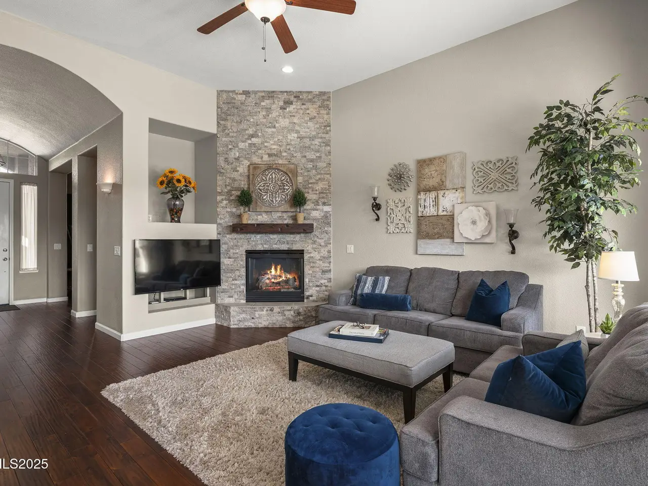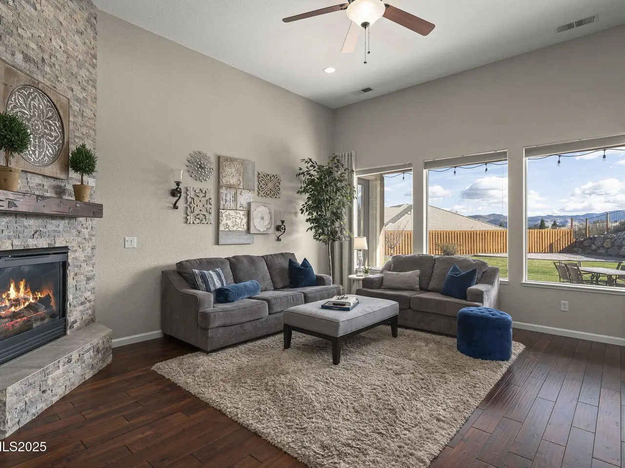Exquisite single-owner home located in the highly sought-after Grandview community in Southwest Vistas, known for its privacy, serenity, and beautiful mountain surroundings. This meticulously maintained residence showcases exceptional upgrades, elegant finishes, and thoughtful design throughout. Enter through an impressive 12-ft barrel ceiling foyer, which leads to the formal living and family room that have matching 12 ft ceilings; 10 ft ceilings are found throughout the rest of the home, which enhances the open, airy ambiance. Stunning hand-scraped, distressed Spanish Walnut solid wood flooring throughout the main living areas. The spacious living room features a striking stacked-stone fireplace with a distressed wood mantle, creating an impressive focal point. The formal dining room is adorned with luxurious grass cloth wallpaper, adding warmth and texture. Just steps away, the kitchen includes premium GE Profile appliances, upgraded granite countertops, cherrywood cabinetry, a newer faucet, a Samsung dishwasher, and a GE Profile microwave. Down the hallway, a dedicated computer station with custom built-in cabinetry adds valuable workspace and organization. Retreat to the luxurious main suite, complete with a large soaking tub, a walk-in shower, double vanities, and an impressive 14' L x 7' W walk-in closet. All bedrooms include plush, high-quality carpet with upgraded padding for added comfort. Additional bathrooms feature custom cherrywood vanities and cabinetry paired with upgraded fixtures. Upgraded tile flooring enhances one of the baths and the laundry room. The full bath, located at the northwest wing of the home, includes newly installed plumbing hardware in the tub/shower combination. Fresh interior paint complements the home's timeless finishes, while the exterior has been professionally repainted using durable Sherwin-Williams Elastomeric paint. All exterior lighting has been replaced, and select interior fixtures have been updated, including newer fan lights in the main bedroom and family room. The home also includes surround sound in the formal living, formal dining, great room, kitchen, primary bedroom and primary bathroom. There are exterior eve outlets available for those choosing to add their own holiday lights. Outside, enjoy beautifully maintained landscaping and mountain views, along with an expansive 1,231 sq. ft. garage featuring built-in shelving and an extended driveway accommodating six to seven vehicles. Additional updates include a water heater approximately 10 years old. This home reflects true pride of ownership, luxuriously upgraded, exceptionally maintained, and completely move-in ready. A rare offering in a quiet, private community.