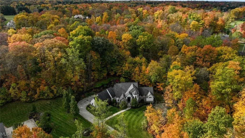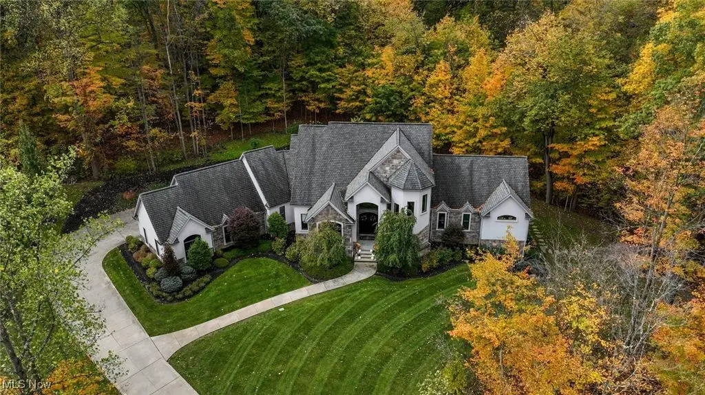 An oasis of luxury & tranquility by Ruggiero Builders. Nestled on 2 wooded acres w/ a gentle creek & sweeping natural views, this extraordinary custom built home combines elegance, comfort & superior craftsmanship. From the moment you step inside, the home's warmth & architectural detail unfold accented with spectacular Restoration Hardware lighting. As you enter, a grand great room is anchored by 2-sided stone fireplace, coffered ceilings & a wall off windows framing the scenic landscape. State-of-the-art kitchen boasts a generous granite island w/ breakfast bar, custom wood cabinetry & high-end appliances. This exceptional kitchen showcases an open floor plan that effortlessly connects the dining area/hearth room where a 2-sided fireplace adds warmth & character. Inviting sunroom w/dramatic vaulted ceiling & 3 walls of windows frame picturesque views of the outdoors. Designed for comfort, this layout creates a welcoming atmosphere. Retreat to the first floor primary suite, a serene haven w/ spa inspired glam bath, soaking tub, granite vanities, & walk-in glass shower. Oversized, custom walk-in closet, w/ his/her areas & built-ins. Adjacent library w/ rich millwork & double entry doors provides a perfect setting for work/relaxation. Upstairs, 3 large bedrooms offer privacy & comfort, incl. one ensuite & a well-appointed jack/jill bath. Walk-out lower level is designed for enjoyment/entertaining. Full wet bar w/ granite counters, wine coolers, & high-top seating for 12 boasts a game room, rec room, & gym designed for fun & relaxation. Half bath & wine storage complete this level. Take the fun outdoors & walk out to the yard & fire pit for cozy evenings. Outdoor living rivals the interior w/ a beautiful silver travertine patio for dining w/ built in grill, granite bar & gas fireplace table. The property is enhanced with integrated security & exterior cameras. This is more than a place to live-it's a place to create memories, unwind in style & live your best life!