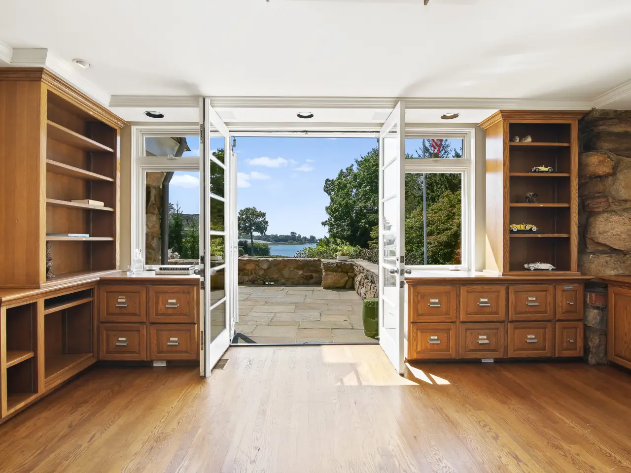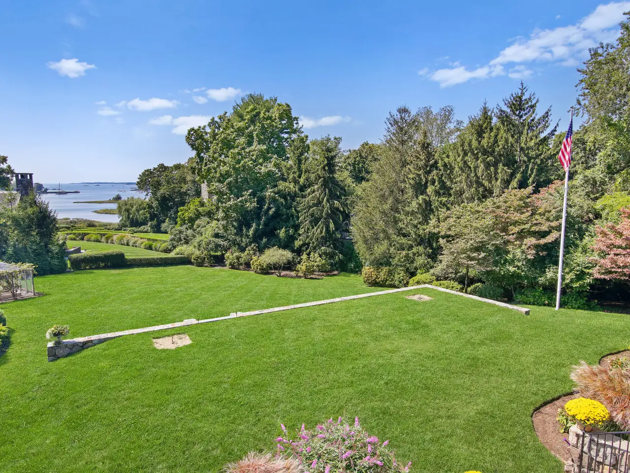 Overlooking Long Island Sound and the NYC skyline, this extraordinary Riverside estate sits on 1.35 acres at the end of a quiet, tree-lined cul-de-sac. Offering breathtaking, unobstructed water views from nearly every room, the three-story Colonial home blends timeless coastal charm with modern luxury. Completely renovated in 2022 and thoughtfully updated over the years, the main house features a sun-drenched interior designed by Gregory McGuire, with elegant architectural details. A grand foyer with intricate woodwork and living room share a double sided fireplace; office with built-ins and French doors to terrace overlooking the Sound. The gourmet kitchen flows seamlessly into the family room and outdoor seating area, perfect for both entertaining and everyday living. Spacious primary suite offers a private balcony, dual walk-in closets, a dressing room, and a spa bath. The top floor features a bright studio or gym space with potential for an additional bath. Elevator provides easy access across three levels. The professionally landscaped grounds feature a resort-style pool with waterfall and spa, outdoor kitchen, vegetable garden, horseshoe court, flagpole, and multiple terraces for enjoying the views. Separate pool house complete with family room, kitchen, bedroom, office, full bath, and a second laundry. Only two families have ever owned this remarkable home, with deeded water access and luxurious amenities in a prime Riverside location. Main house is 5,842 sqft. Cottage is 735 sqft.