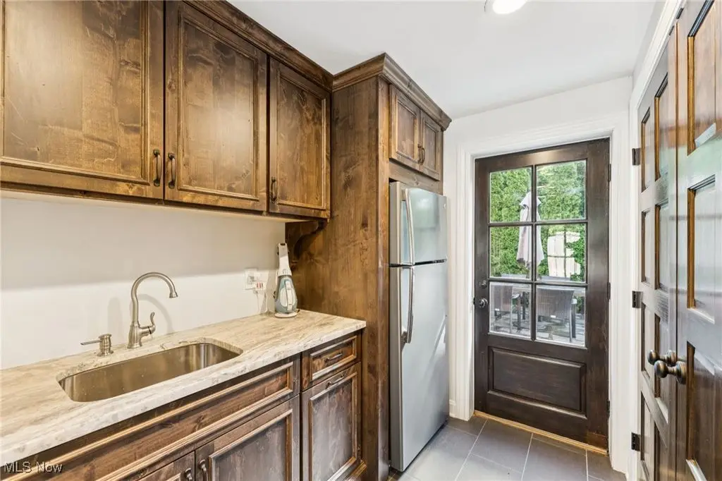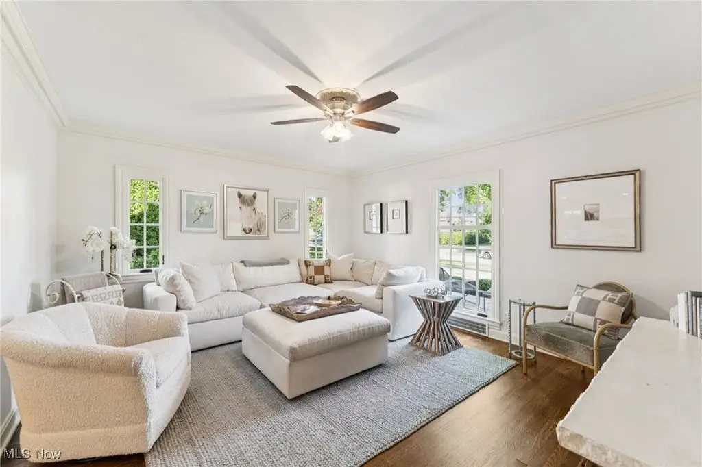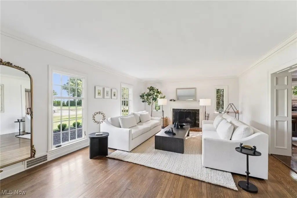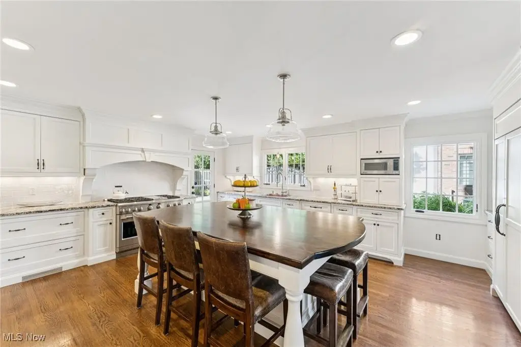 Welcome to a truly exceptional residence on one of Rocky River's most prestigious and sought-after streets. Recently refreshed with modern finishes, an open-concept floor plan, fresh paint, and new landscaping, this home effortlessly blends timeless architecture with today's style and comfort. What truly sets this property apart is its rare position on the coveted south side of the street a vantage point that offers unique sightlines and serene views of Lake Erie. Opportunities to own a home with this location and these views are seldom available, making it a truly special offering. Inside, rich hardwood floors, intricate millwork, and multiple fireplaces highlight the home's historic charm. Sun-filled formal living room and family room sets the stage for gatherings, while the office with French doors opening to a lovely patio offers a private spot to work. The outdoor space is complete with a built-in grill and cooking station, ideal for summer evenings. At the heart of the home is a stunning Amish-built kitchen, featuring a massive island that seats seven, state-of-the-art appliances, and custom baking/coffee stations. Just off the kitchen, a thoughtfully designed mudroom includes a walk-in pantry, wet bar, and plenty of space to stay organized. Upstairs, the serene primary suite is a true retreat with a domed ceiling, fireplace, spa-like bath, and tranquil lake views. Two additional bedrooms share a Jack and Jill bath, while a spacious office/media room offers flexibility. The third floor provides two charming bedrooms and a full bath perfect for teens or guests. The finished lower level adds another fireplace and large rec room for movie nights or casual entertaining. With its stately brick exterior, slate roof, meticulous landscaping, and its rare, highly desirable location offering elevated views, this residence combines old-world craftsmanship with modern updates appealing to the most discerning buyer who values both sophistication and exclusivity.