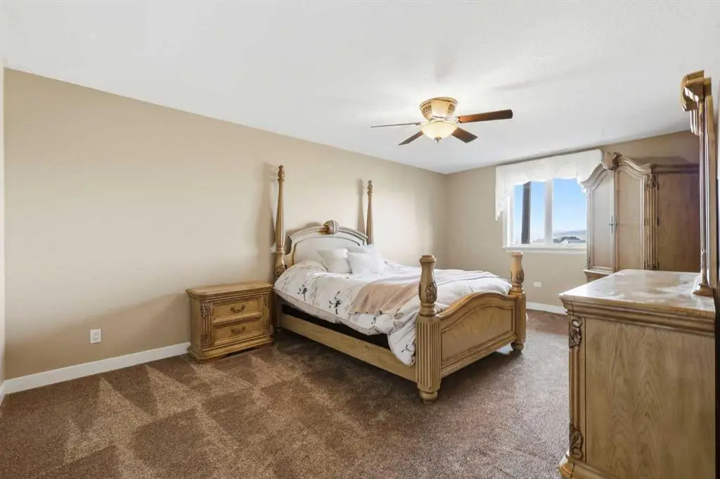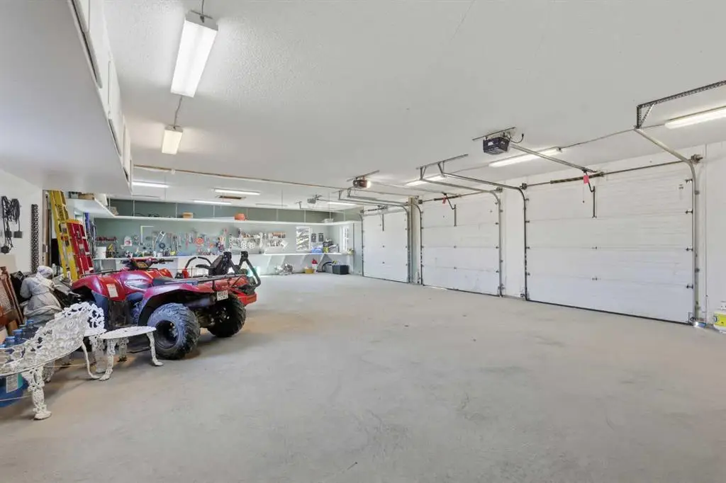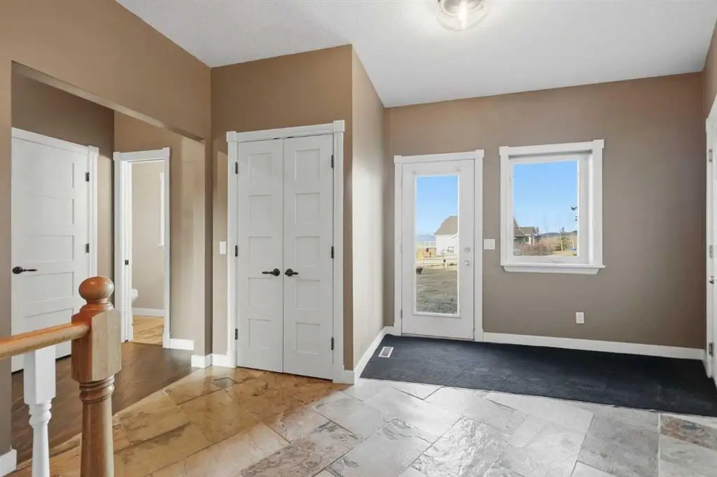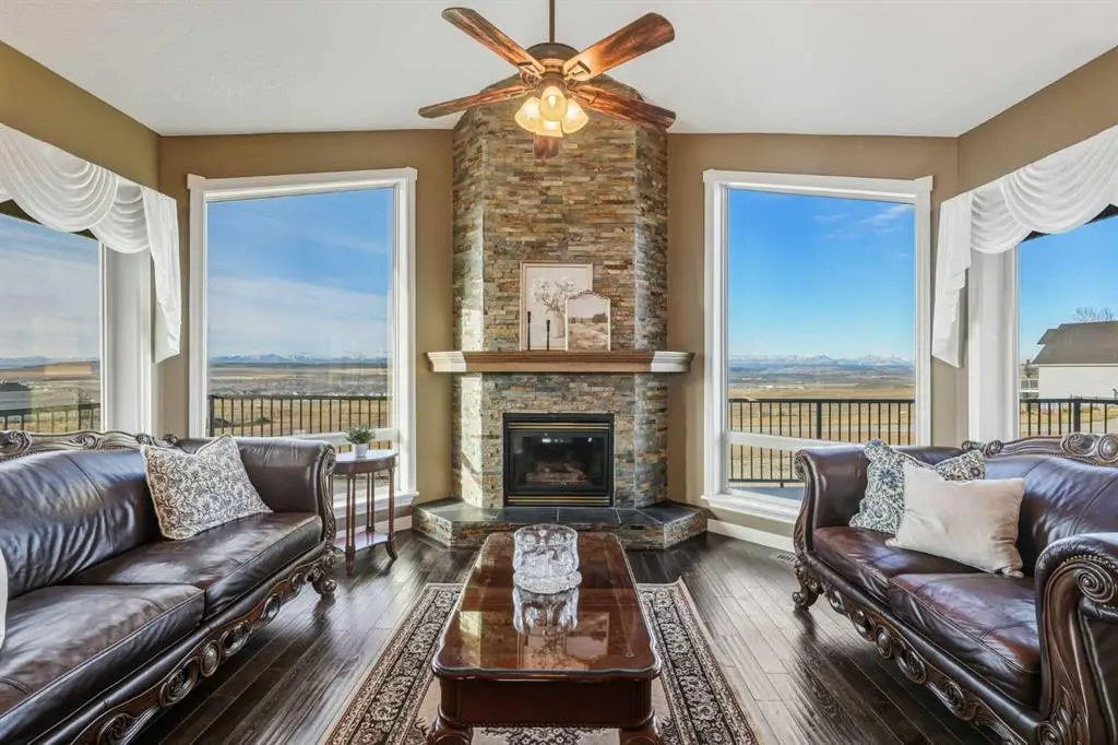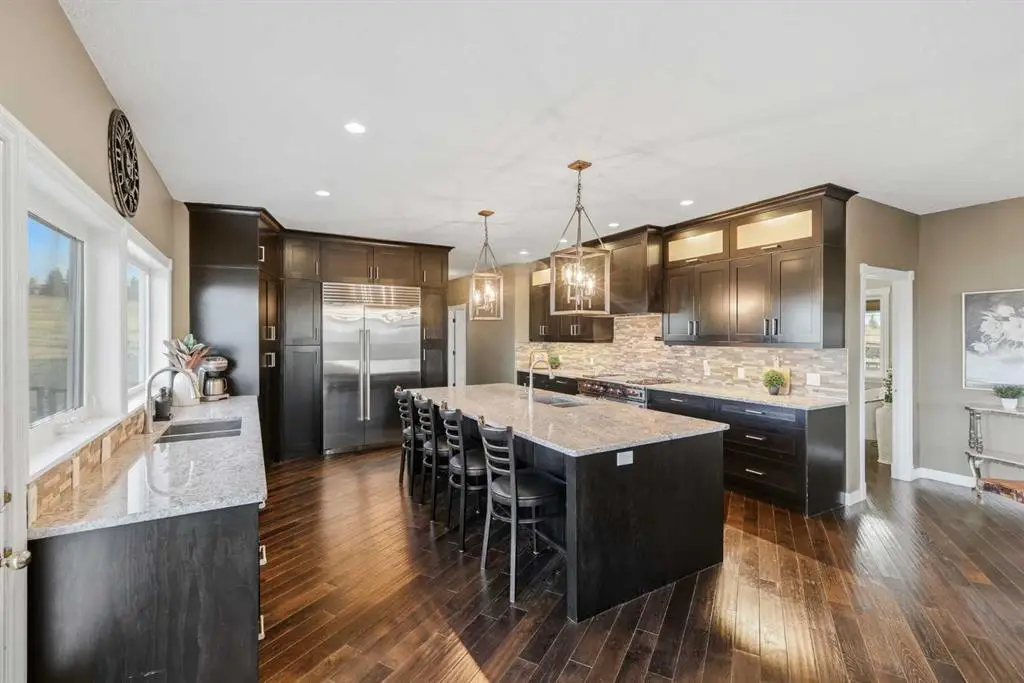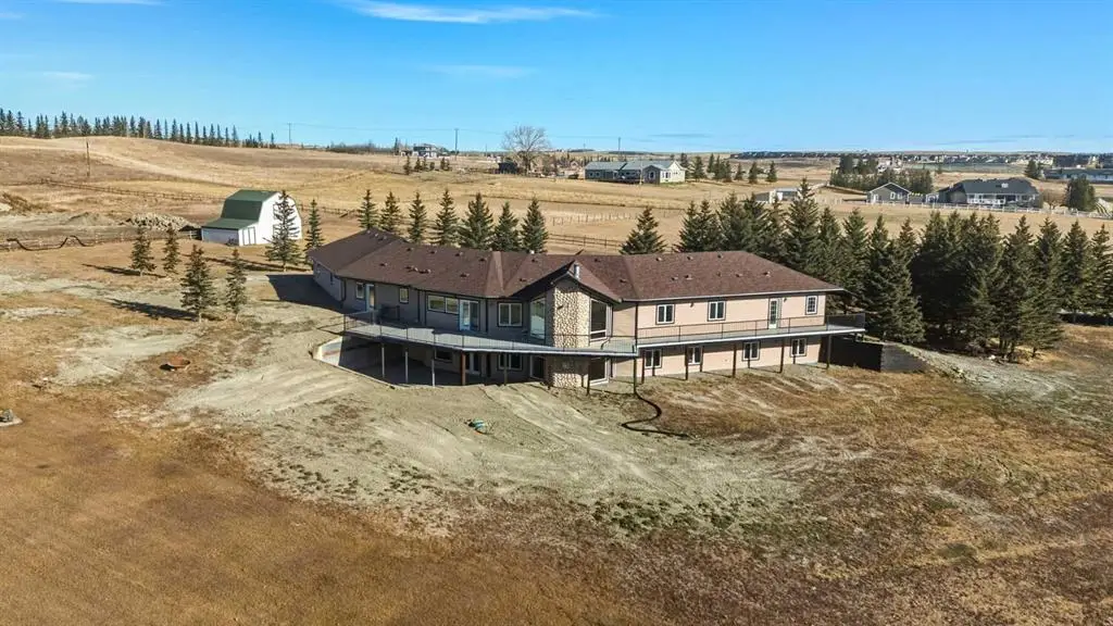 This stunning 4.41-acre property presents an exceptional opportunity to own a picturesque parcel of land with sweeping mountain views and a beautifully designed walkout bungalow. Nestled at the end of a serene, tree-lined drive, the home exudes timeless country charm with its sprawling layout, expansive wrap-around deck, and triple car garage — perfectly combining peaceful rural living with the convenience of being just minutes from Cochrane. Step inside the large front foyer, where vaulted ceilings immediately impress. The living room is a showpiece, centered around a dramatic floor-to-ceiling stone fireplace, with windows perfectly framing the breathtaking Rocky Mountain views. The spacious dining room is ideal for entertaining family and friends, offering ample space for large gatherings while enjoying the open-concept flow and natural light throughout. The chef-inspired kitchen is a standout, featuring a Wolf gas stove, Sub-Zero fridge, dual dishwashers, custom range hood, pot filler, and expansive granite countertops — perfect for both cooking and entertaining. A convenient office just off the kitchen provides a quiet workspace or flexible area. The primary suite is a tranquil retreat with spacious walk-in closets complete with organizers and private access to the west-facing deck. The ensuite bathroom is luxurious and spa-like, with double sinks, granite countertops, a large soaker tub, and a favorite feature of the current owners — an incredible steam shower. Two additional bedrooms and a full bathroom complete this wing of the home. The mudroom is highly functional, offering a half bath, laundry room with sink, and plenty of cabinetry and storage space. The attached triple garage is set up for both workshop and parking needs and is roughed in for in-floor heating and a future sink. Downstairs, the walkout basement continues to impress with a gas fireplace that anchors the space and creates a welcoming atmosphere. The expansive recreation area offers endless options — from a home gym to games or family entertaining space — all finished with durable slate flooring. The family room is perfect for movie nights or cozy evenings in. Two additional bedrooms and a full bathroom complete the lower level. Step outside to the covered patio with beautifully finished exposed aggregate concrete off the lower walkout — a generous outdoor space with room for a hot tub, sauna, or your dream outdoor living setup, all while enjoying awe-inspiring views! This home has seen thoughtful upgrades, including a new roof (2022), full replacement of poly-B plumbing, a water filtration system, a new electrical panel, a new concrete garage floor with rough-in for in-floor heating, a utility sink and a new concrete driveway apron. This exceptional property, complete with a barn, room for animals, and stunning mountain vistas, balances timeless country allure with comfort, functionality, and the perfect setting for family life. Schedule your private tour today!