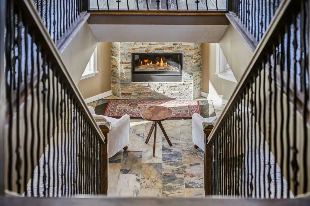 • Dramatic stone fireplace