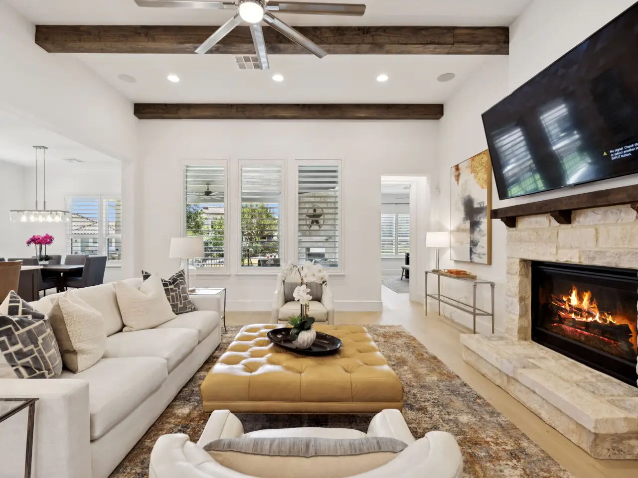 Step into modern luxury in the exclusive gated community of Palacios at Cibolo Canyons where timeless elegance meets modern convenience. Bathed in natural light, this home greets you with wide-plank wood floors, soaring ceilings, and an effortless flow designed for both refined entertaining and everyday living. A stately study with custom built-ins offers the perfect retreat, while the expansive kitchen is a chef’s dream - featuring stainless steel appliances, a six-burner gas stove with griddle, and a WiFi-controlled oven. The kitchen opens to a striking dining space, complemented by a large wet bar and floor-to-ceiling mirrors, creating a setting that feels equal parts chic and inviting. The primary suite is a sanctuary, showcasing a spa-inspired bathroom with dual vanities and an oversized walkthrough shower. The space leads out to a small garage that could easily be turned into a home gym. Three spacious secondary bedrooms, each with its own ensuite, ensure privacy and comfort for family or guests. A private media room completes the home-ideal for movie nights or game-day gatherings. Step outside on the back porch for an evening by the fire and outdoor kitchen. This home isn't just beautiful, it's built smart - with energy-efficient foam insulation and water-saving low-flow fixtures blending sustainability with sophistication. Enjoy two amenity centers, two adult pools, a kiddy pool with a splash pad and lazy river, fitness center, event space, and miles of paved walking/biking trails. Only one mile from the JW Marriott & TPC San Antonio and only two miles from restaurants and shopping. Come see what this beautiful home and community have to offer!