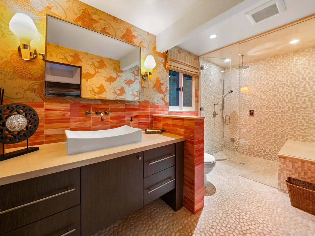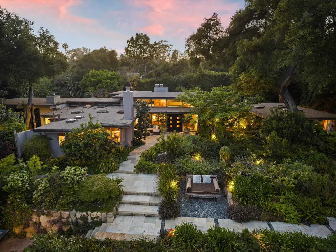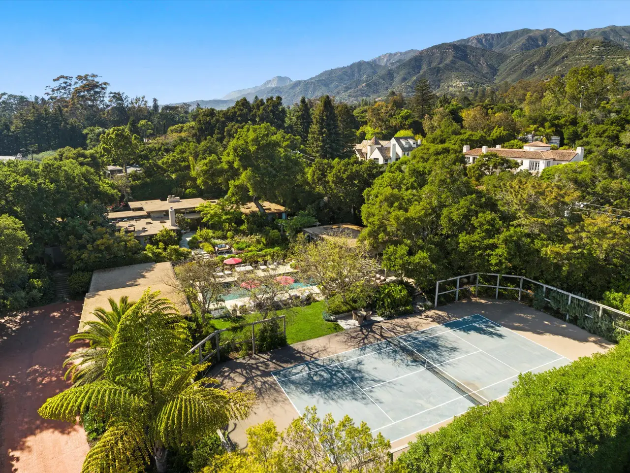 A Private Zen Retreat in the Heart of Montecito Tucked behind gates on a peaceful lane, this single-level Mid-Century estate is a tranquil sanctuary where nature and luxury converge. Lush tropical landscaping, curated pathways, and serene outdoor moments create a resort-like atmosphere. Inside, soaring ceilings and walls of glass frame garden views, while a chef's kitchen, dramatic agate fireplace, and seamless indoor-outdoor flow elevate everyday living. The spa-inspired primary suite features radiant heated floors, steam shower, ceiling-fill soaking tub, and private garden with hot tub and outdoor shower. Two additional en-suite bedrooms and two offices offer flexibility and comfort. A sparkling pool, modern cabana with bar and home theatre, outdoor kitchen, tennis court, and smart home systems complete this exceptional retreat. Experience the ultimate Montecito lifestyle private, peaceful, and unforgettable. This Shangri-La is waiting for you!