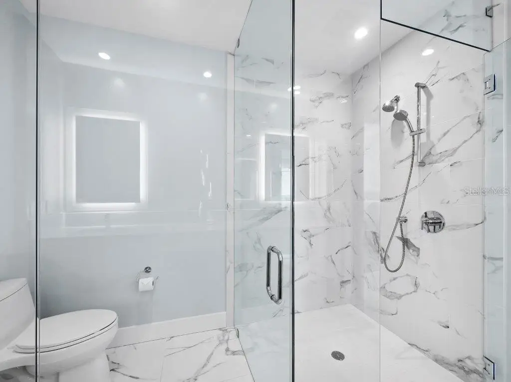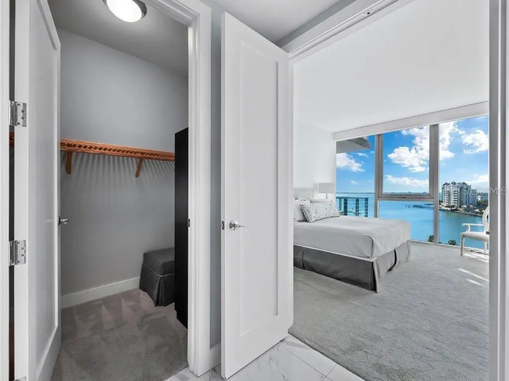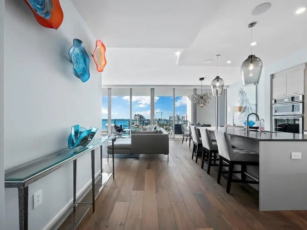 A fabulously appointed designer residence in a coveted, amenity-rich building, VUE 703 offers the pinnacle of luxury living in the heart of Sarasota's cosmopolitan downtown. Now available turnkey with luxury furnishings and accessories. Renowned for its exceptional resort-style living and elegant contemporary style, VUE is an incredible high-rise building with enviably curated amenities that extend from the valet service and concierge to plush resident lounges and facilities, all within steps of Sarasota's world-class cultural scene and thriving hub of shops, restaurants, and galleries. This elevated residence with private elevator access is a spacious retreat that blends the sleek modern style of the building with exquisite design elements that lend warmth and enhance the luxurious comfort. Premium upgrades include elegant wide-plank wood floors, designer lighting and decor-both by Creston; high-end built-in audio video system, water filtration by Aqua, while tall 10" ceilings throughout accentuate absolutely stunning water views. From the front door, unobstructed site lines showcase spectacular southwest vistas across Sarasota Bay and the keys to the Gulf of Mexico beyond. Thoughtfully designed to maximize the views, the home features an airy, open layout with a full wall of floor-to-ceiling sliding impact glass doors that extend the central living space to a deep private terrace with glass railings. Overlooking the dining and central living spaces, the gourmet kitchen with beautiful Italian cabinetry and stainless appliances wraps around a large quartz-clad island with abundant prep and storage space as well as additional seating for guests. The open plan living room and dining area are perfect for entertaining, flowing seamlessly to a private terrace that spans nearly 300 square feet with protective shade and picture-perfect views overlooking the waterfront and marina. The owner's suite enjoys its own floor-to-ceiling wall of windows for spectacular water and sunset views, with a resort-style bathroom that features extra-long double vanity, enviable storage, glass-enclosed walk-in shower, and separate water closet. Two separate walk-in closets add to the owner's luxury. Near the home's entry, a spacious second bedroom offers en suite comfort and ample closet space, and a separate den accommodates a private office or media lounge. The additional half bath is luxuriously outfitted with haute design elements including crystal sconces and a carved onyx sink. A generous, separate utility room with washer and dryer adds to the exceptional in-home conveniences. The residence comes with deeded, secure storage space and two assigned parking spaces that are gated and enclosed. Ideally located across from Sarasota's celebrated waterfront and within steps of Downtown's cosmopolitan core, VUE is a highly sought after address with a dazzling array of premium amenities including heated pool and spa with a spectacular pool deck that encompasses multiple lounge areas, fire pit, and enormous pergola with gourmet grill station. Additional amenities include fitness center, dedicated pet recreational area, concierge and security. Offered by the original owners, meticulously maintained and upgraded, VUE 703 is a valuable opportunity to enjoy a lifestyle of ultimate comfort and style.