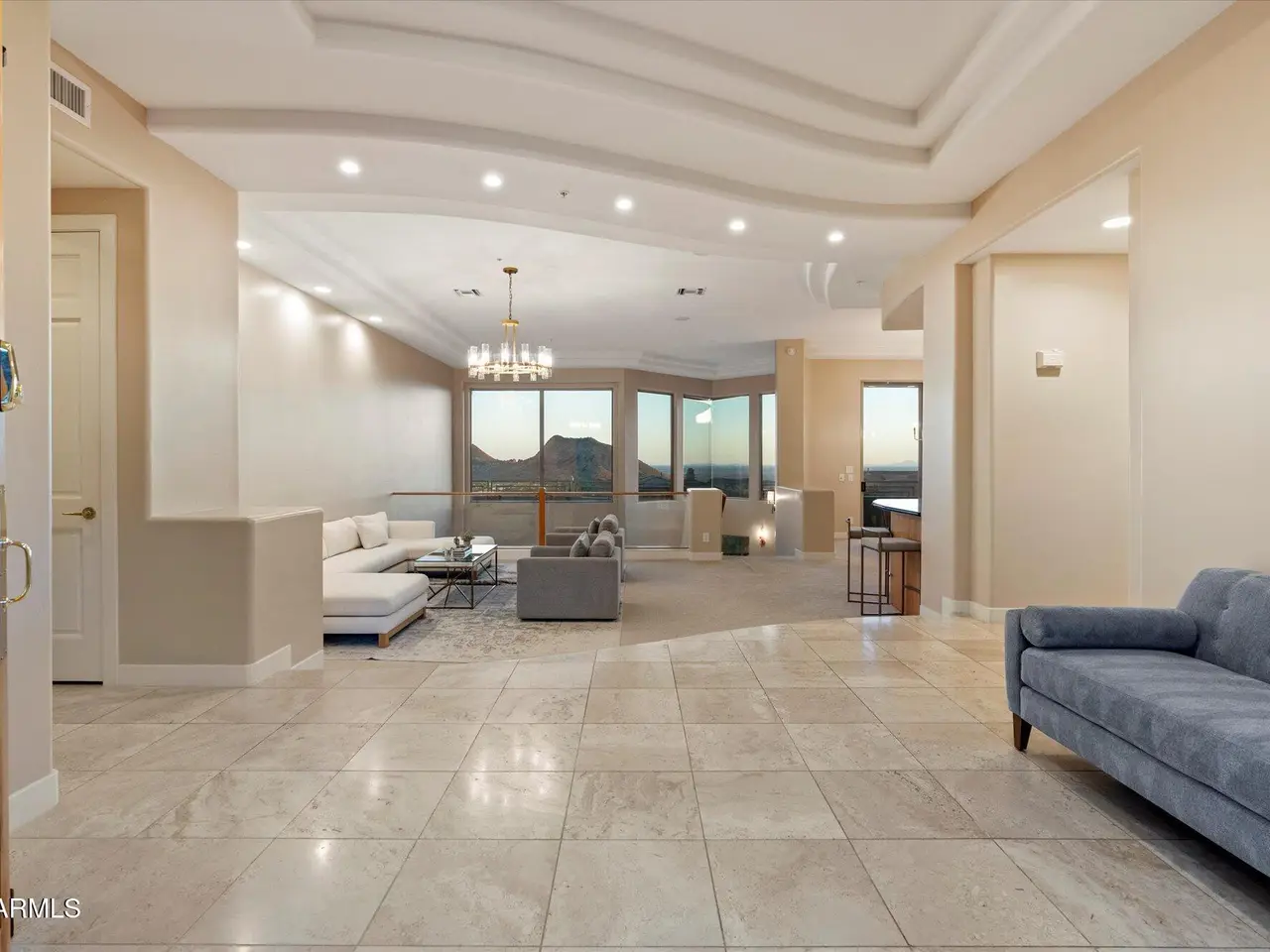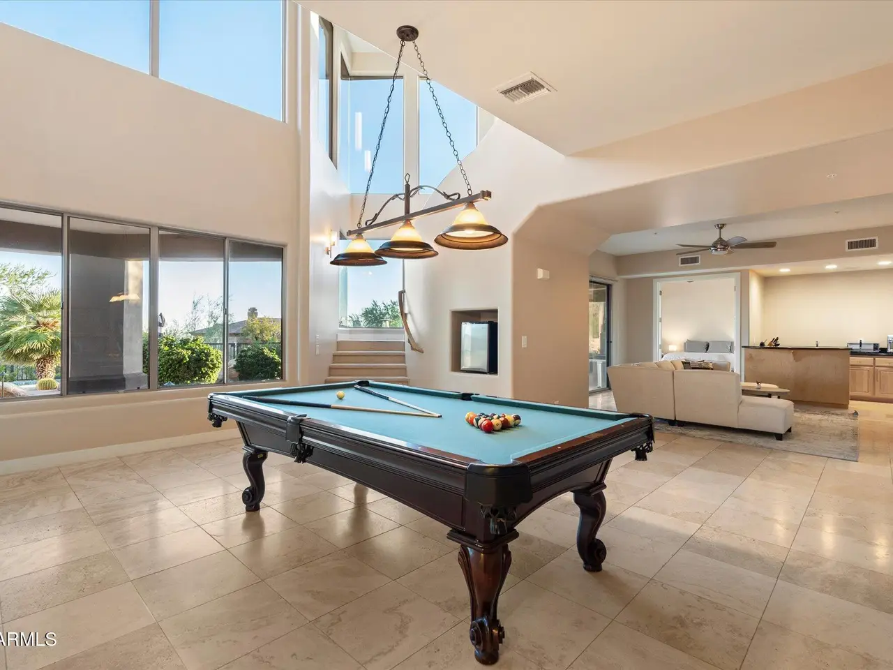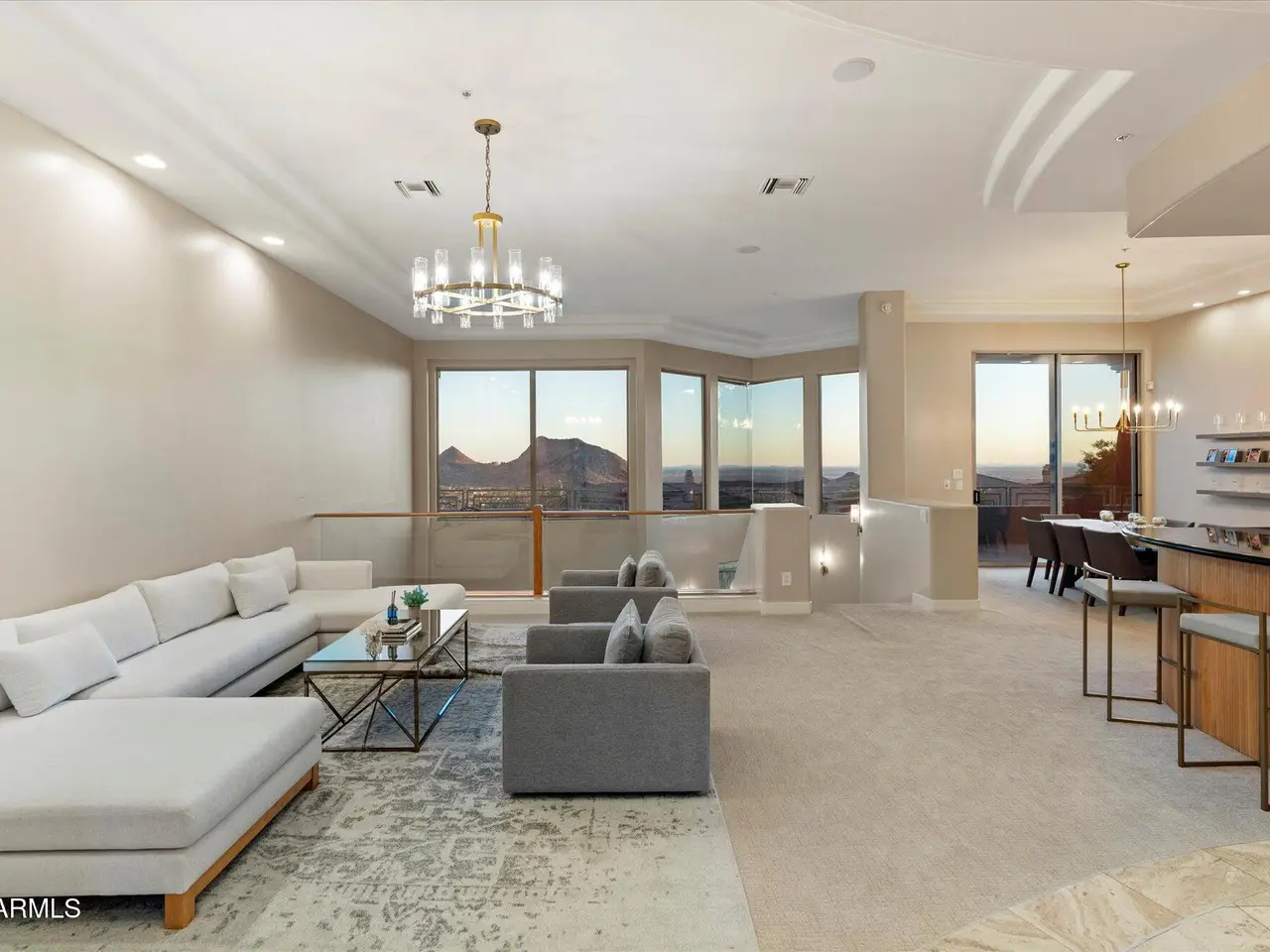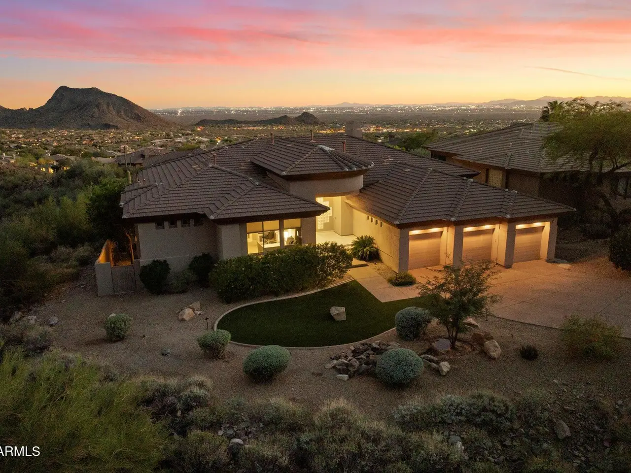 Panoramic city light and mountain views on incredibly private mountainside lot with neighbor only on one side, huge canyon/NAOS on other side. As you enter, there are expansive walls of tinted glass with automated sunscreens that open to decks. Lives like a single level home with kitchen, family room, living and dining room, powder room, bar, office, tinted windows master suite and laundry on entry level. Lower walk out level has 2 bedrooms with ensuite baths, another powder room, game room, media area and second wet bar! Gourmet kitchen with updated range, double ovens and wine cooler. Master suite has its own deck! Entertaining backyard with negative edge pool and spa, swim up bar, BBQ, fireplace and flagstone patios.