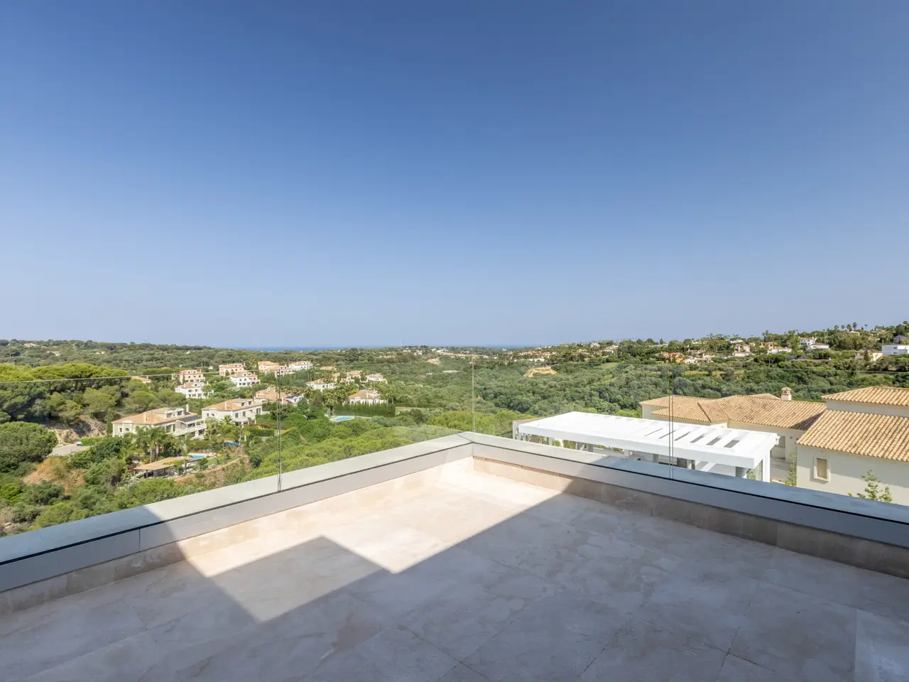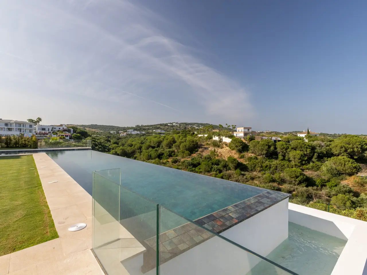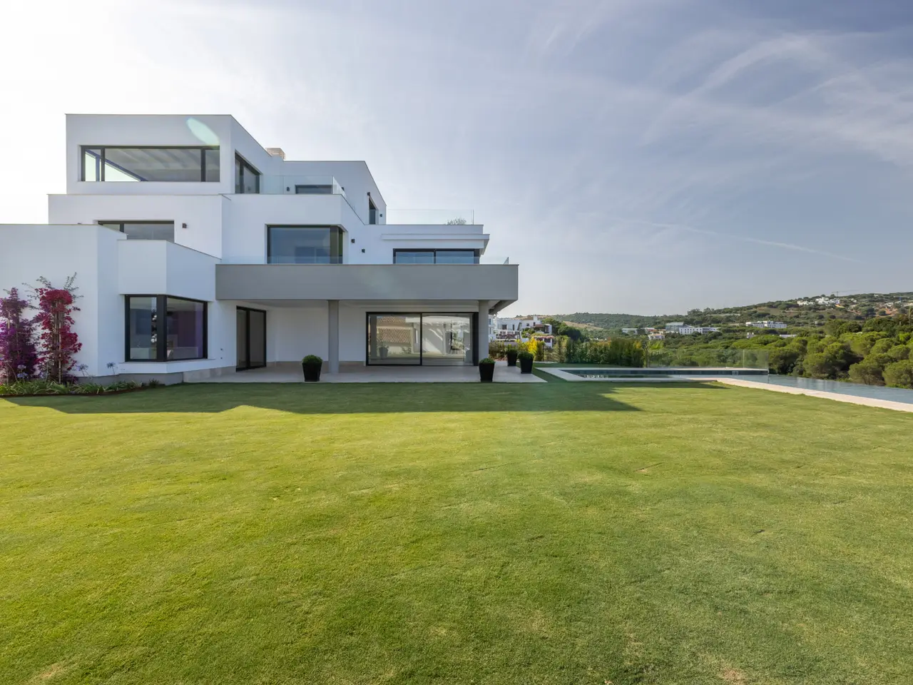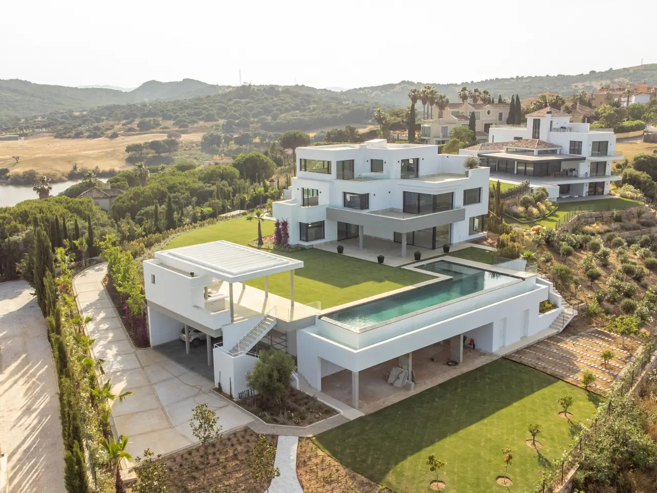 This incredible, recently built villa, located in a highly sought-after area, stands out for its spacious interiors, modern design, and spectacular panoramic views of the golf course, sea, and mountains. The villa sits on a generous 3,765 m² plot, offering a built area of 1,326 m² and an interior space of 920 m², complemented by a total of 308 m² of terraces and porches. The property features six bedrooms, seven full bathrooms, and an additional guest toilet, ensuring maximum comfort and privacy. Each room has been designed to provide brightness and spaciousness, and the property includes features such as underfloor heating throughout, air conditioning, central heating, smart home automation systems, and aerothermal technology. The layout also comprises a guest apartment, office, dressing room, main living room with fireplace, and several terraces (both covered and uncovered), including a solarium with breathtaking views. The exterior captivates with a meticulously maintained private garden, automatic irrigation system, and an impressive infinity pool that blends seamlessly with the landscape. The outdoor kitchen, fully equipped under a pergola, is ideal for enjoying barbecues and outdoor gatherings. The villa, located in a gated community with 24-hour security service, also boasts a private garage, storage room, elevator, accessible entrance for people with reduced mobility, and high-end finishes such as wooden floors and electric blinds. Thanks to its proximity to golf courses, the sea, marina, shops, schools, and all the amenities of Sotogrande, this villa represents a unique opportunity for those seeking exclusivity, privacy, and unparalleled views in one of the best residential areas of the Costa del Sol. Do not miss this opportunity and contact us for more information.