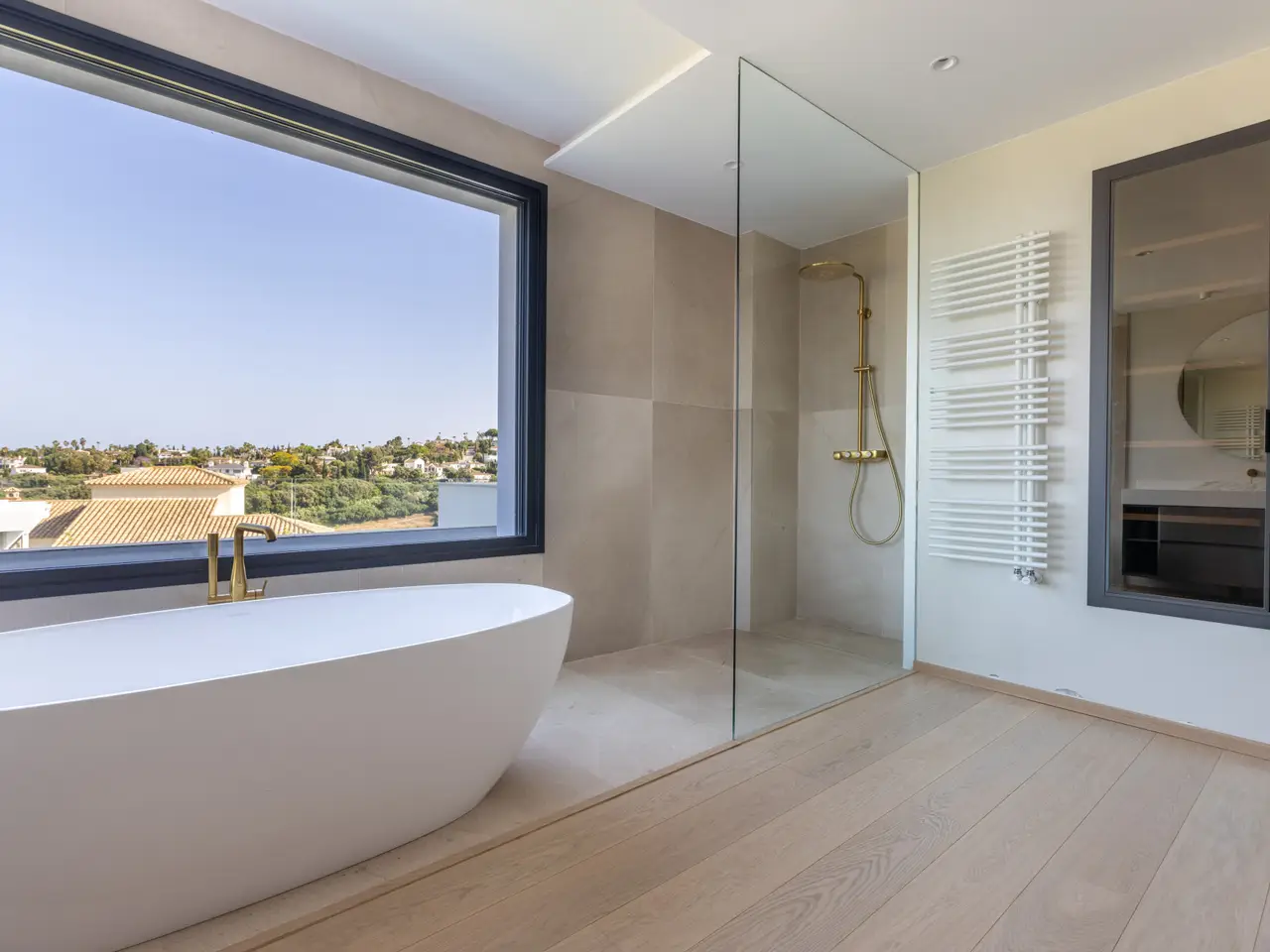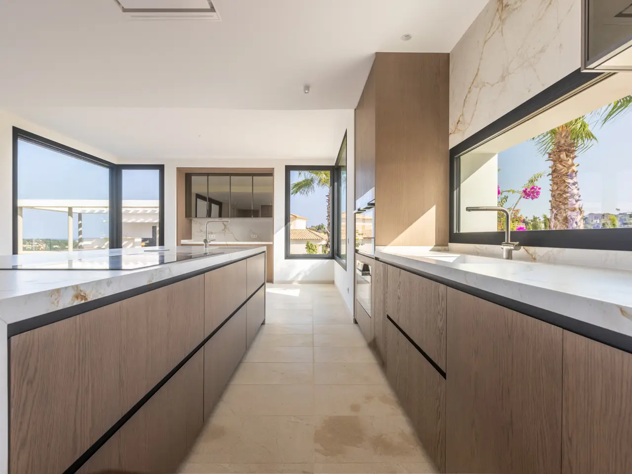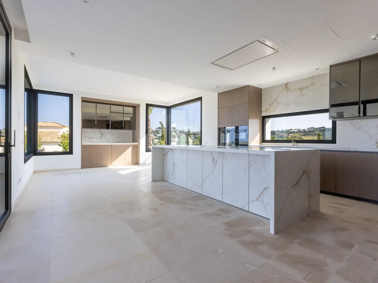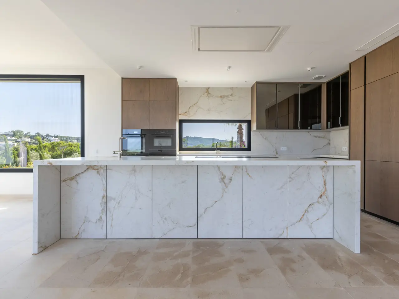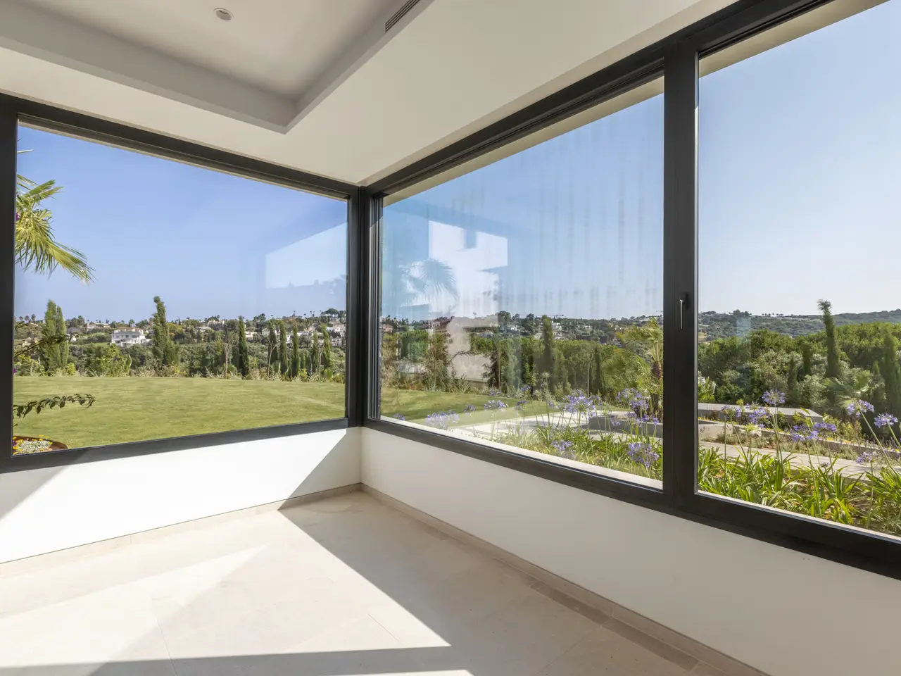 This incredible, recently built villa, located in a highly sought-after area, stands out for its spacious interiors, modern design, and spectacular panoramic views of the golf course, sea, and mountains. The villa sits on a generous 3,765 m² plot, offering a built area of 1,326 m² and an interior space of 920 m², complemented by a total of 308 m² of terraces and porches. The property features six bedrooms, seven full bathrooms, and an additional guest toilet, ensuring maximum comfort and privacy. Each room has been designed to provide brightness and spaciousness, and the property includes features such as underfloor heating throughout, air conditioning, central heating, smart home automation systems, and aerothermal technology. The layout also comprises a guest apartment, office, dressing room, main living room with fireplace, and several terraces (both covered and uncovered), including a solarium with breathtaking views. The exterior captivates with a meticulously maintained private garden, automatic irrigation system, and an impressive infinity pool that blends seamlessly with the landscape. The outdoor kitchen, fully equipped under a pergola, is ideal for enjoying barbecues and outdoor gatherings. The villa, located in a gated community with 24-hour security service, also boasts a private garage, storage room, elevator, accessible entrance for people with reduced mobility, and high-end finishes such as wooden floors and electric blinds. Thanks to its proximity to golf courses, the sea, marina, shops, schools, and all the amenities of Sotogrande, this villa represents a unique opportunity for those seeking exclusivity, privacy, and unparalleled views in one of the best residential areas of the Costa del Sol. Do not miss this opportunity and contact us for more information.