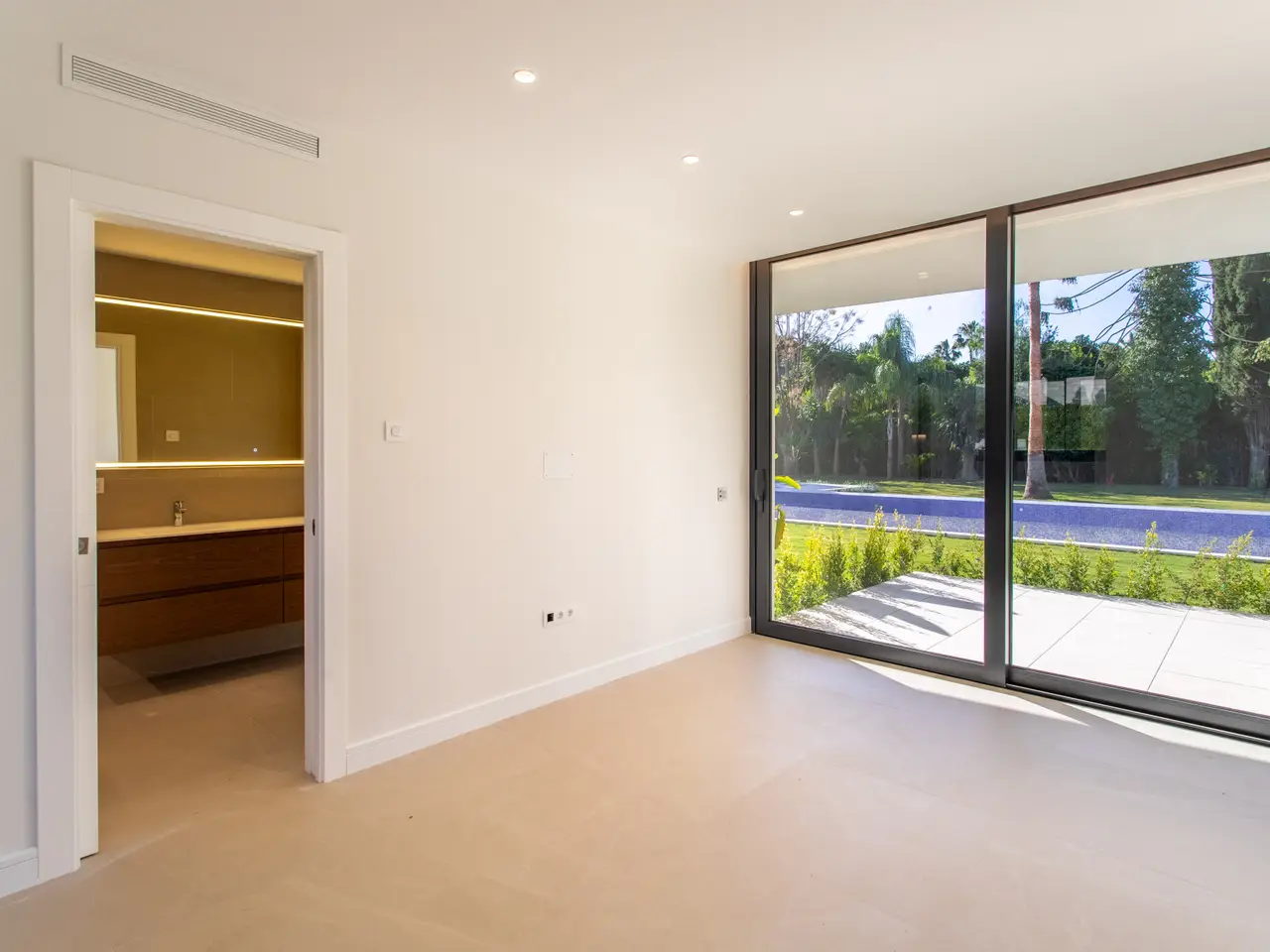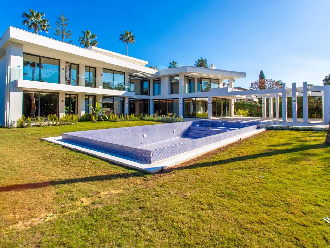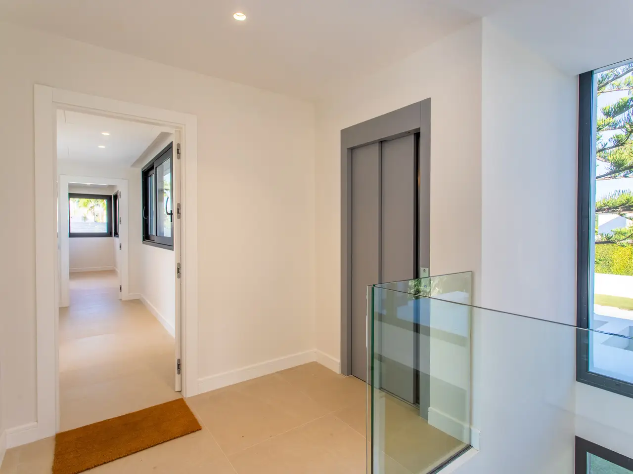Located on a plot of over 2,000 square meters in one of the most exclusive areas of Sotogrande Costa, this magnificent villa combines modern and elegant style with its vertical lines and sober colors. The house is surrounded by large windows, maximizing natural light and energy efficiency. It features 5 bedrooms, 5 bathrooms, and 2 guest toilets. The ground floor consists of a beautiful entrance hall that separates the two bedrooms, both with ensuite bathrooms, from the spacious living-dining area with an open kitchen and a fantastic island. There is also a guest toilet and an elevator connecting all floors. From the living room, you can access the garden through a lovely terrace with pergolas, perfect for enjoying unforgettable moments under the moonlight with a drink or al fresco dining, taking advantage of the excellent climate of the area. Next to this terrace, there is a 14x6m infinity pool with LED lighting, offering both a swimming area and a relaxation area with sun loungers. The pool also has pre-installation for heating, so you can enjoy a swim after a long day of work. On the first floor, you will find an impressive master bedroom with an ensuite bathroom, a dressing room, and a private sitting area. The master bedroom also has access to a covered porch with stunning views. On the other side of the first floor, there are two more bedrooms, both with ensuite bathrooms. On the next floor, there is an uncovered terrace of 150 square meters. Can you imagine it? Finally, the basement offers endless possibilities. In addition to a covered garage of almost 50 square meters, a laundry room, and a toilet, there is a spacious open area of 149 square meters that can be used as a playroom for children, additional bedrooms, a gym, a wine cellar, a spa, or a magnificent home cinema! As for the quality of the materials, this spectacular villa is equipped with a reinforced door and energy-efficient VRF air conditioning system, as well as ventilation systems with heat recovery for increased comfort and energy savings. It also has underfloor heating and an aerothermal system. The villa is pre-installed for solar panels and an electric car charging point. The kitchen is furnished and equipped by Modulnova, with appliances from the Gaggenau brand. This is the perfect villa in the perfect location. Call us to arrange a viewing!