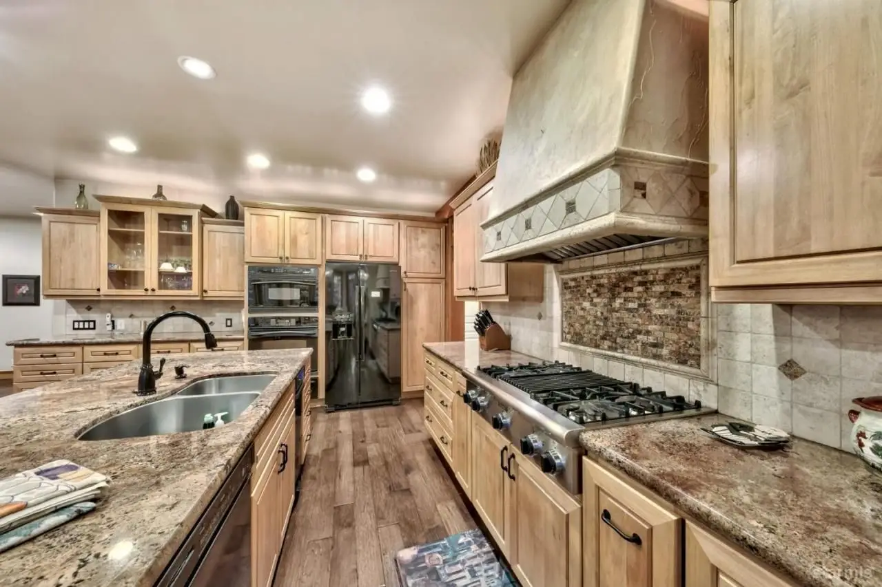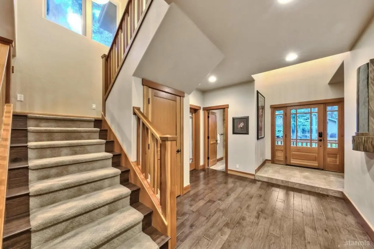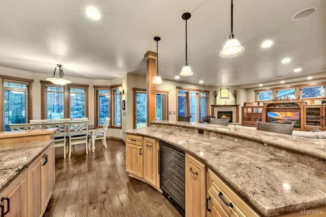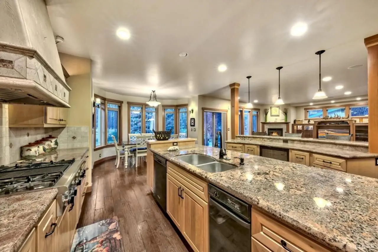 Nestled in the prestigious Montgomery Estates neighborhood, this custom-built home offers an unparalleled living experience in South Lake Tahoe. Backing onto miles of National Forest, this property provides direct access to an extensive network of hiking and biking trails, perfect for outdoor enthusiasts and nature lovers alike.The downstairs living floorplan showcases an open and inviting atmosphere. The living area boasts vertical grain Douglas fir wrapped windows, hardwood flooring, and surround sound speakers, creating a warm and inviting ambiance. A gas fireplace serves as a cozy focal point, while the beautiful forest views provide a serene backdrop.The heart of the home is undoubtedly the expansive kitchen, featuring dual islands that offer ample counter space for culinary adventures. Custom cabinets, two dishwashers, and a Thermador gas range cater to the needs of even the most discerning chef. Adjacent to the kitchen, a butler's pantry with built-in cabinets adds extra convenience and storage.Upstairs, the primary bedroom suite is a true retreat. Vaulted ceilings and a private balcony overlooking the forest create a sense of luxury and tranquility. The spa-like bathroom includes dual vanities, a tub with forest views, and a walk-in shower with dual showerheads. A spacious walk-in closet with built-in cabinets completes this opulent suite.Two additional guest rooms, one featuring a built-in desk, and a shared full bathroom provide comfortable accommodations for family or visitors. The home's thoughtful design includes an office area and conveniently located laundry room on the upper level.This property boasts high-quality finishes throughout, including custom travertine tile, hydronic in-floor heating, an alarm system, and a central vacuum system. The lushly landscaped lot creates a park-like setting, perfect for enjoying the crisp mountain air and peaceful surroundings.Fully furnished and move-in ready, this exceptional Tahoe home offers the perfect blend of luxury, comfort, and natural beauty. Don't miss the opportunity to make this your mountain retreat or year-round residence in one of South Lake Tahoe's most desirable neighborhoods.