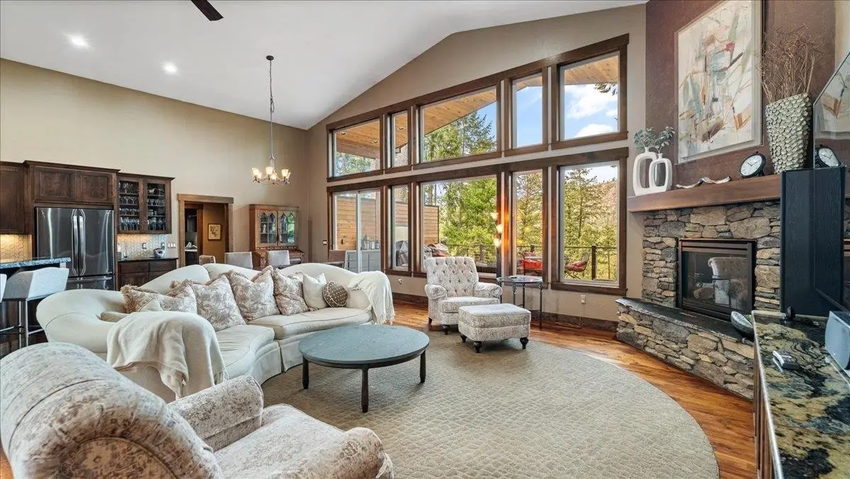 This stunning craftsman home sits adjacent to the Kalispel Golf Club with breathtaking views & main-floor living. Nestled in the exclusive Highlands community, this home features a grand great room with high vaulted ceilings, expansive windows, gas fireplace & rich walnut flooring. Step out to the spectacular tongue & groove pine covered deck showcasing territorial & fairway views. The gourmet kitchen is a chef’s dream boasting a generous center island, custom-built cabinets, granite countertops, high-end appliances & walk-in pantry. Indulge in the luxurious primary bedroom with more views, large walk-in closet & en suite bathroom with a beautiful opulent shower, dual sinks & vanity area. Also on main level is a guest bedroom & bath with soaking tub/shower combo & high countertops. A mudroom & laundry area add practicality to the home's design. Daylight walk-out lower level has 3 more bedrooms and bath. Don't miss your chance to own this exceptional home-a mere 3 min golf cart ride to the course!
