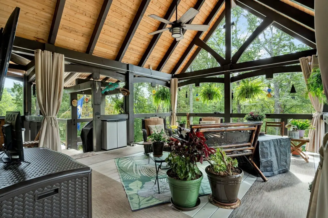 Welcome to your mountain-top oasis! This exceptional property encompasses over 15 acres spanning two mountains, offering unmatched privacy, year-round creek frontage, and stunning long-range views. Built just two years ago with natural dried spruce, this custom retreat blends high-end finishes with rustic mountain charm. The 2-bedroom, 2-bath home showcases an open floor plan with soaring tongue-and-groove pine cathedral ceilings and expansive Pella Impervia windows and doors that frame the breathtaking scenery. Each bedroom includes its own en-suite bathroom with Pfister fixtures and heatilators. The kitchen features quartz countertops and custom hickory cabinetry, while the living area is highlighted by a custom 42-inch wood-burning fireplace, set in one-piece leathered black granite and crowned with a black walnut mantle. Outdoor living is at its best with a wrap-around covered porch designed to double as an additional living space. Outfitted with TV and stereo wiring and custom weather curtains, it offers year-round enjoyment. Underneath deck is an unfinished basement, perfect for more storage area. Landscaped walkways, waterfalls, and garden areas and a fire pit complete the serene, spa-like atmosphere.Also included is a one bedroom/one bath guest house, large wired tool room, underground electricity, gated driveway entry, and a surround security system. Multiple cleared building sites provide opportunities for expansion. The property also qualifies for a greenbelt tax exemption, making it a smart investment as well as a peaceful retreat.Whether you're searching for a full-time residence, private getaway, or an investment rental this mountain-top sanctuary is truly one-of-a-kind.Schedule your private showing today and experience the beauty, privacy, and craftsmanship this property has to offer. Seller is offering home furnished or unfurnished. Please see below for more detailed information. Exterior Hardie board siding with lifetime warranty35-year architectural shingle roof for lasting durabilityCustom weather curtains enclosing the entire exterior deck2x6 exterior walls for added strength and efficiencyR60 foam insulation for superior energy savingsSolid wood interior doors throughoutInterior trim crafted from natural beetle board for unique character50-gallon high-efficiency water heater26-inch concrete slab foundation for stabilitySecurity system for peace of mindSolar generator backup power solutionFully decked attic providing additional storage space