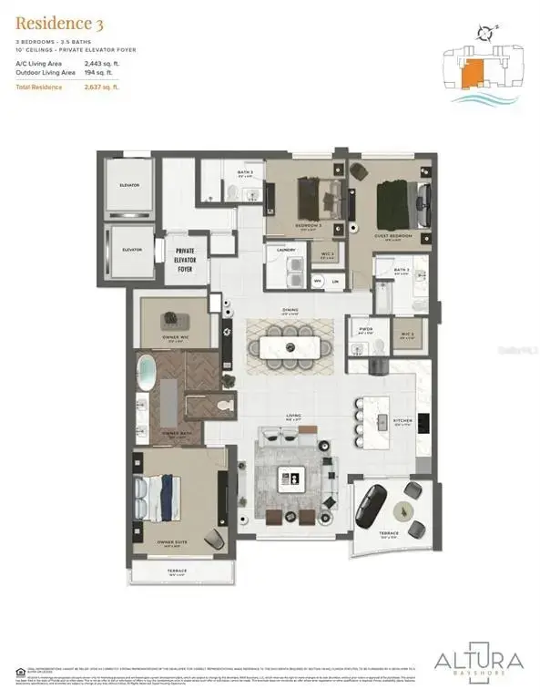 One or more photo(s) has been virtually staged. One or more photo(s) has been virtually staged. COMPLETED IN 2024 - READY FOR IMMEDIATE OCCUPANCY. Welcome to ALTURA Bayshore, an unprecedented new condominium living experience with resort-style amenities rising above Hillsborough Bay and iconic Bayshore Boulevard. This 3 Bedroom, 3.5 Bath residence features 2,443 SF plus two covered terraces, private elevator foyer, impact glass, high ceilings, 2 parking spaces, storage unit, and an open floor plan perfect for entertaining. This is ALTURA's last remaining Developer-owned opportunity - ***BUYER HAS OPPORTUNITY TO SELECT FLOORING & CABINET HARDWARE AT CONTRACT*** The gourmet kitchen features a large island with seating and includes many fine upgrades: countertops, cabinetry, paneled gourmet GAGGENAU appliances including a wine chiller and induction range (gas available). The Owner’s Suite has direct Bay views, private terrace, spacious walk-in closet and spa-like bath. 2 additional bedrooms with en suite baths, powder bath and laundry room complete the living space. See floor plan in photos. In addition to a 24-hour Front Desk, ALTURA boasts two distinct amenity levels; The rooftop features: a large pool with lap lane and sun shelf, shade cabanas and lounges, bar & grill area, private club room with gas fireplace, sunset viewing terrace, fire pits, casual seating, large bar, and flat screen tv’s for the ultimate entertaining experience. The 4th level offers: Fitness center with bay views, 2 guest suites, putting green, firepit, 2 fun pickleball courts, half-court basketball, bocce courts and a dedicated dog park with shade pavilion. ALTURA Bayshore sets the standard for luxury, maintenance-free living in this prime South Tampa location, central to all the best entertainment and restaurants in Tampa. Fine dining options 1-3 blocks away include: Barcelona, CounterCulture, Pane Rustica, Yoko Sushi, and many more! Enjoy a stroll along the Bayshore Trail, upscale shopping & dining in nearby Hyde Park Village, or a night out on South Howard Avenue - ALTURA's prime location has it all!