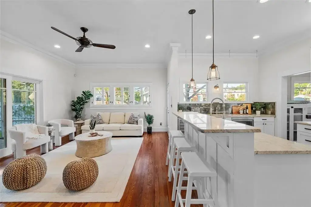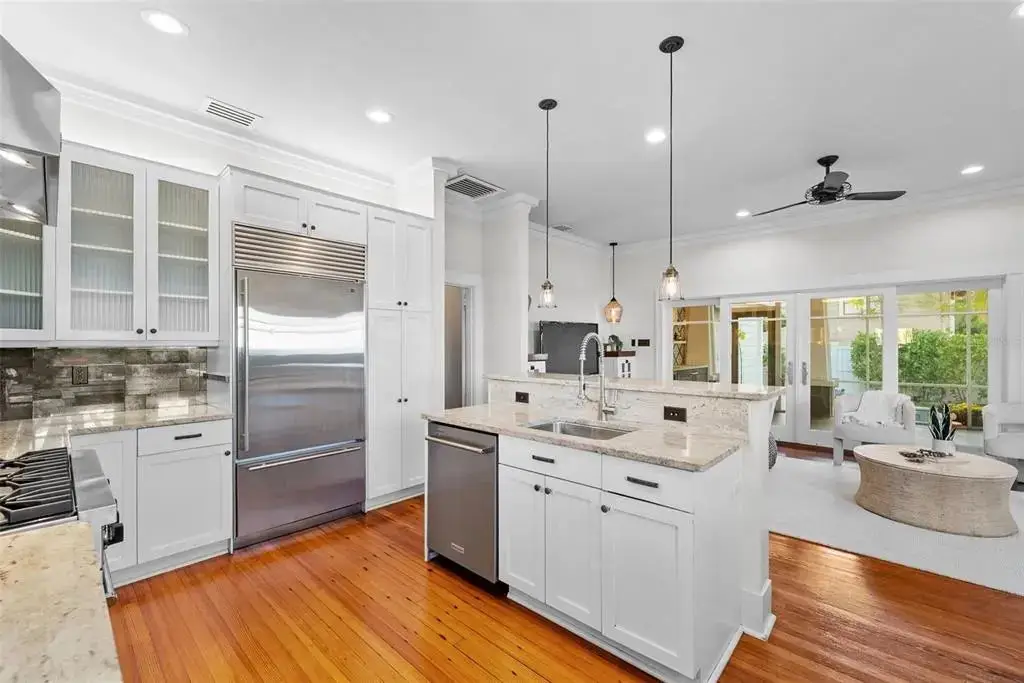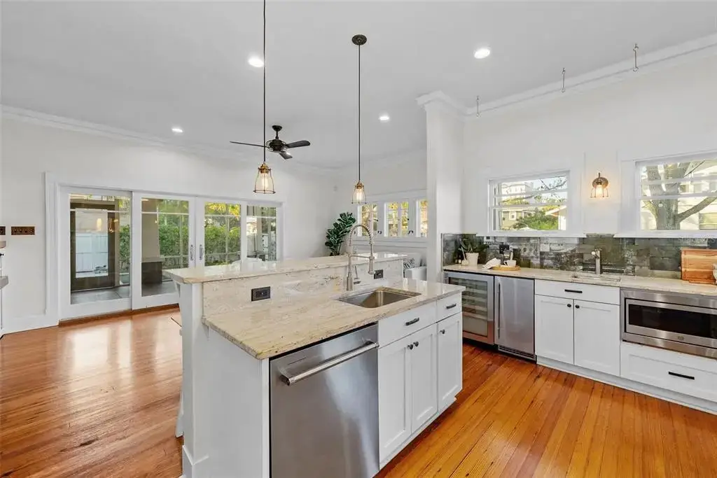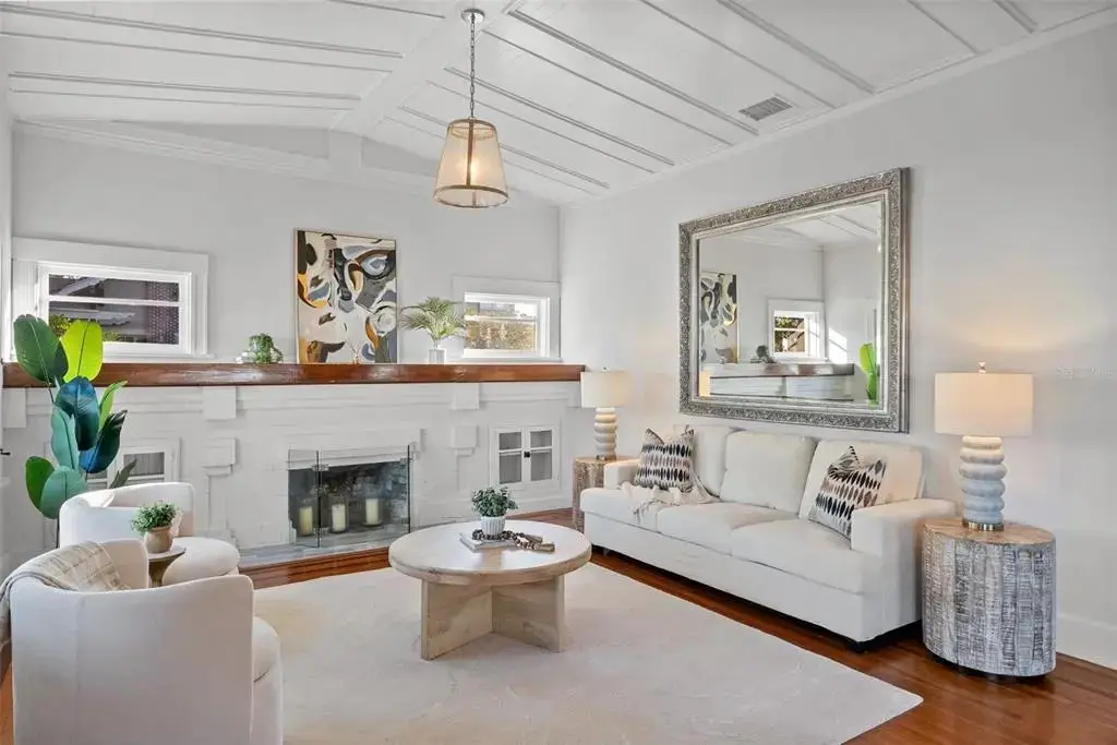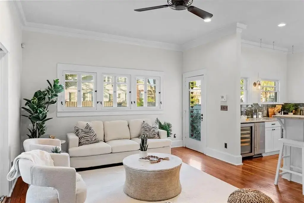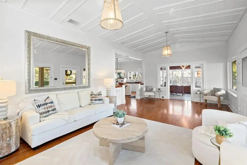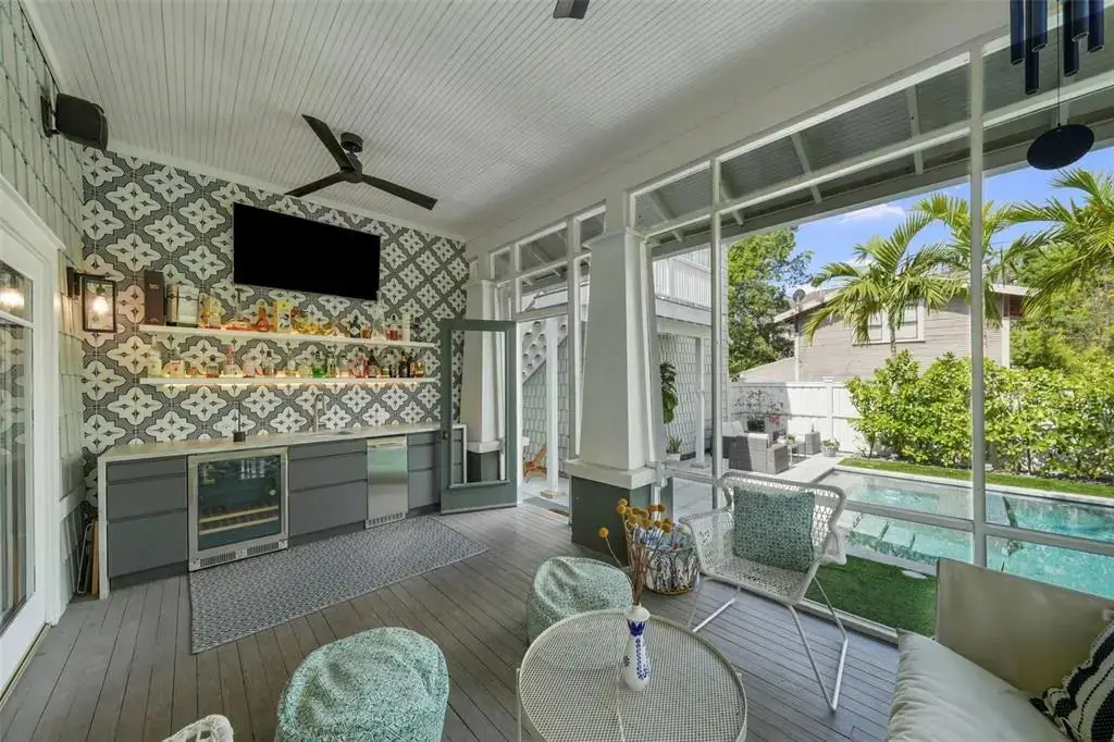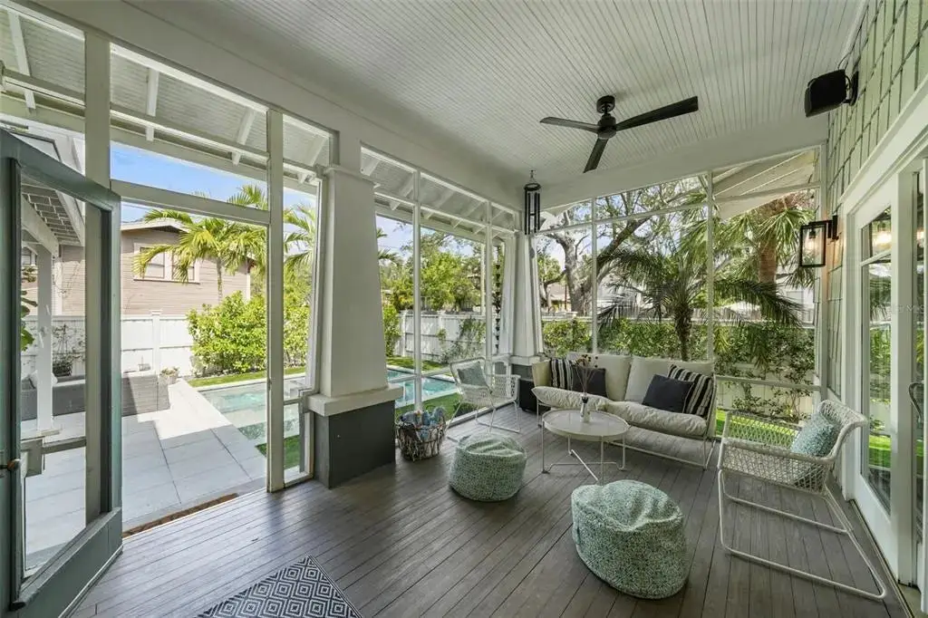 Welcome to 1001 South Oregon Avenue, a stunningly restored and reimagined historic bungalow nestled on a coveted corner lot in the heart of Tampa’s most prestigious neighborhood—Hyde Park Village. Offering the perfect blend of classic charm and contemporary luxury, this five-bedroom, four-bath residence is a rare architectural jewel with panoramic views of the Bay and effortless access to the neighborhood’s premier dining, boutique shopping, and entertainment. From the moment you arrive, the expansive front porch invites you into a home where craftsmanship, elegance, and thoughtful design meet. Step through the historic wood front door into a light-filled interior curated by renowned designer Thomas Lamb, where smooth plaster walls, a soft neutral palette, and refined finishes offer a fresh, timeless canvas anchored by the home’s original architectural details. Soaring vaulted ceilings, an original wood-burning fireplace, and rich millwork nod to the home’s historic roots, while custom upgrades—including a corner sunroom/office with built-ins and natural wood walls, a generous formal dining space, and a chef’s kitchen—deliver modern-day functionality. The kitchen is a showpiece in itself, featuring a Sub-Zero refrigerator, Viking range, Bosch dishwasher, wine fridge, ice maker, second prep sink, and an antique mirrored backsplash that adds a touch of old-world glamour. Designed for seamless indoor-outdoor living, the backyard retreat features a clean-lined pool and spa, lush artificial turf, a side garden with Italian gas-fired pizza oven, and a screened-in porch with a fully equipped custom wet bar—perfect for entertaining under the stars. The home’s layout offers flexibility and privacy: there are three bedrooms and two baths on the main level, two of the bedrooms share a bath and the other has its own ensuite bath. Upstairs, the primary retreat serves as a serene sanctuary with tons of natural lights and views of the bay and dual walk-in closets, a linen closet, a private laundry, and a spa-inspired bath with double vanities, a glass walk-in shower, and a freestanding soaking tub. A newly built two-car garage with abundant storage sits at the rear of the property, topped by a private guest apartment featuring its own living room, bedroom, full bath, and washer/dryer—ideal for visitors, in-laws, or an au pair. This exquisite property spans 3,458 square feet, including 2,978 SF in the main house and 480 SF in the guest apartment, and is located in the highly sought-after Gorrie, Wilson, and Plant High School districts.