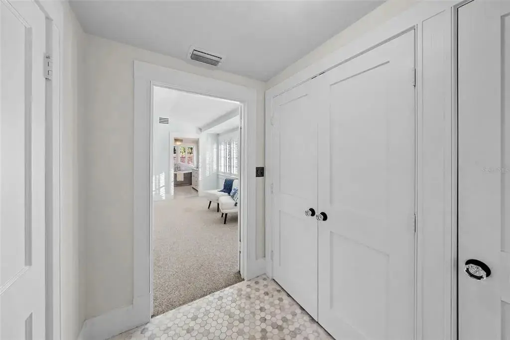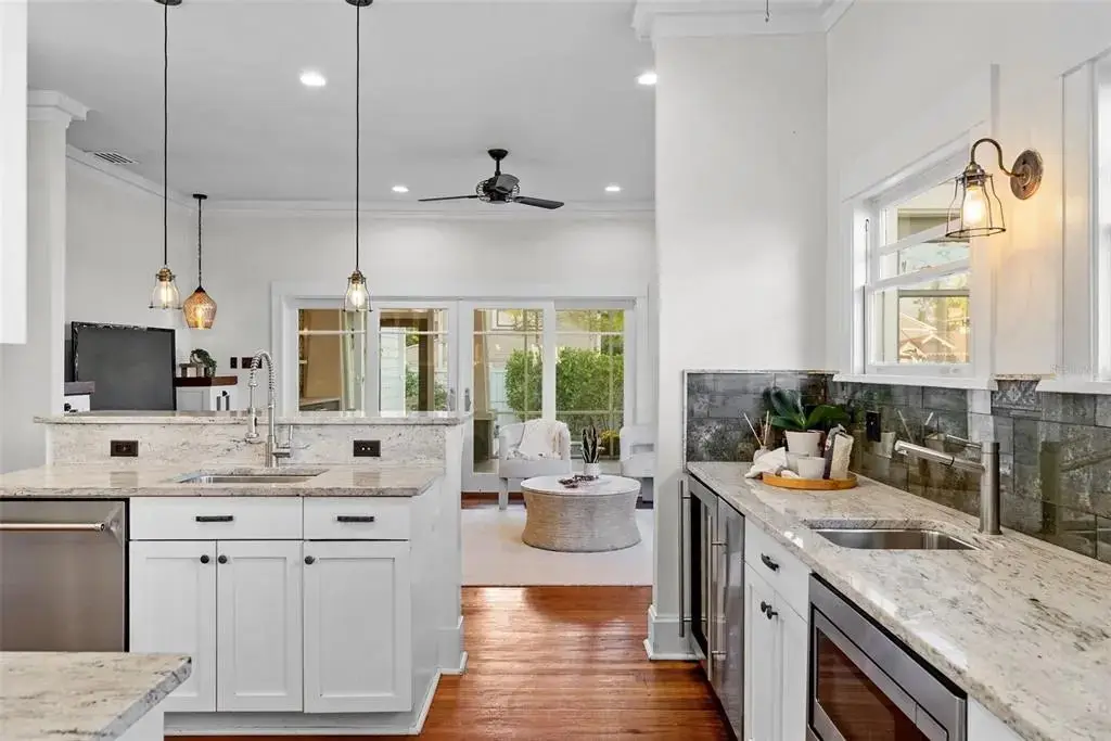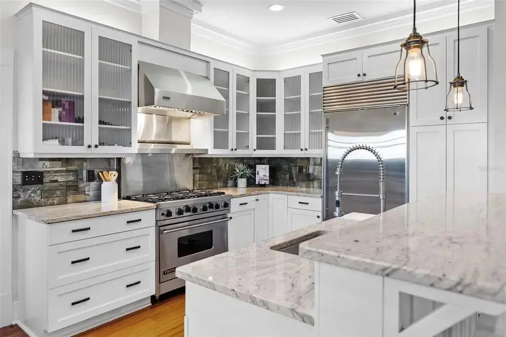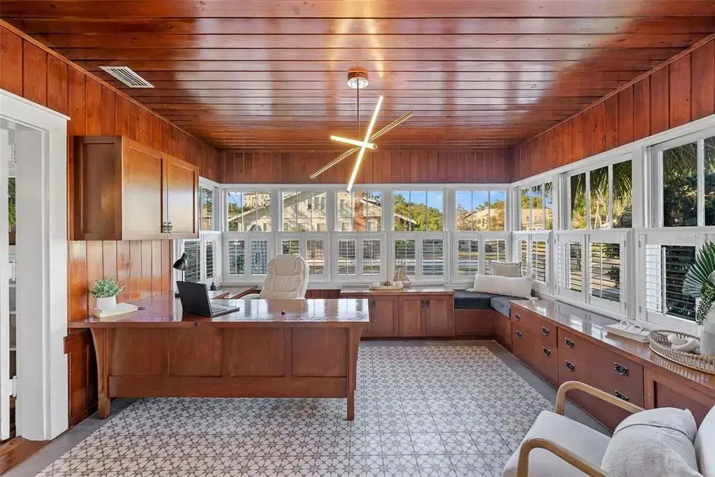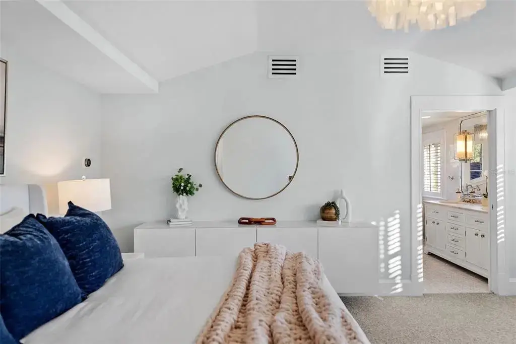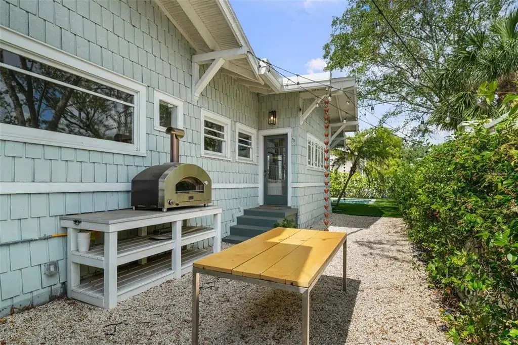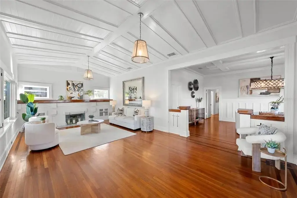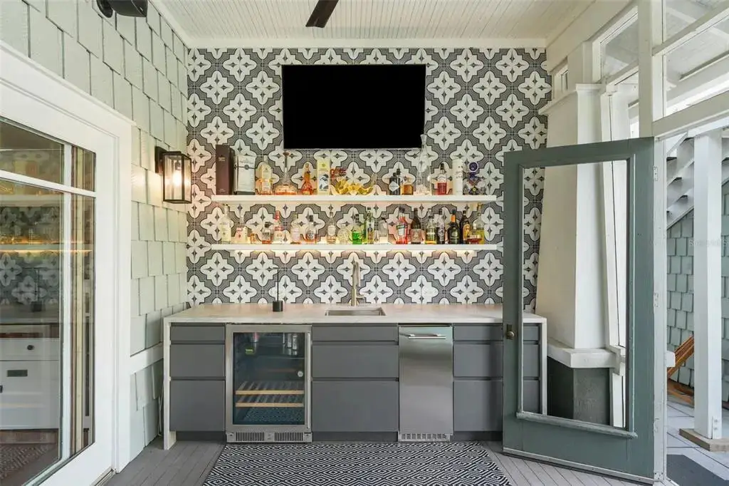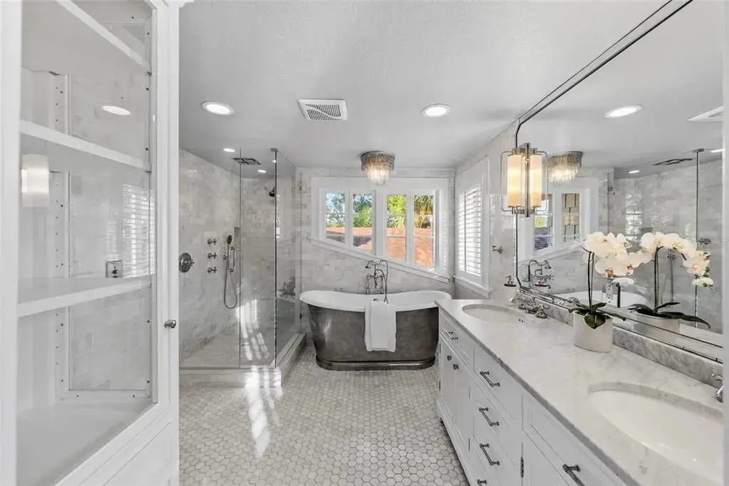 Welcome to 1001 South Oregon Avenue, a stunningly restored and reimagined historic bungalow nestled on a coveted corner lot in the heart of Tampa’s most prestigious neighborhood—Hyde Park Village. Offering the perfect blend of classic charm and contemporary luxury, this five-bedroom, four-bath residence is a rare architectural jewel with panoramic views of the Bay and effortless access to the neighborhood’s premier dining, boutique shopping, and entertainment. From the moment you arrive, the expansive front porch invites you into a home where craftsmanship, elegance, and thoughtful design meet. Step through the historic wood front door into a light-filled interior curated by renowned designer Thomas Lamb, where smooth plaster walls, a soft neutral palette, and refined finishes offer a fresh, timeless canvas anchored by the home’s original architectural details. Soaring vaulted ceilings, an original wood-burning fireplace, and rich millwork nod to the home’s historic roots, while custom upgrades—including a corner sunroom/office with built-ins and natural wood walls, a generous formal dining space, and a chef’s kitchen—deliver modern-day functionality. The kitchen is a showpiece in itself, featuring a Sub-Zero refrigerator, Viking range, Bosch dishwasher, wine fridge, ice maker, second prep sink, and an antique mirrored backsplash that adds a touch of old-world glamour. Designed for seamless indoor-outdoor living, the backyard retreat features a clean-lined pool and spa, lush artificial turf, a side garden with Italian gas-fired pizza oven, and a screened-in porch with a fully equipped custom wet bar—perfect for entertaining under the stars. The home’s layout offers flexibility and privacy: there are three bedrooms and two baths on the main level, two of the bedrooms share a bath and the other has its own ensuite bath. Upstairs, the primary retreat serves as a serene sanctuary with tons of natural lights and views of the bay and dual walk-in closets, a linen closet, a private laundry, and a spa-inspired bath with double vanities, a glass walk-in shower, and a freestanding soaking tub. A newly built two-car garage with abundant storage sits at the rear of the property, topped by a private guest apartment featuring its own living room, bedroom, full bath, and washer/dryer—ideal for visitors, in-laws, or an au pair. This exquisite property spans 3,458 square feet, including 2,978 SF in the main house and 480 SF in the guest apartment, and is located in the highly sought-after Gorrie, Wilson, and Plant High School districts.